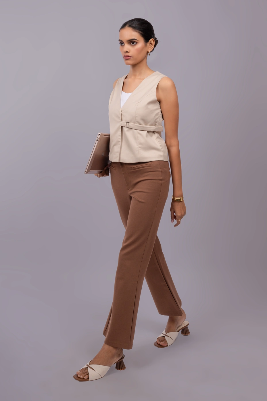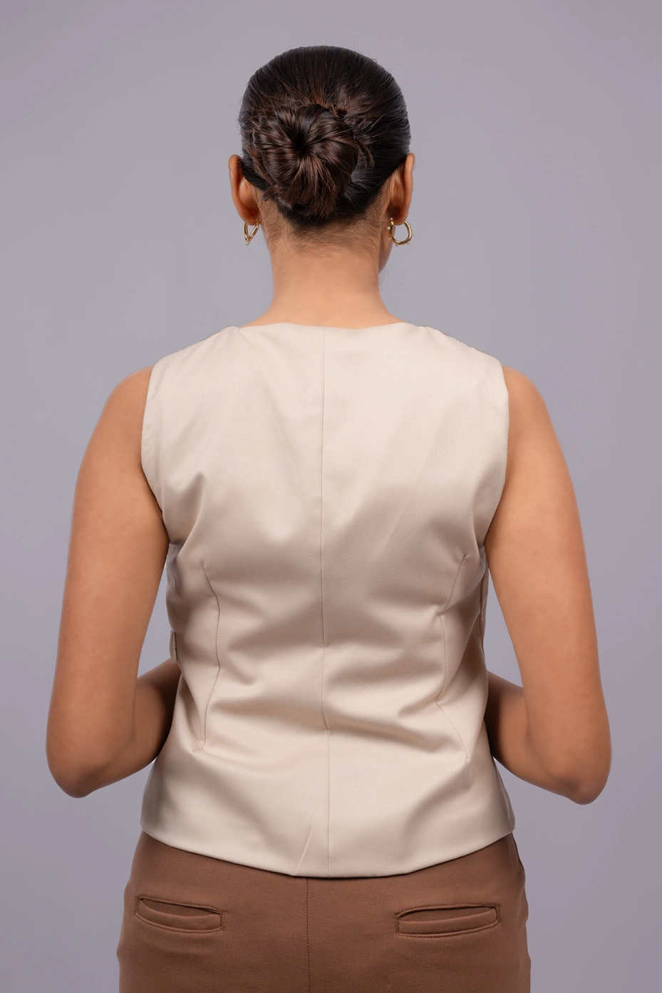 Step into your professional persona with confidence in this beige waistcoat top, designed to turn heads. Featuring a V-neckline with a button-front closure, sleeveless cut, and side buckle accents, this versatile piece blends modern tailoring with timeless charm. Crafted from premium club lycra fabric, it offers a flattering fit, comfortable stretch, and all-day ease — perfect for boardroom meetings, client presentations, or layered office looks.