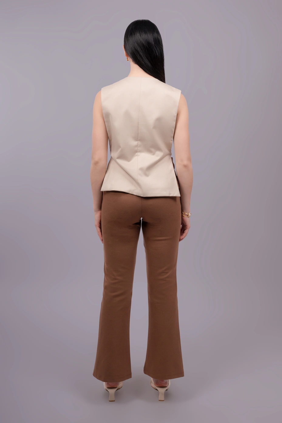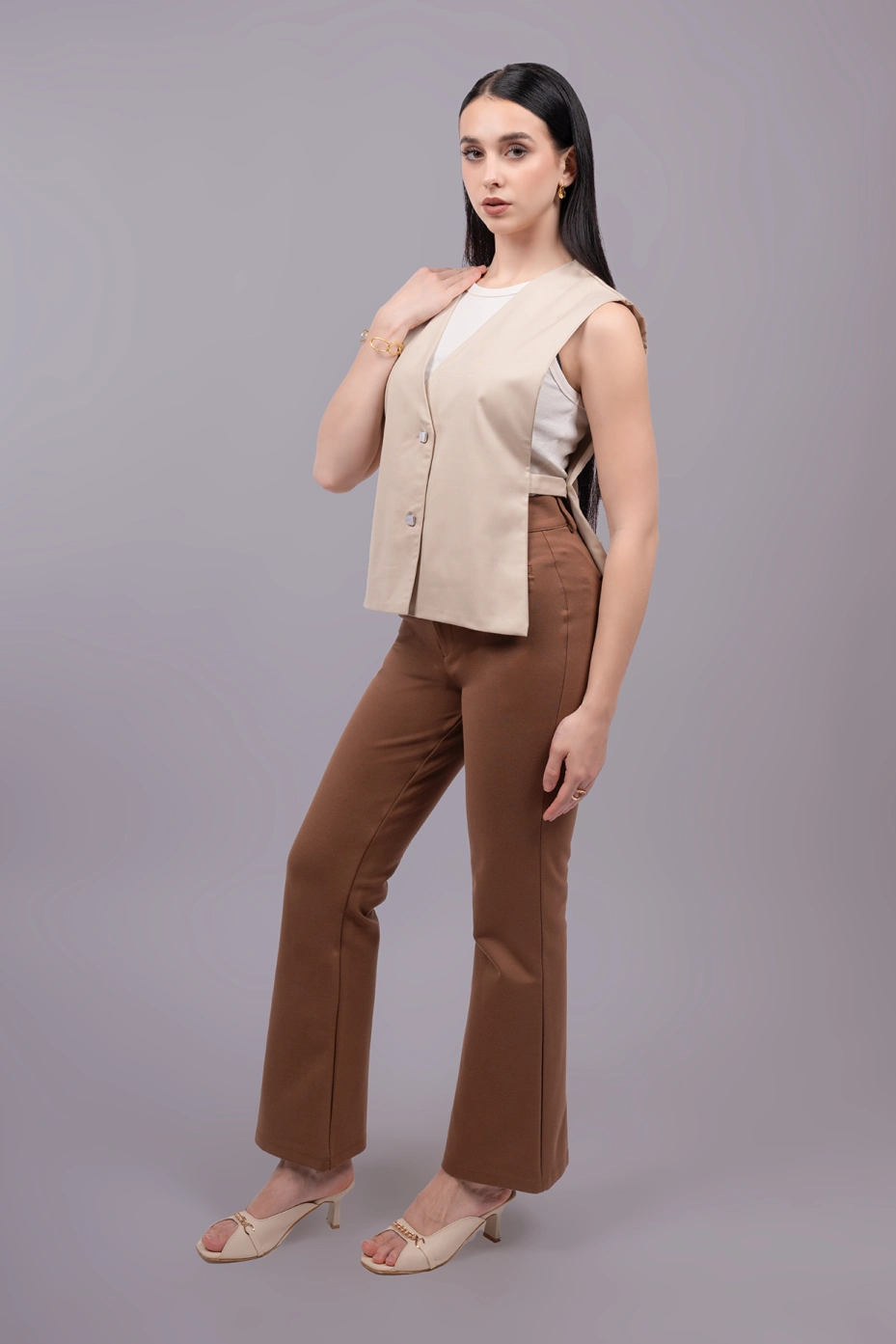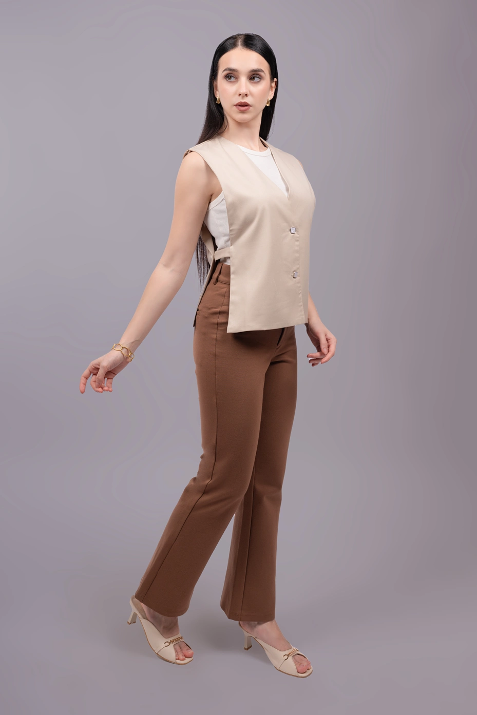 Add a refined touch to your work wardrobe with this beige waistcoat top, blending effortless elegance with modern style. Featuring a tailored V-neckline, front button closure, and sleeveless cut, it offers a clean, structured look perfect for formal meetings or smart-casual office days.The side-open buckle detail adds a contemporary twist, while the premium club lycra fabric ensures all-day comfort and a flattering fit — ideal for powering through your busy workday.