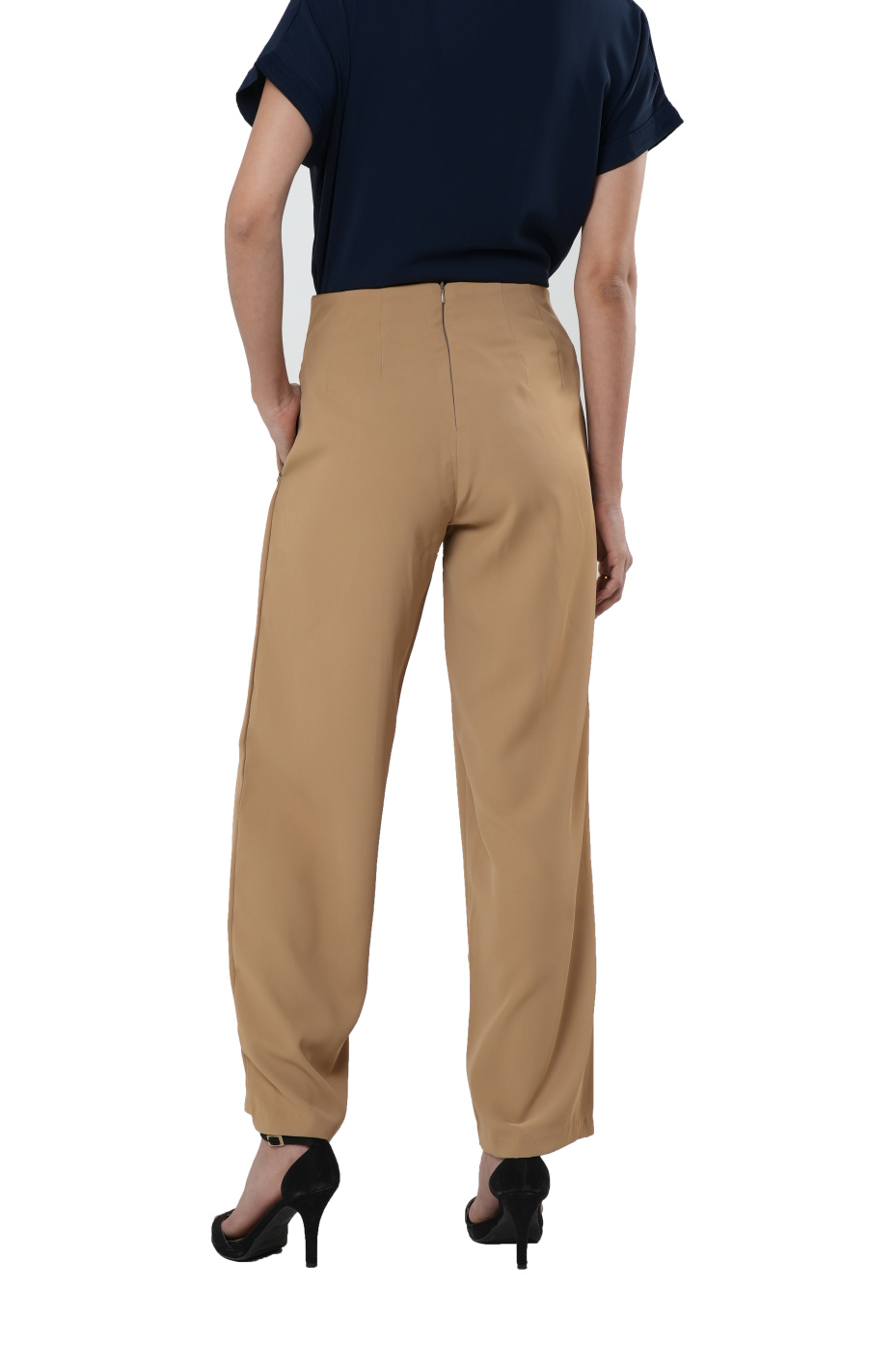 Elevate everyday corporate style with these versatile High-Rise Trousers. It features one side pocket with a concealed zip, flared fit, and long length. Made from polyester-lycra fabric, it's lightweight, durable, and anti-wrinkle. The solid brown pleated pants pair well with a dark brown shirt with white block heels gives you a neat look.