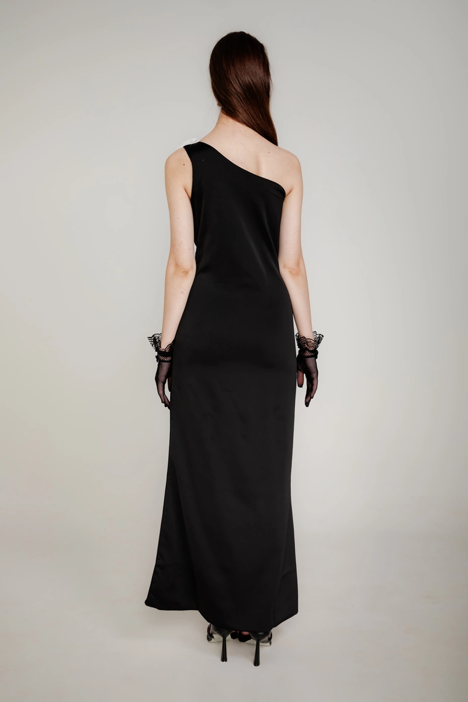 Black Corsage One-Shoulder Satin Maxi Dress
