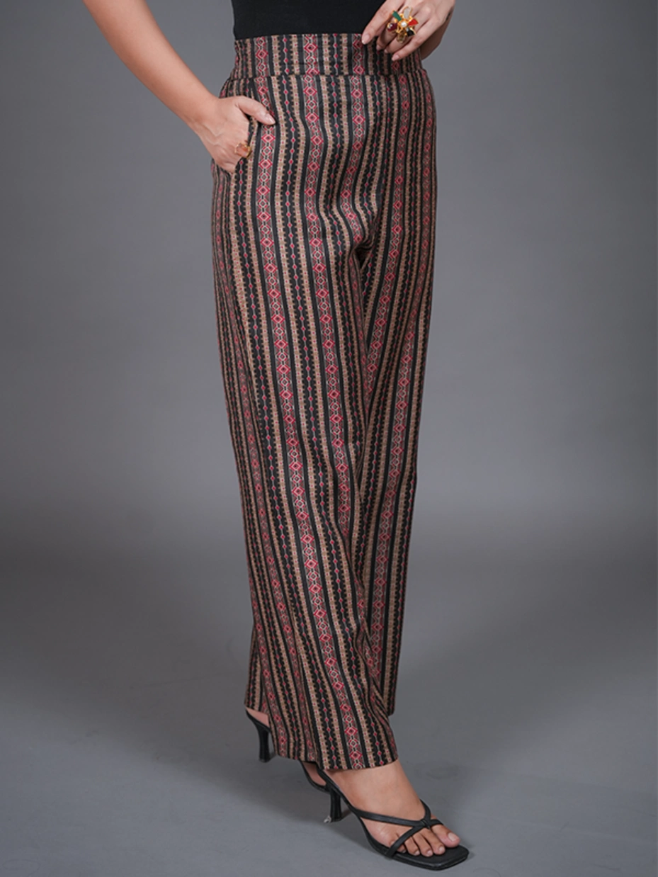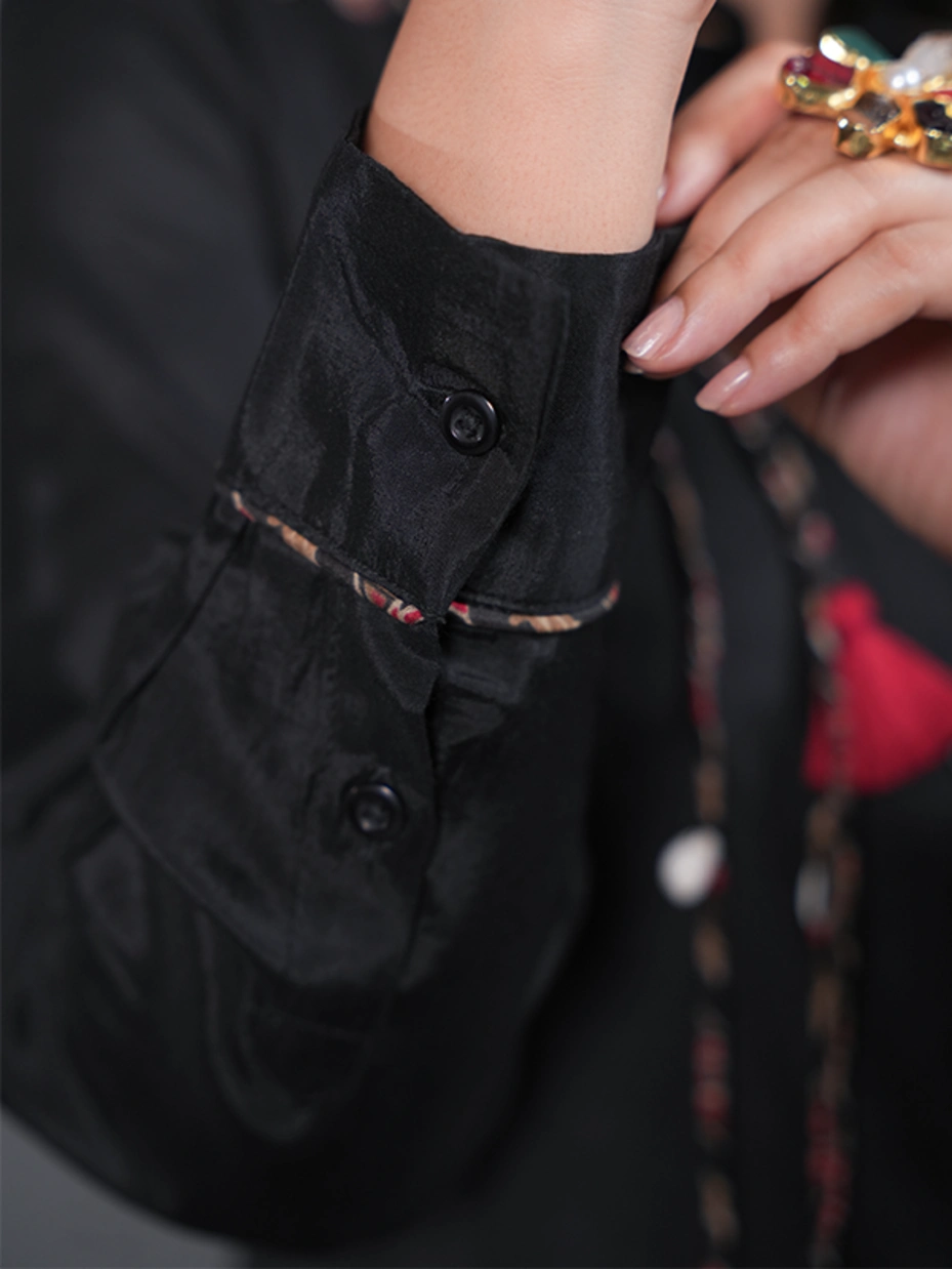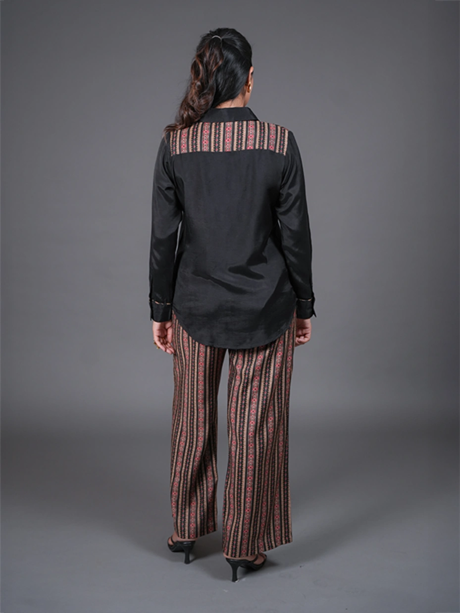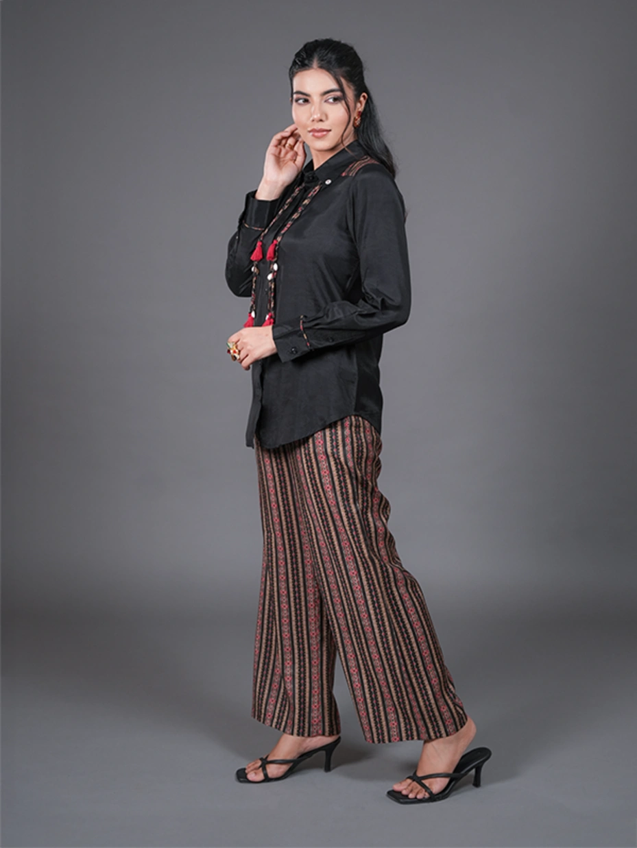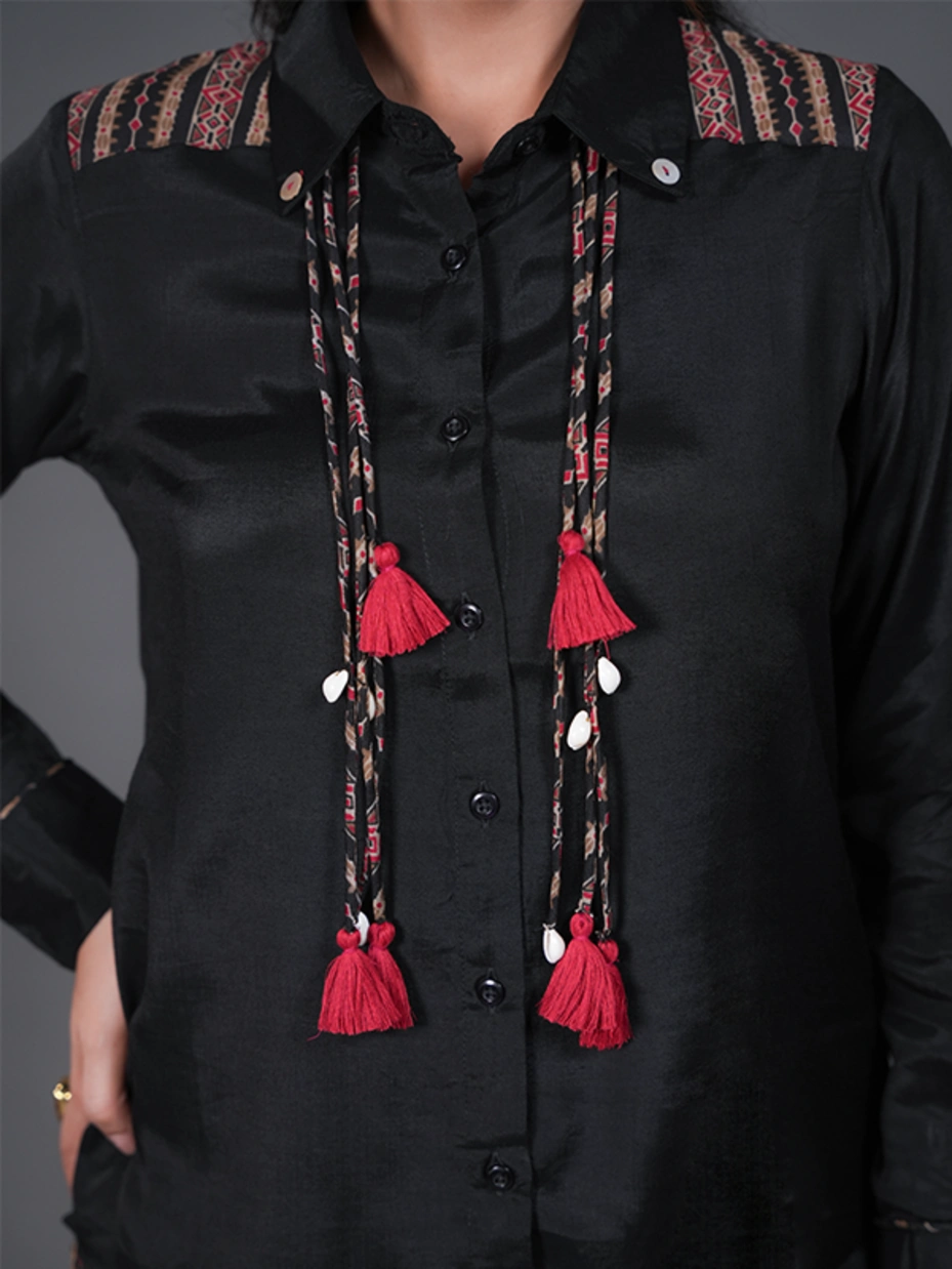 Effortlessly glide into this ethnic co-ord set for the festive season; they're versatile, elegant, and make getting dressed for the celebration facile. The co-ord set includes a shirt and pants with tassel details. The shirt features a collar neck, full sleeves, tassel highlights, and a solid black hue with patchwork at the yoke. The pant features a full stripe pattern, straight fit, and two-sided pockets. Crafted from poly cotton fabric to offer lustrous shine and all day comfort.