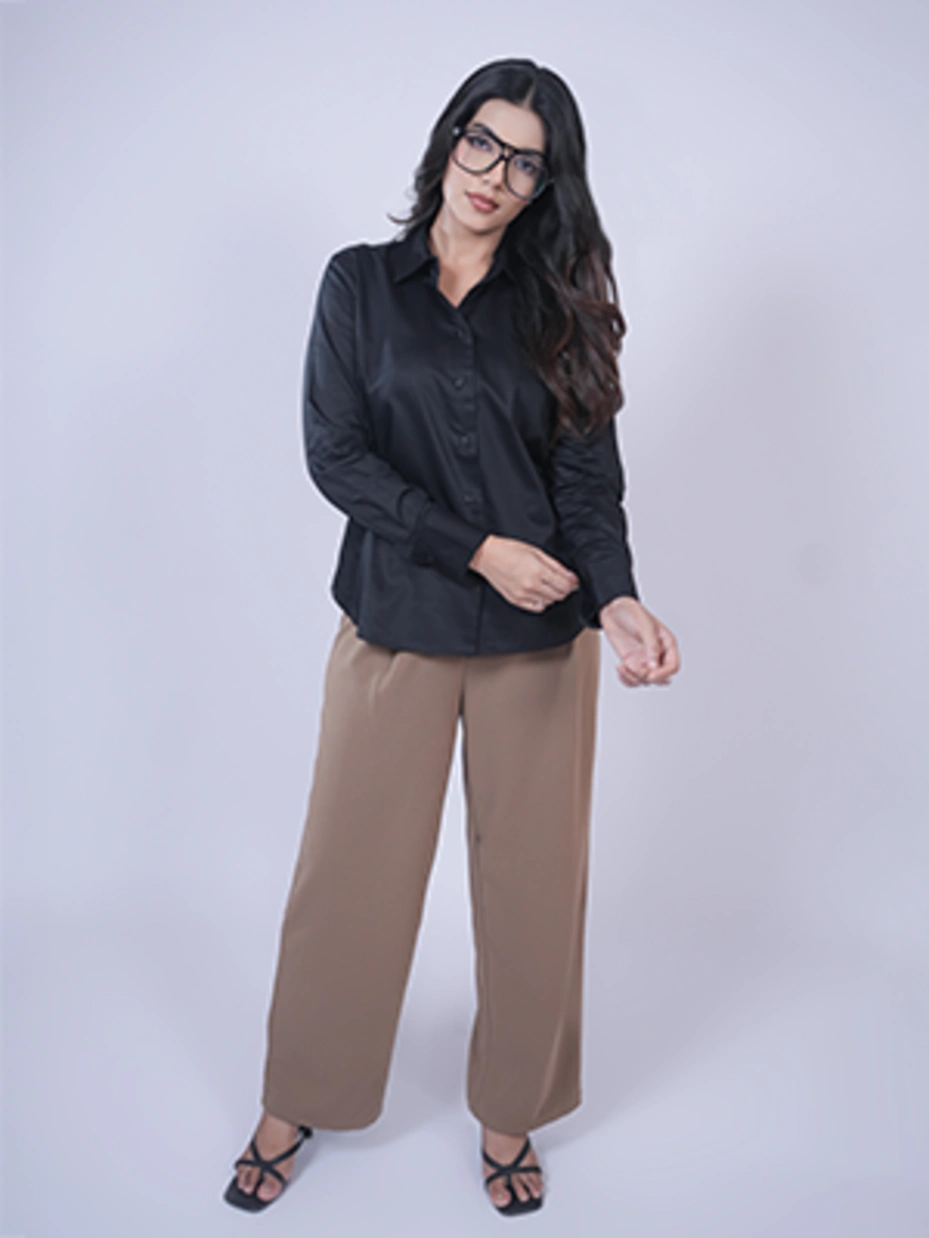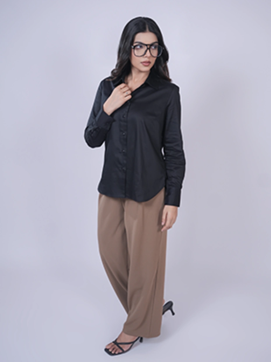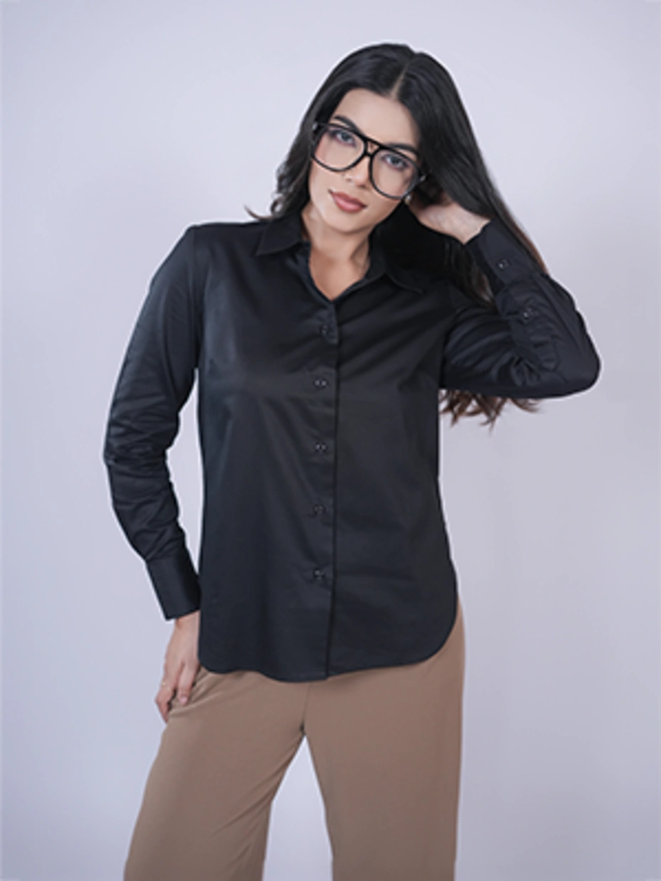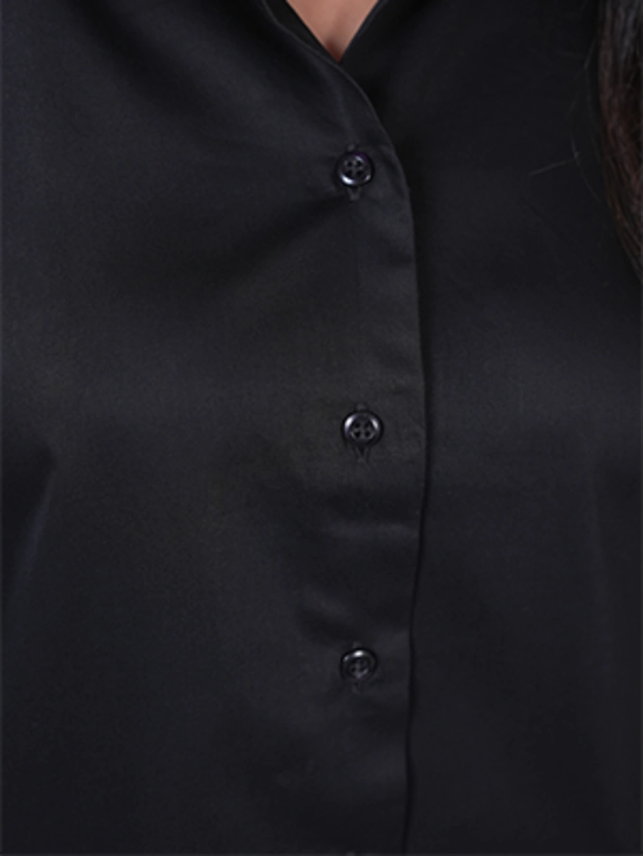 This black full-sleeve shirt will power up your look in a professional space. Featuring a collar neck, full sleeves, a front open placket, and a yoke at the back to offer a structural fit. Its shine and fit in a premium cotton-satin fabric make it a go-to choice to create a striking impression at work.