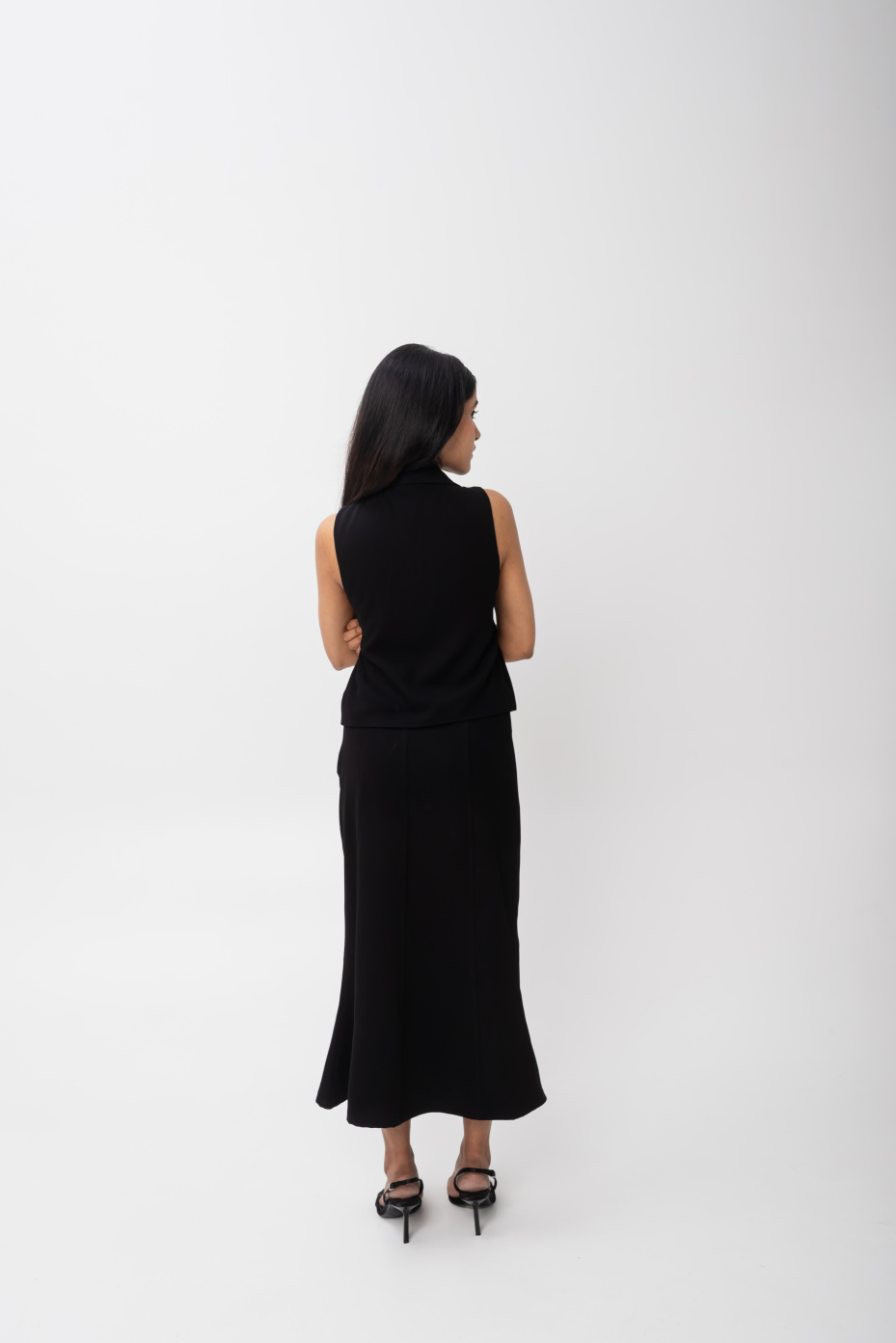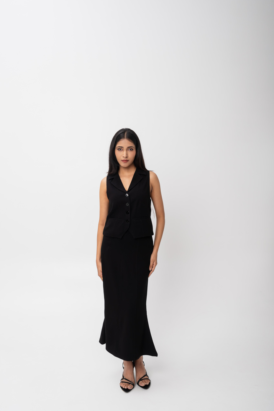 Get office-ready in this sleek and flattering black waistcoat and skirt set. The waistcoat features a notched lapel collar, twin pockets, and a sleeveless style. The skirt features a calf length fit with a mermaid style. Discover the perfect blend of comfort and style in this high-quality polyester fabric.