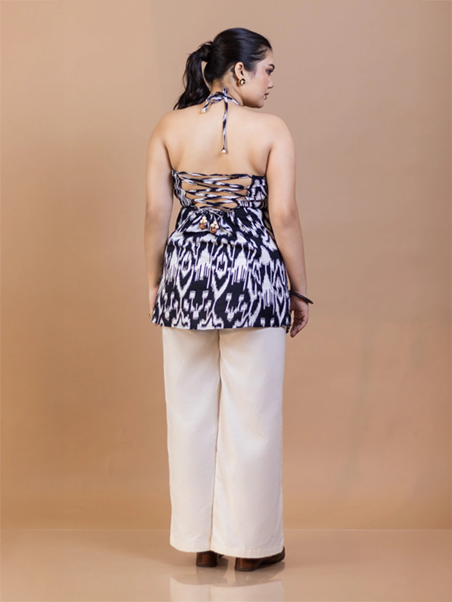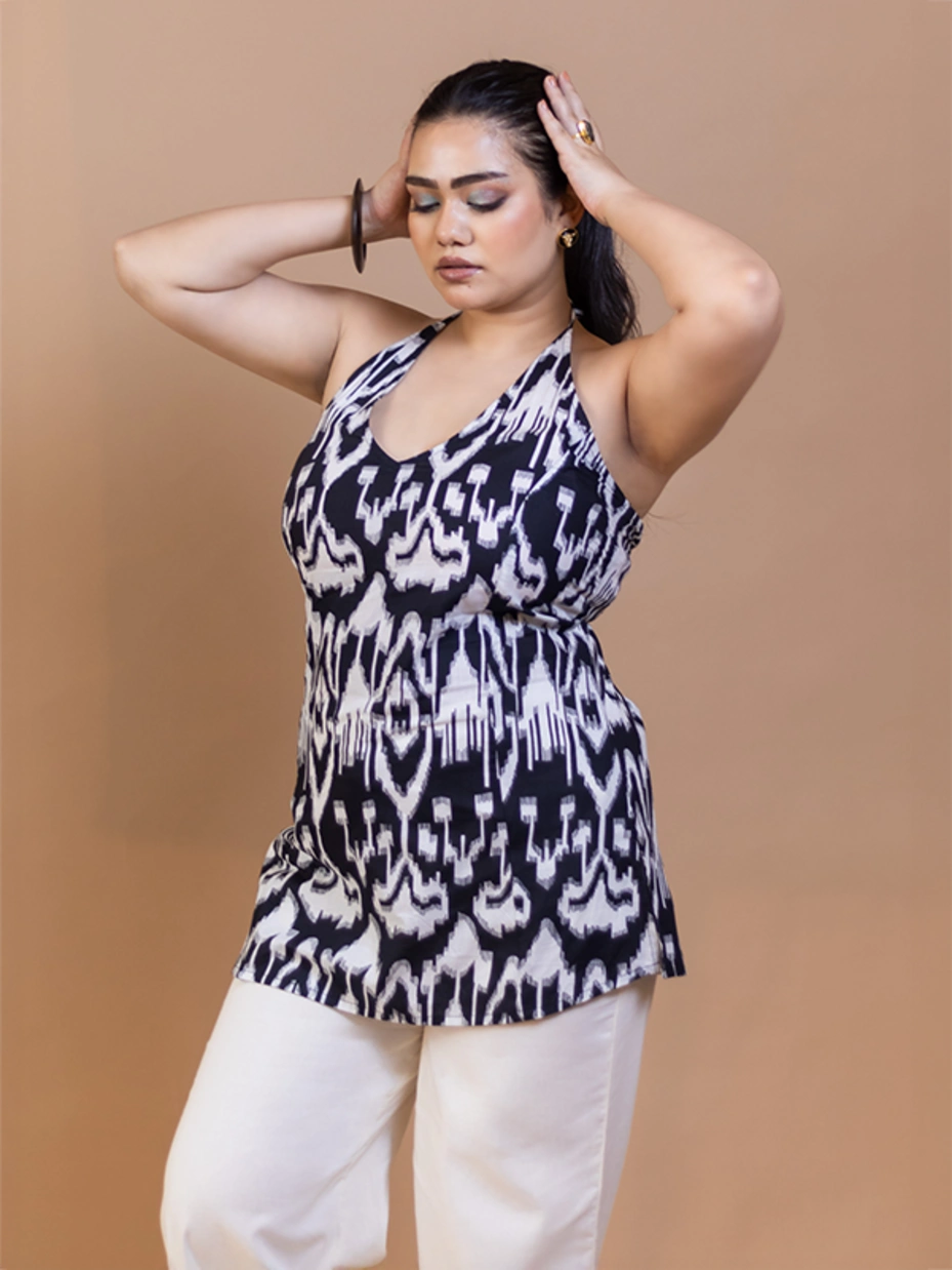 Are you ready for head-turn glam? Then, this black halter neck kurti is your go-to. It features a classic all-over Ikat print, a halter neck, and a backless shoelace tassel tie-up. Get this pure cotton kurti to offer a stylish look and comfort during get-togethers.