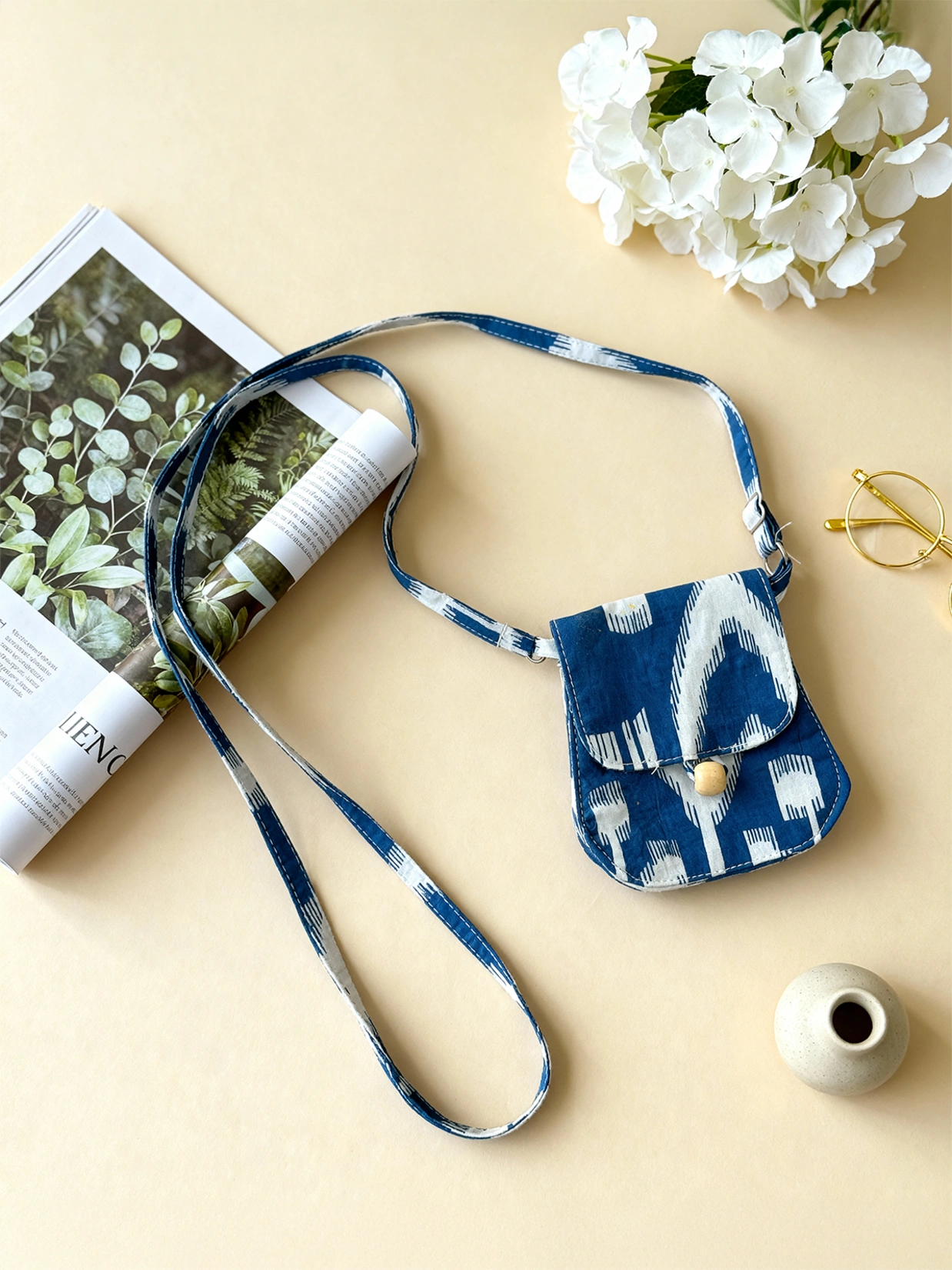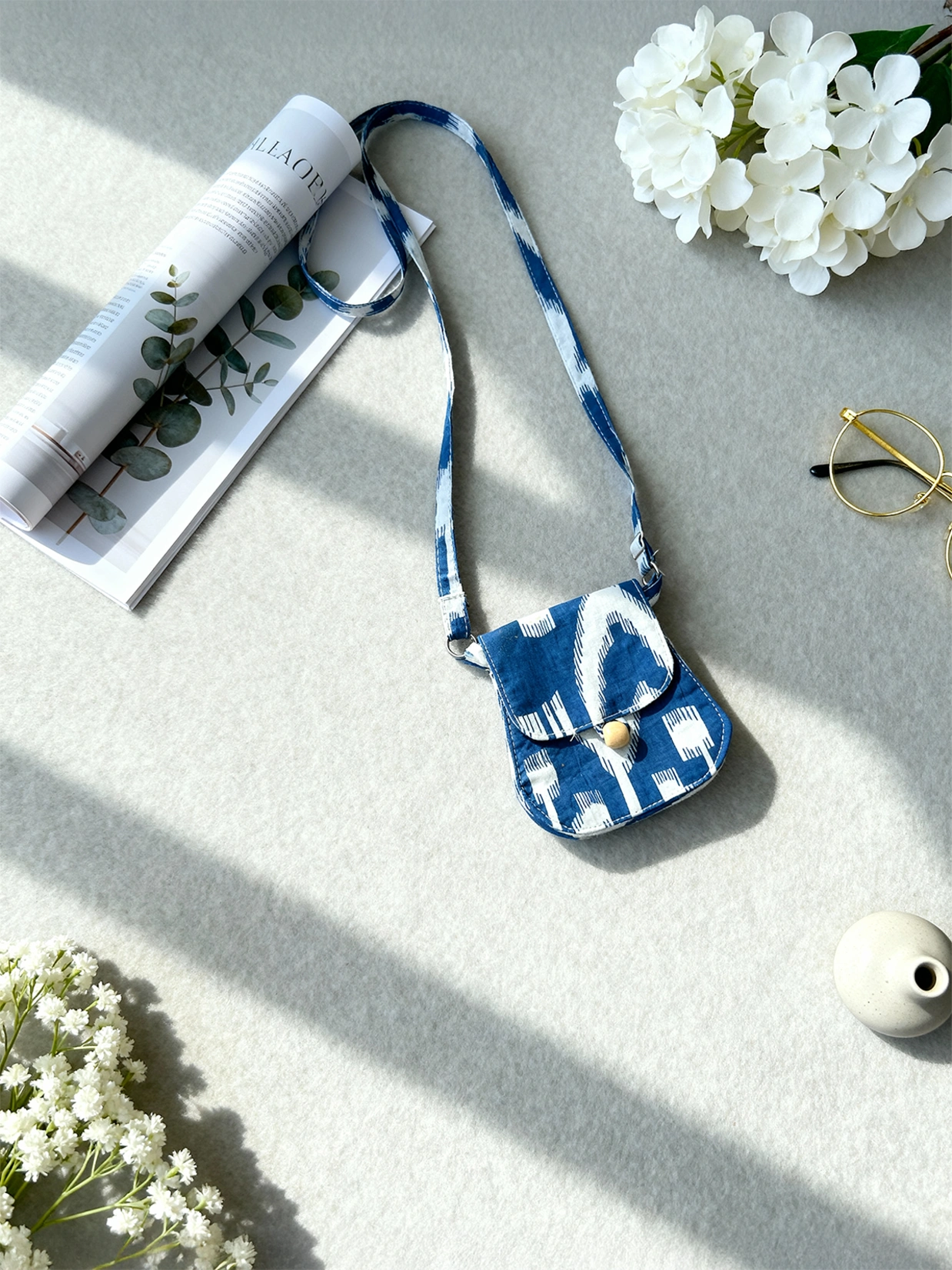 A classic way to go hands-free is with this black Ikat-printed mini sling bag. It features wooden beads, a snap button, and an adjustable sling strap. The bag is compact in size and offers ample room to fit in your keys, cash, and coins. It's an essential addition on a beach day out or during a relaxed evening walk.