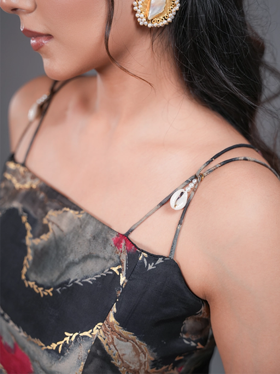 - Handbag: Pair with a gold-toned clutch, metallic potli, or a sequinned box bag to mirror the foil detailing.