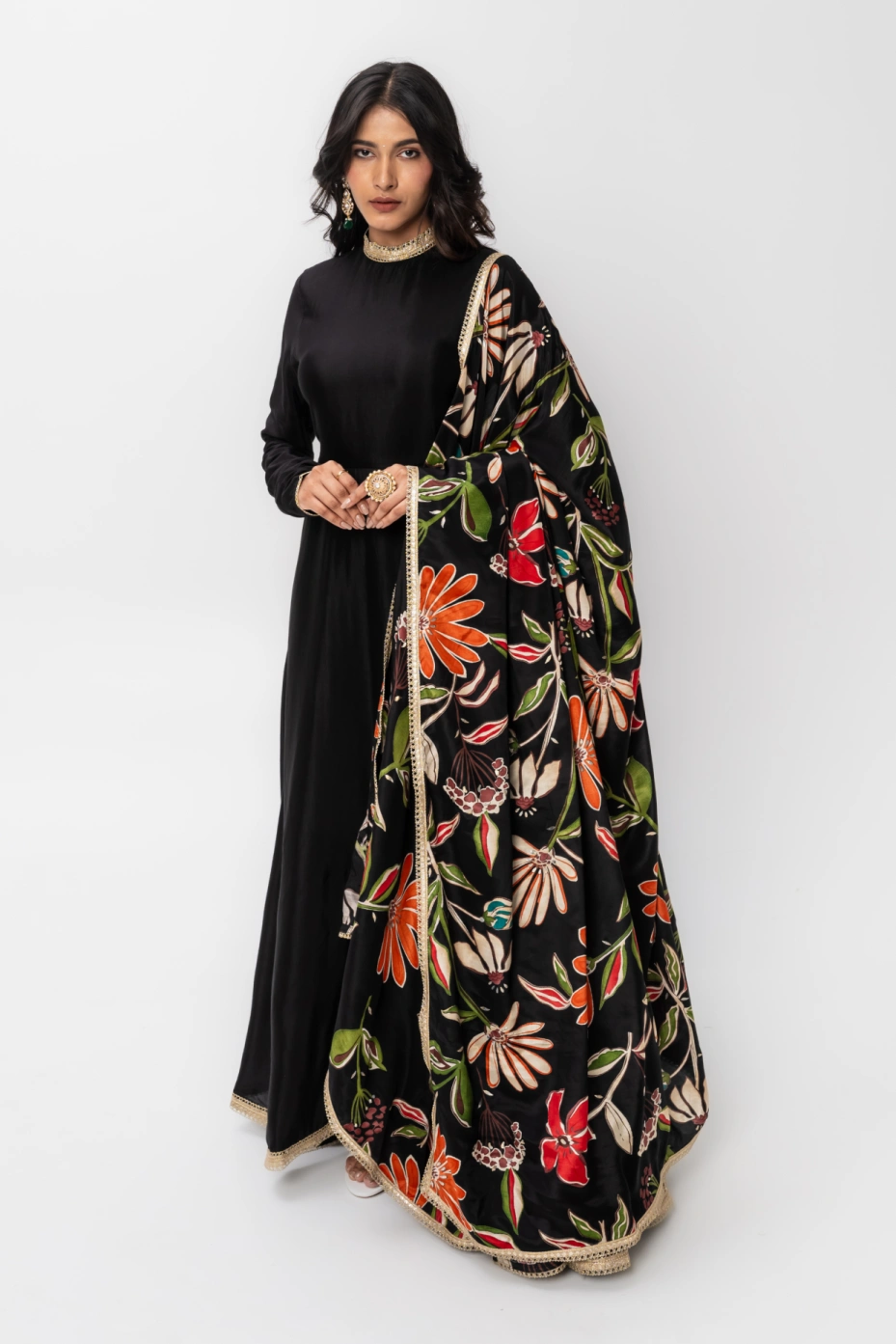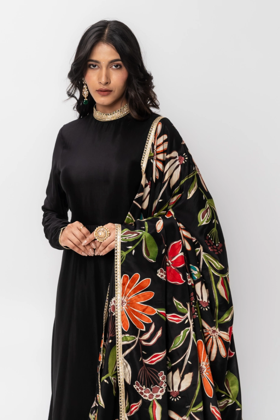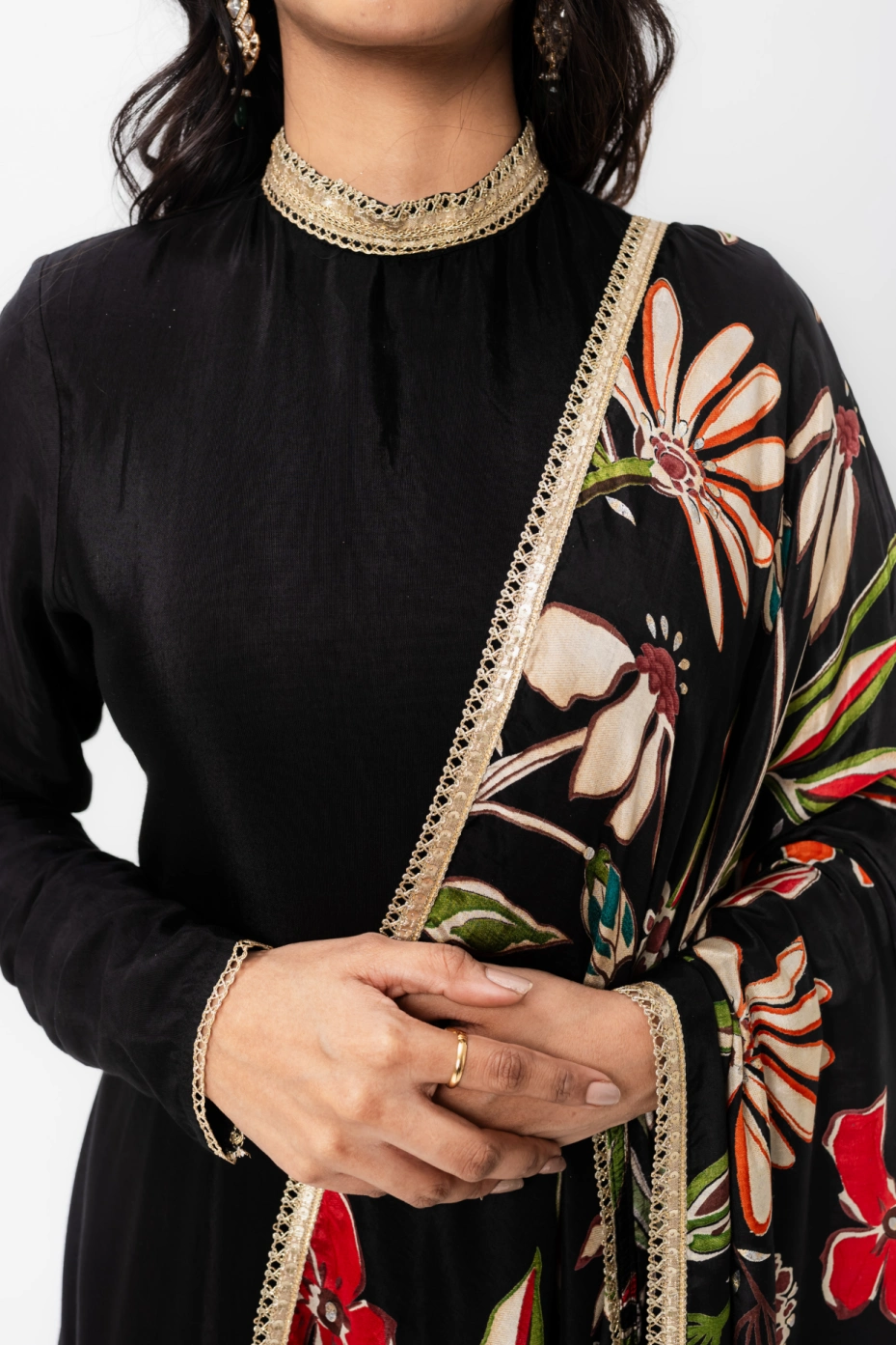 Black Long Anarkali Dress With Floral Printed Dupatta