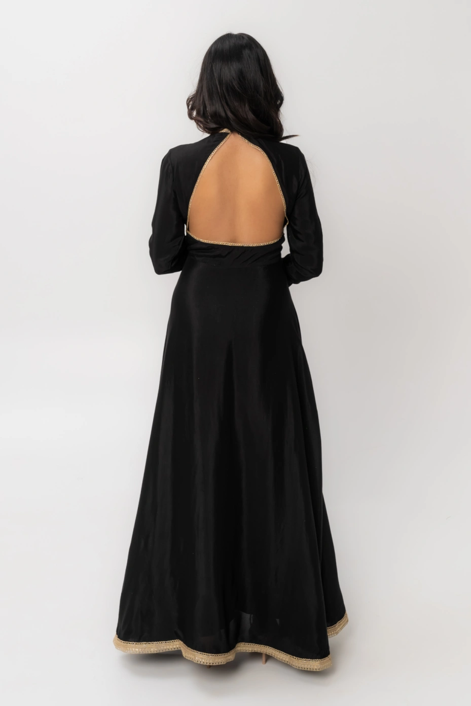 Turn heads this festive season with our backless Anarkali dress with a printed dupatta. It features a backless closed round neck, full sleeves, and a flared hem with lace detailing. It comes with a complimentary floral printed dupatta. Crafted with soft fabric, it ensures lightweight, and long-lasting comfort. Steal the spotlight on any occasion by pairing the Anarkali dupatta set with a contrasting long-layered necklace, ethnic footwear, and wavy curls.