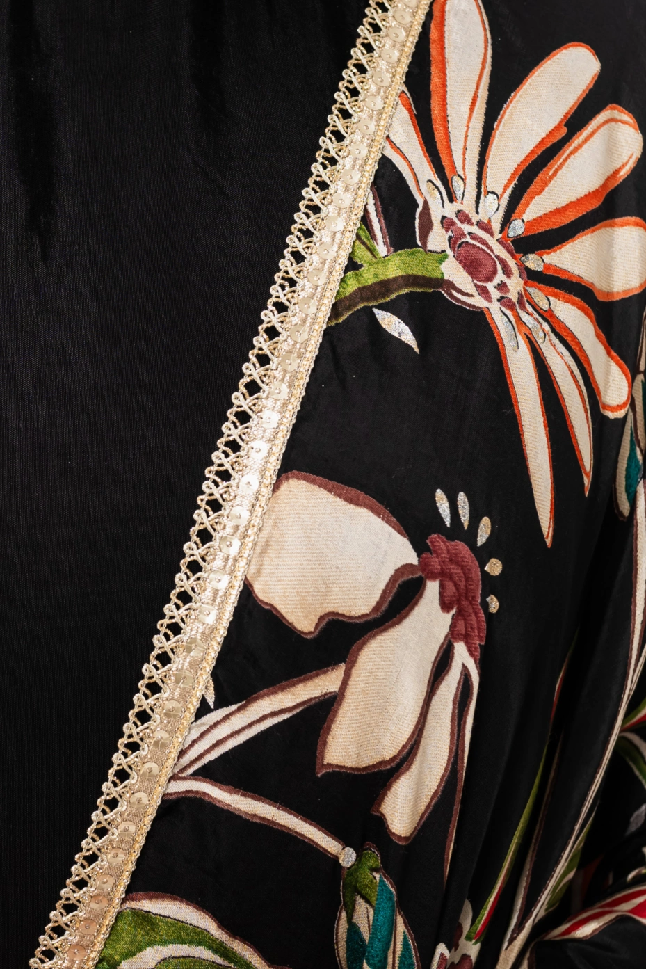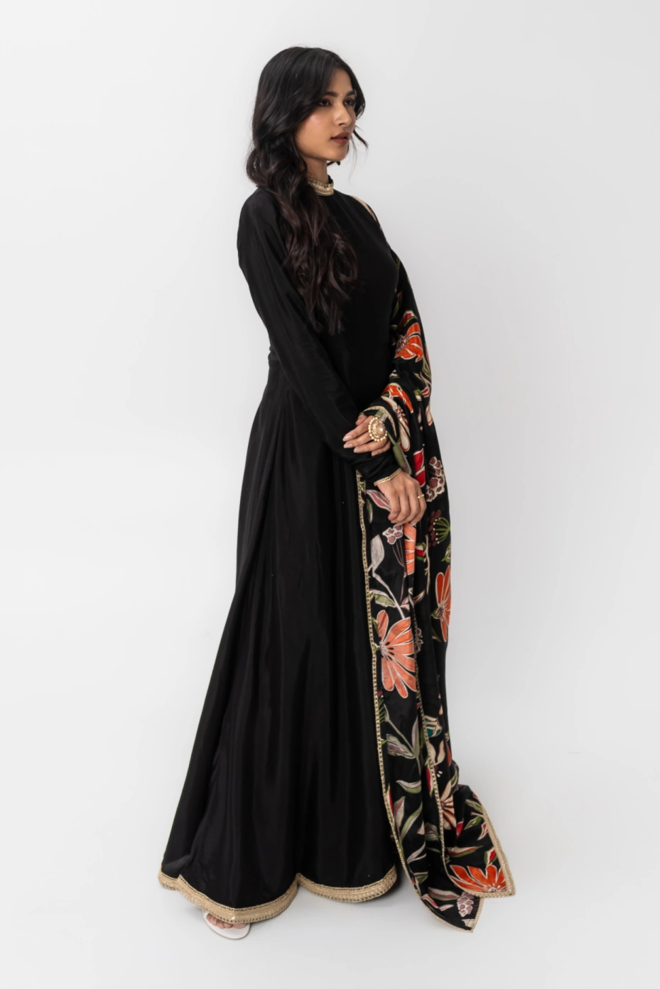 Contains | 1 x Black Anarkali Dress; 1 x Floral Print Dupatta (2 PCS)