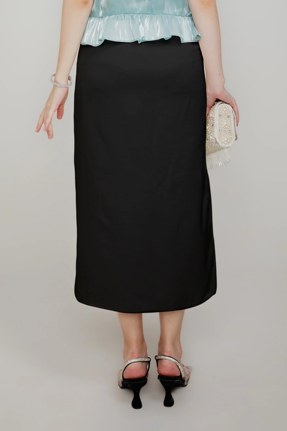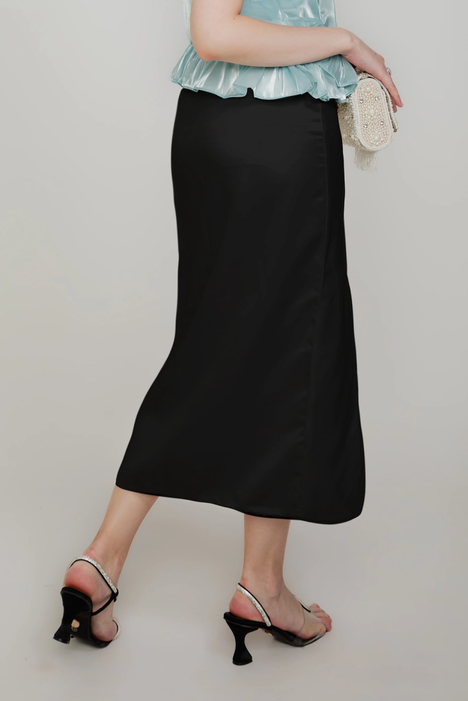 Create a flattering, and flirty look with this Black Midi Skirt, inspired by the captivating magic of the northern lights, Aurora. Featuring a gathered waist, a straight-fit silhouette, and calf length with a chic side slit, this satin skirt offers a perfect mix of elegance and allure. The Santoon lining ensures comfort, while the satin finish adds a glamorous touch to your ensemble. Whether you're heading to a party or a special occasion, this skirt is your go-to choice for a sophisticated yet playful look.