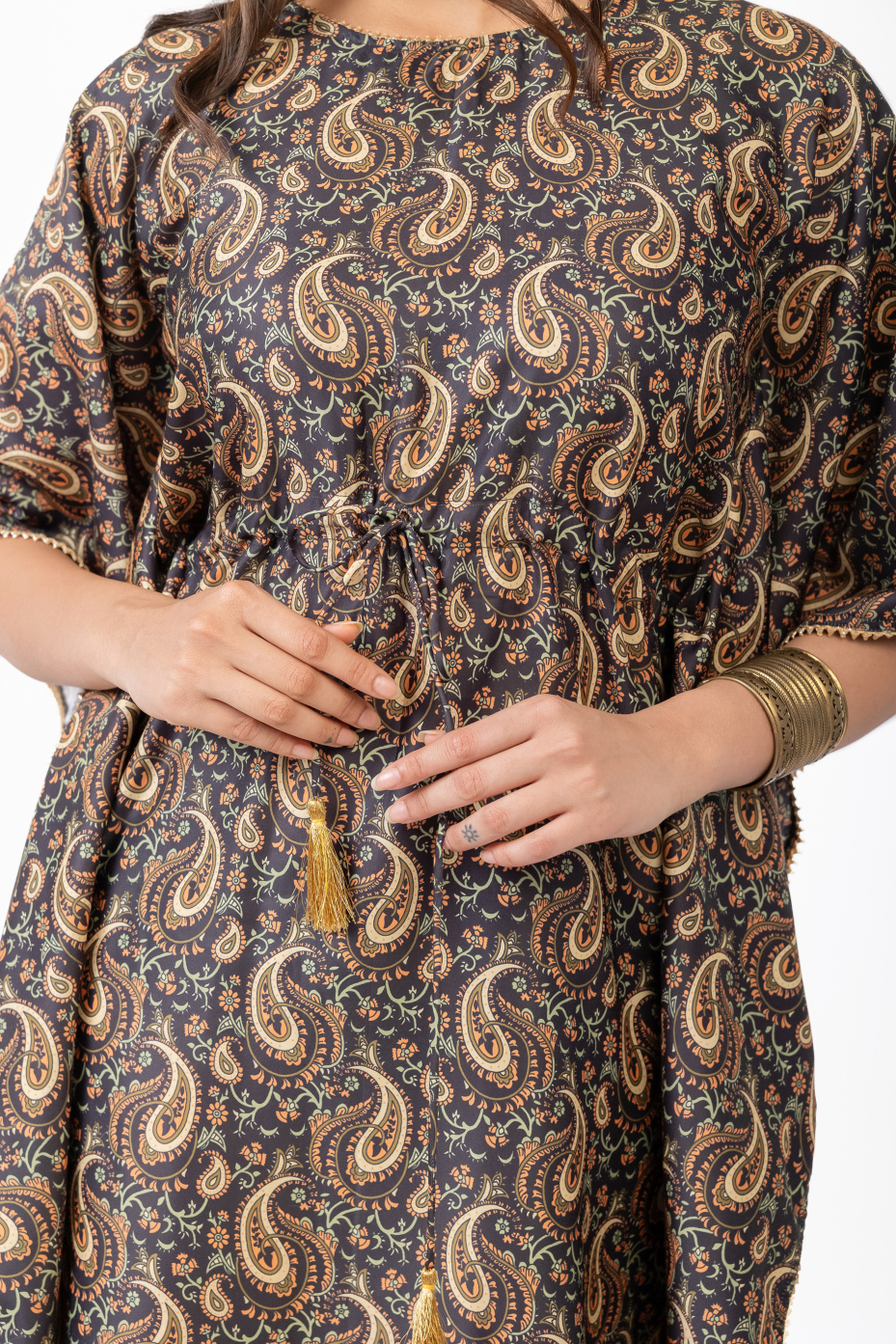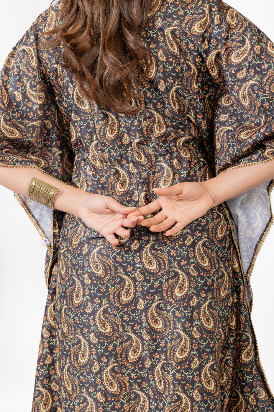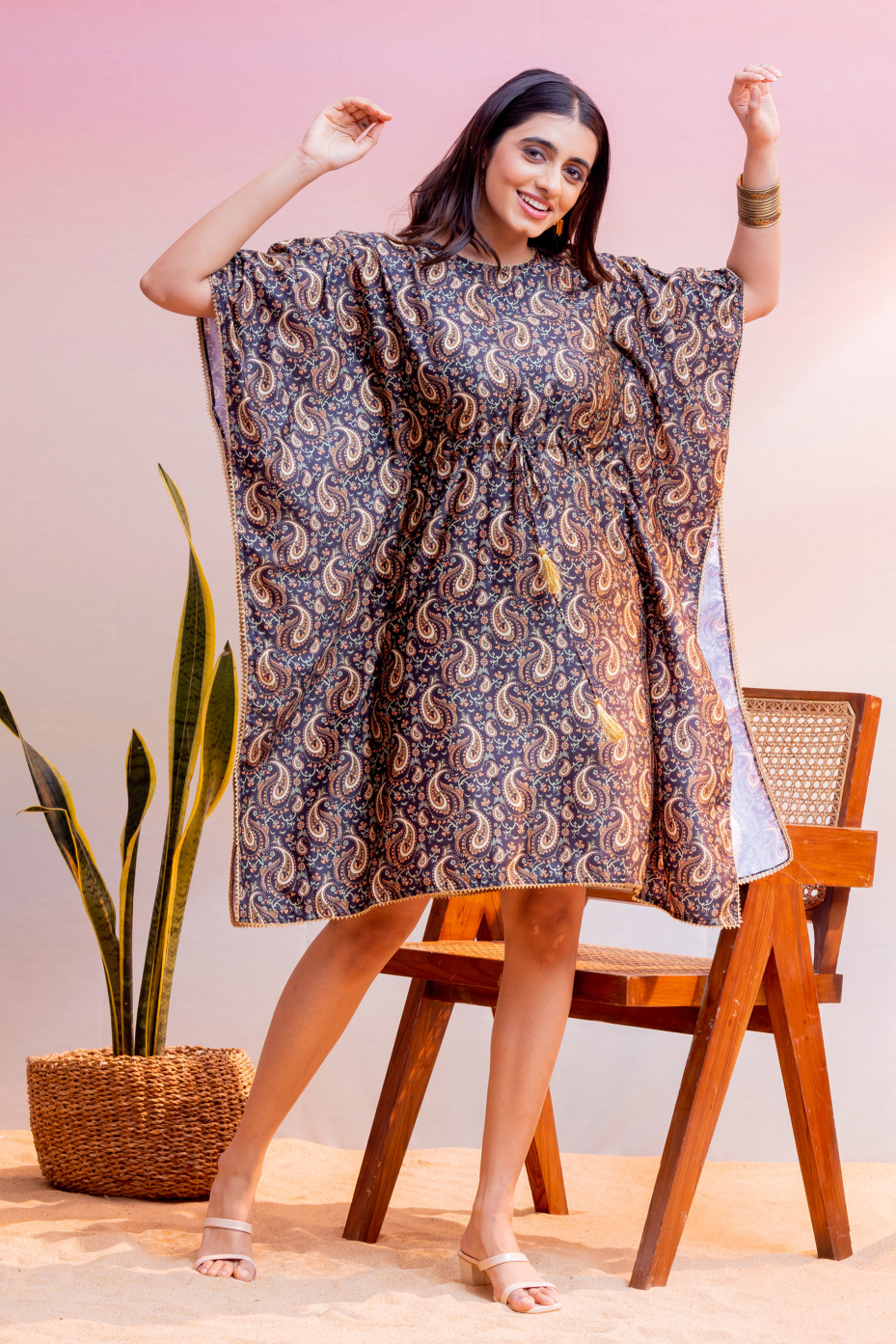 Black Paisley Printed Kaftan is flattering! This printed kaftan for women in satin muslin is more than beachwear. A fusion piece for occasional wear. Pair it with flat sandals to make it a maximum comfort.