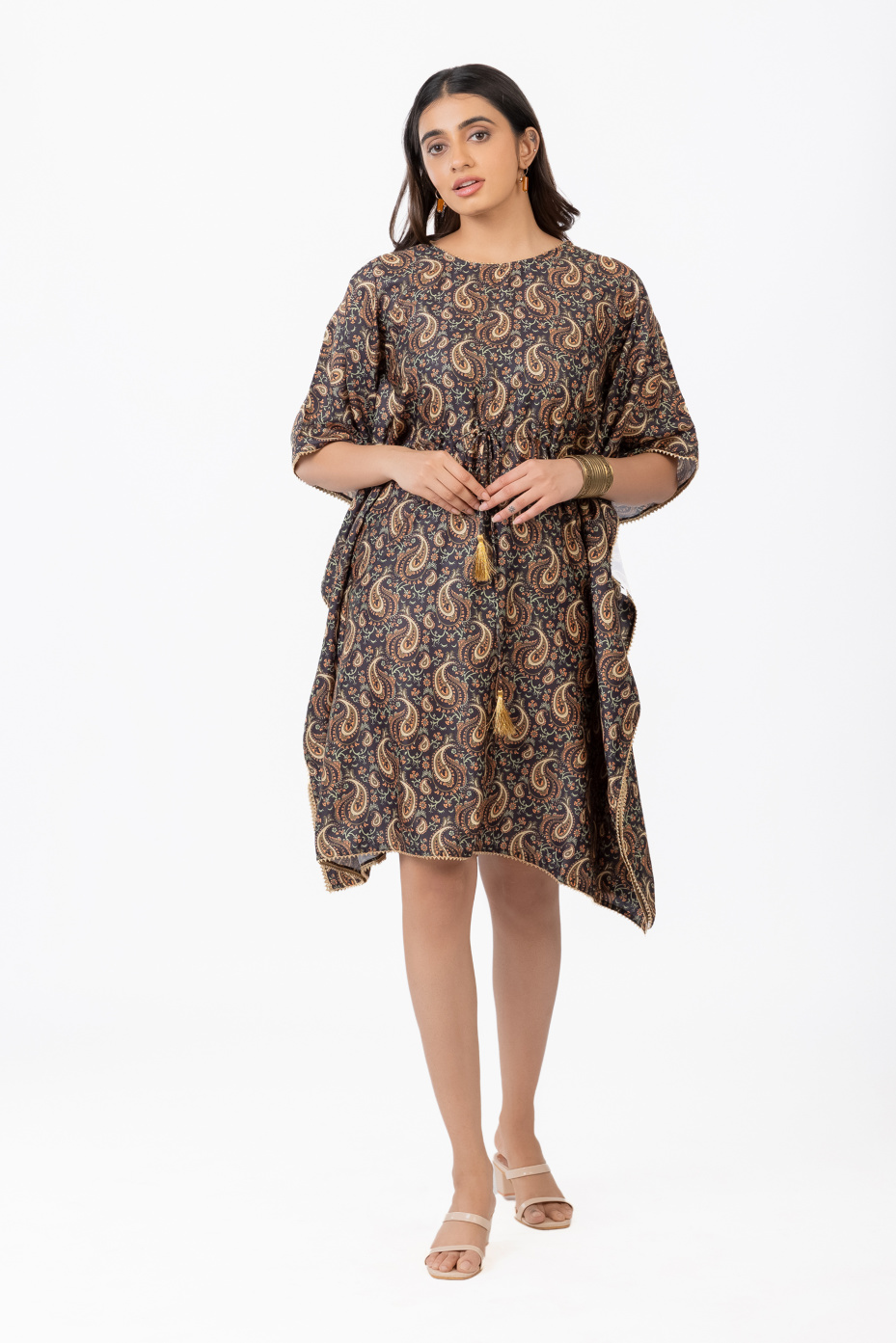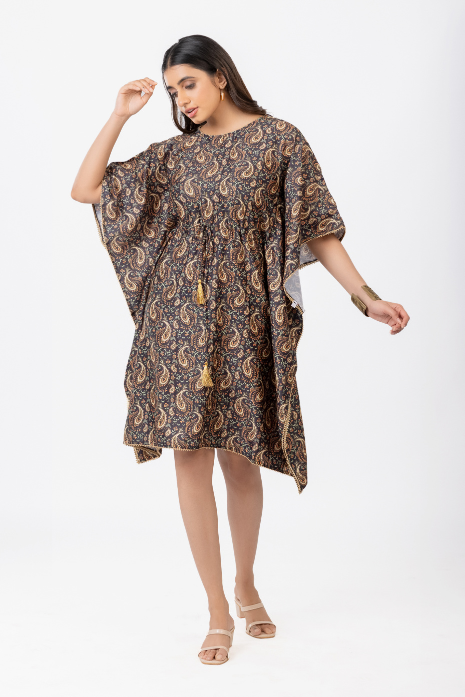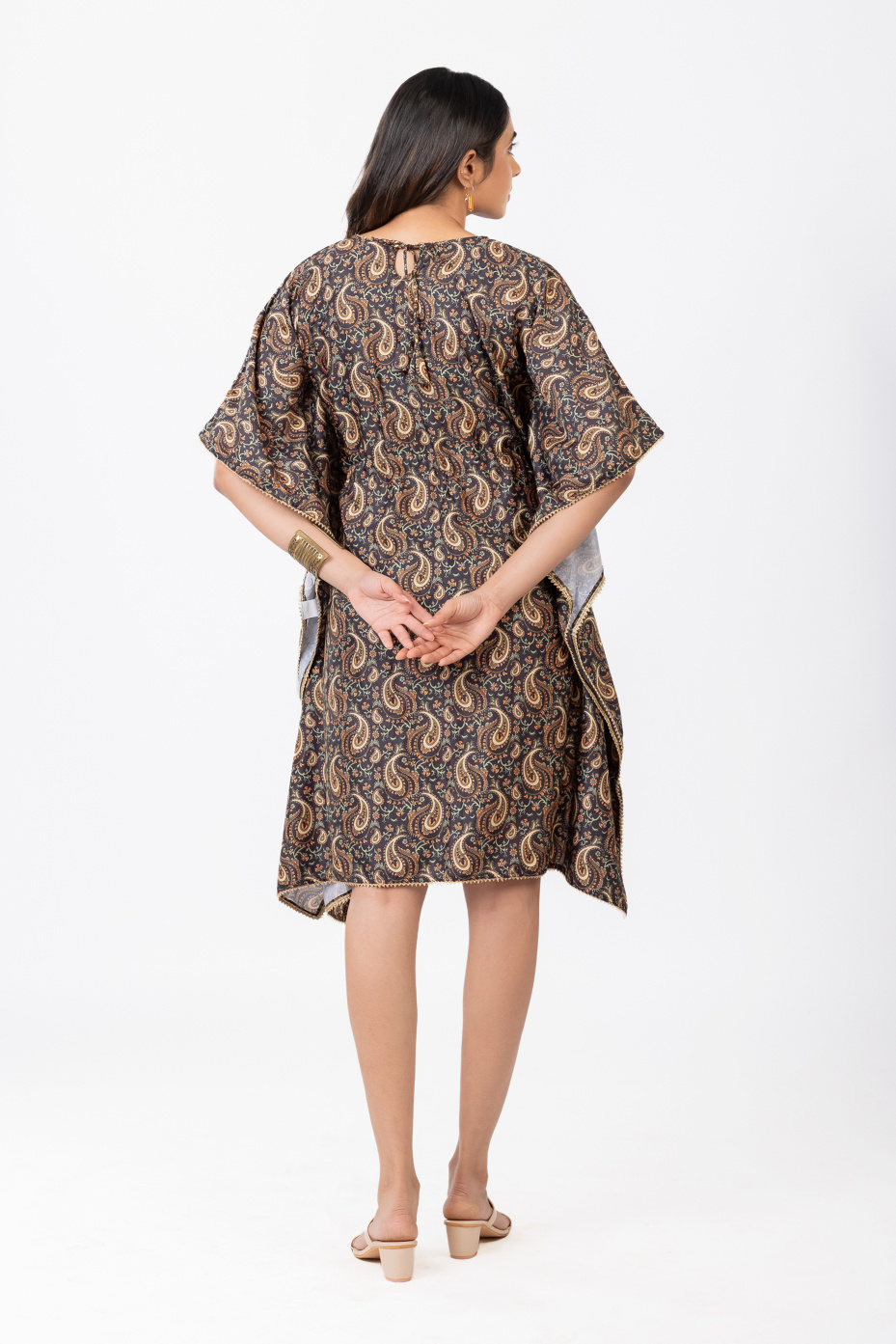 Black Paisley Printed Kaftan is flattering! This printed kaftan for women in satin muslin is more than beachwear. A fusion piece for occasional wear. Pair it with flat sandals to make it a maximum comfort.