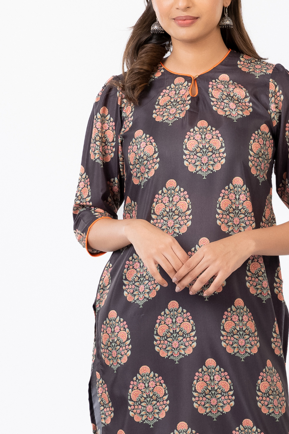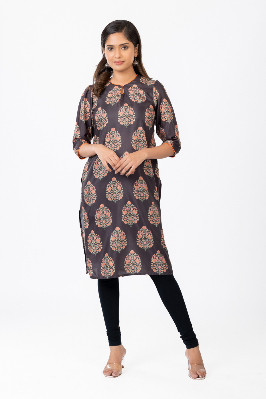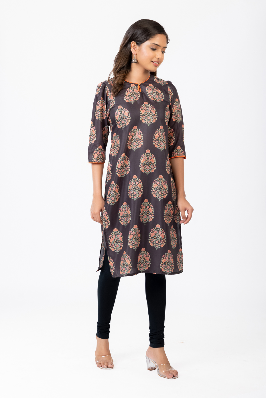 Our black floral motif printed cotton silk kurta for women is tailored with three-quarter sleeves with orange piping, that features a keyhole neckline. This charming style is suitable for daily work wear and ahead.
