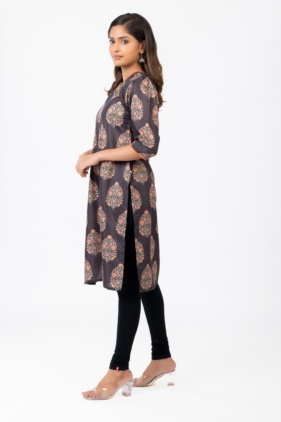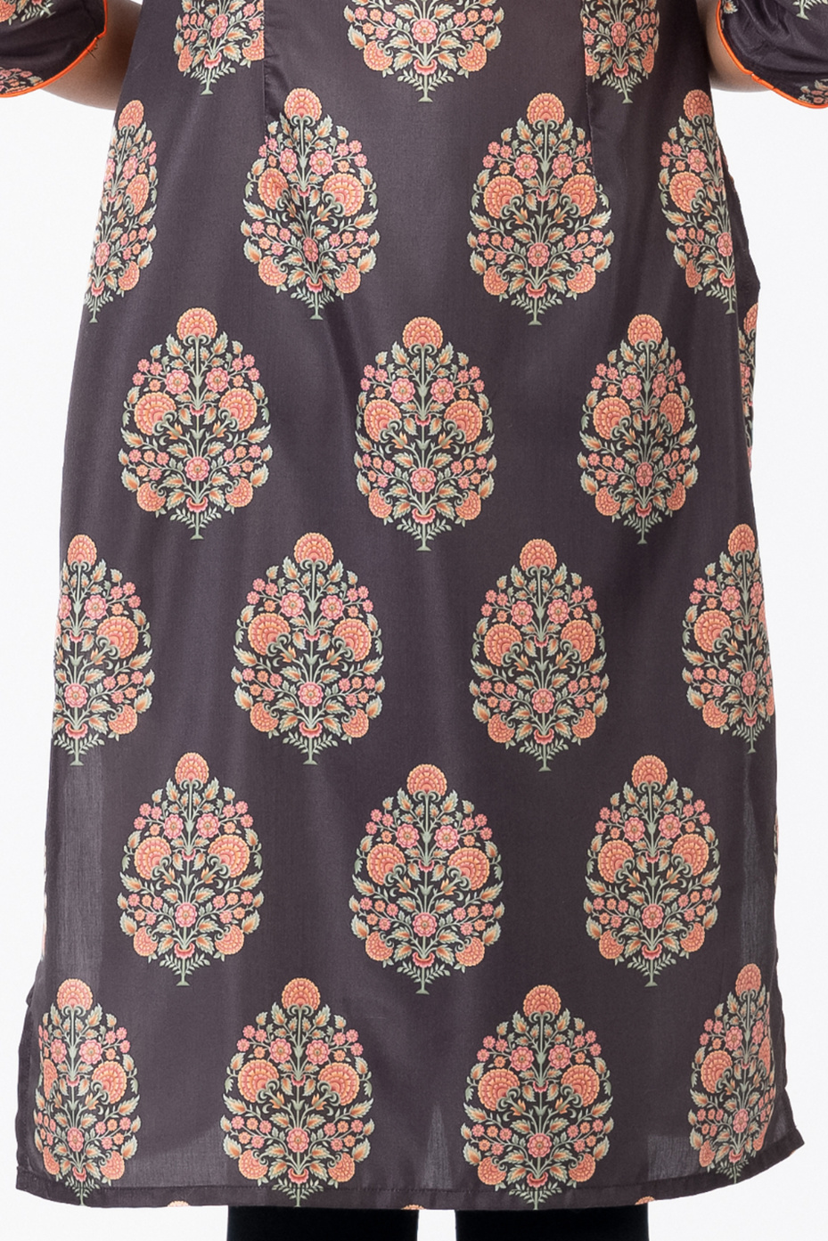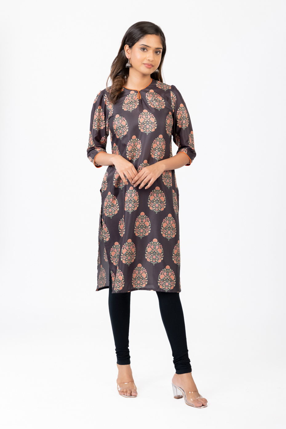Our black floral motif printed cotton silk kurta for women is tailored with three-quarter sleeves with orange piping, that features a keyhole neckline. This charming style is suitable for daily work wear and ahead.