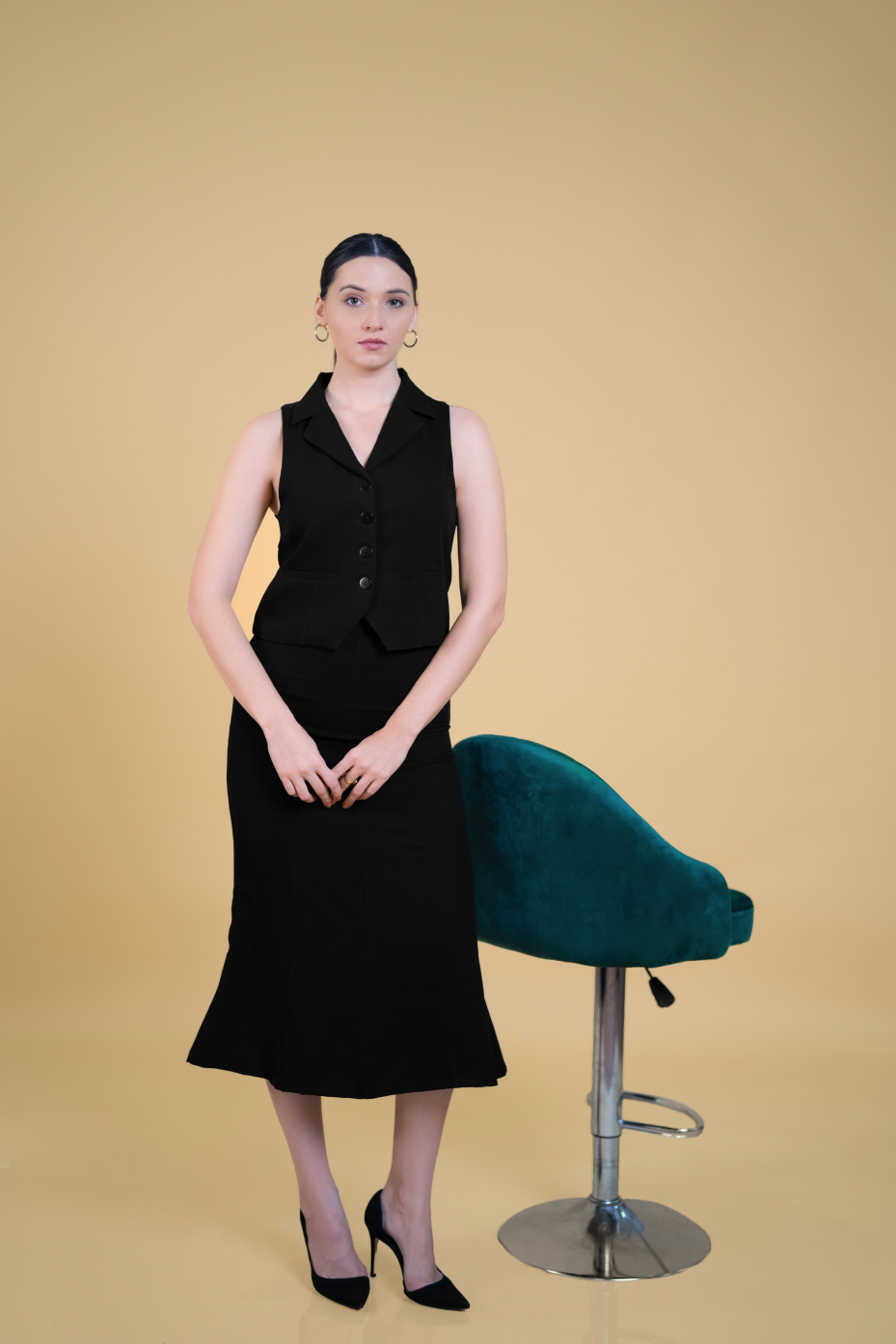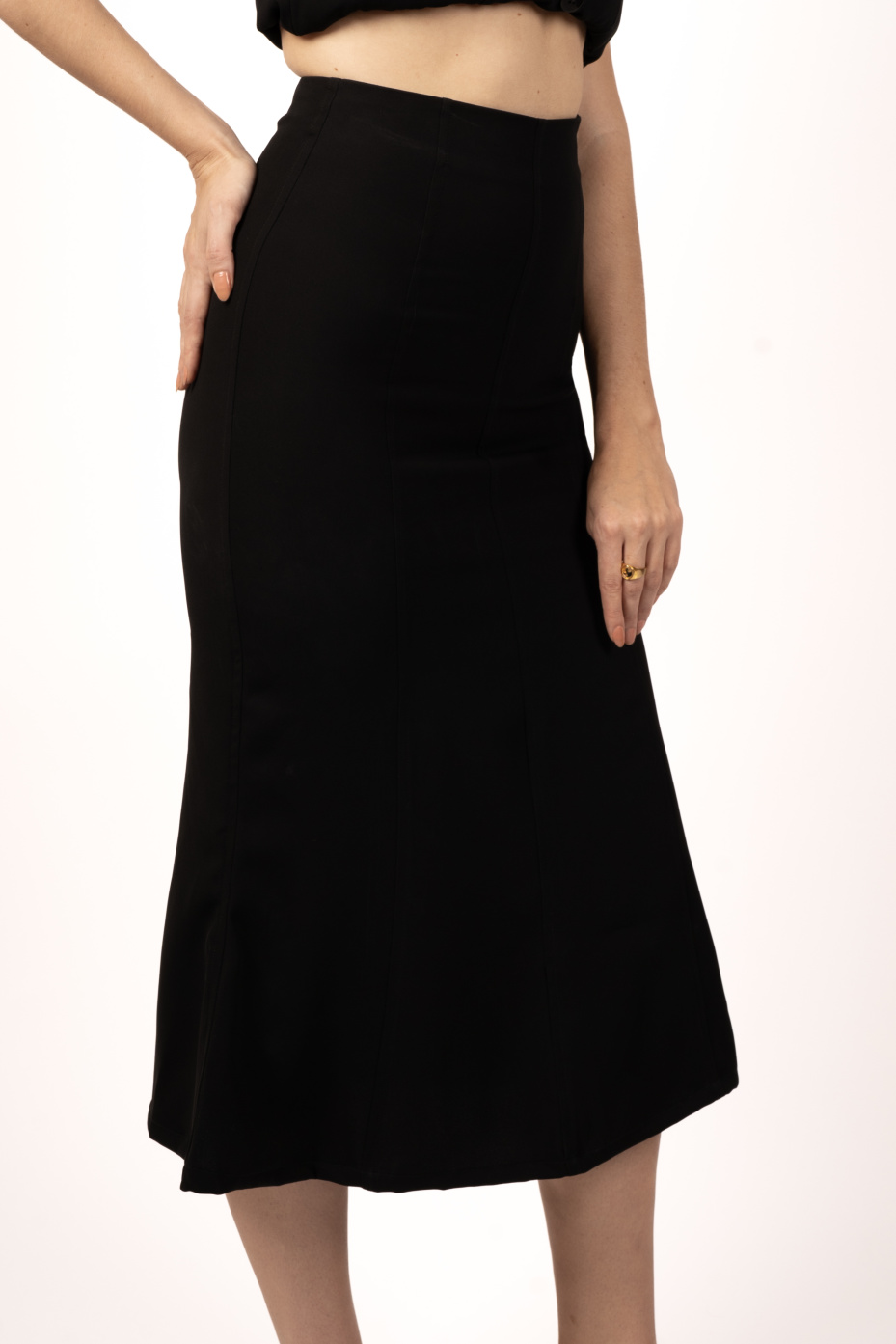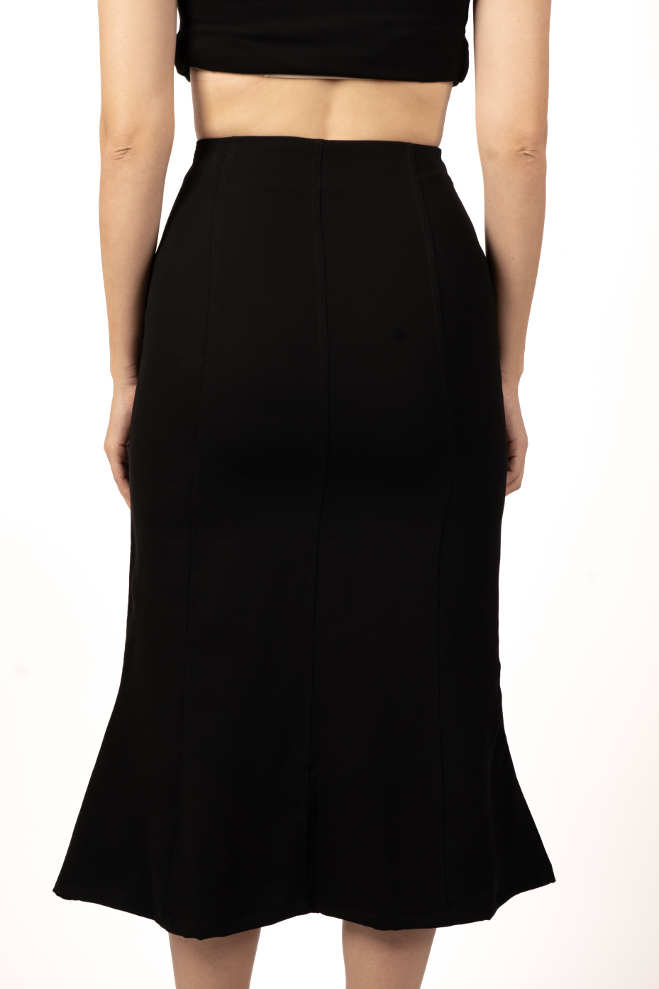 Get them talking by making a powerful entry in this black formal skirt. It features a calf length fit with a mermaid cut style. Discover the perfect blend of comfort and style in this high-quality polyester fabric.