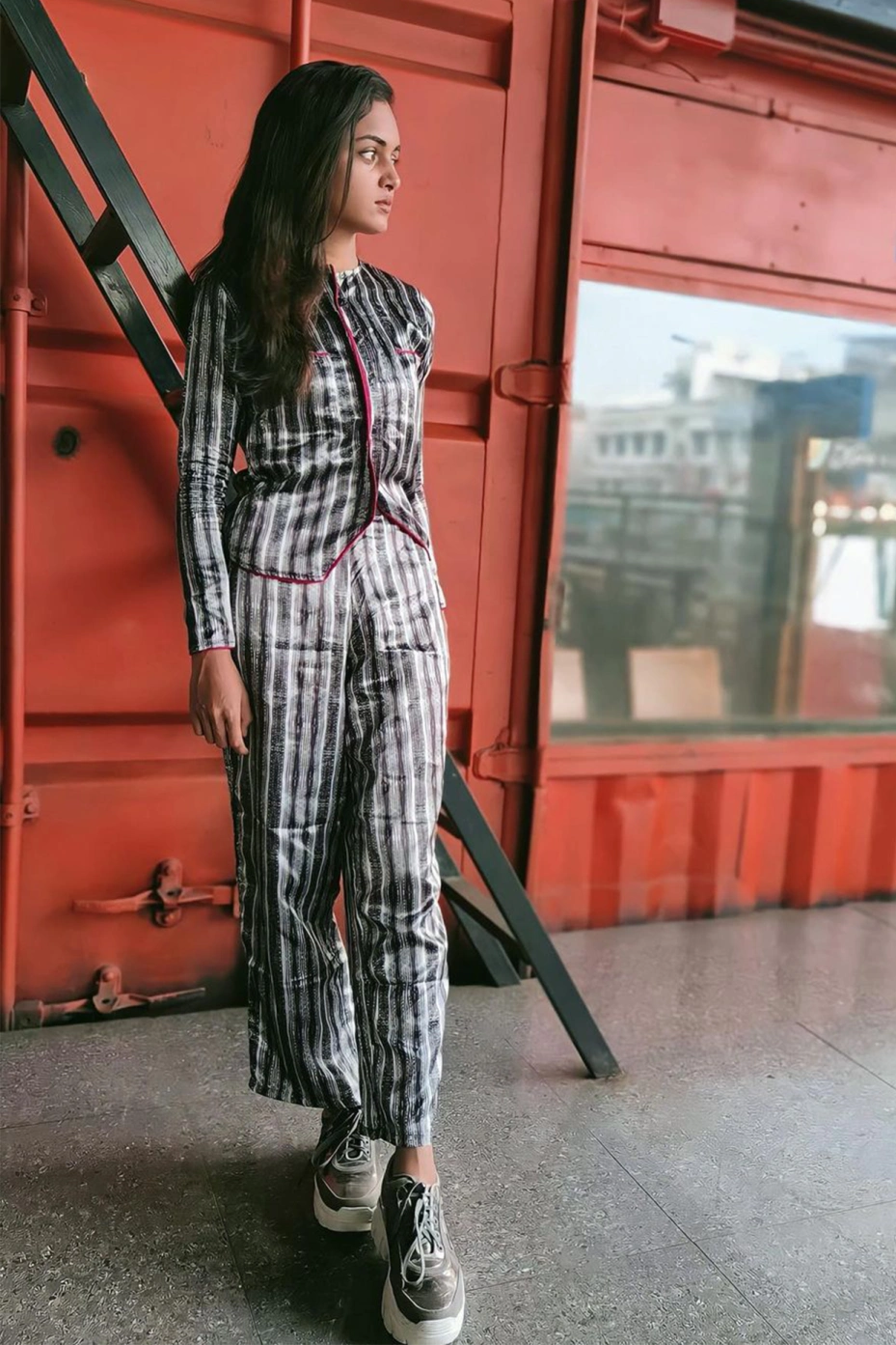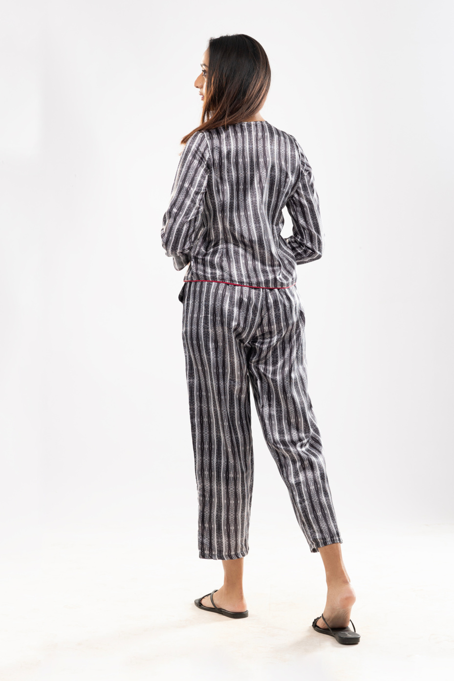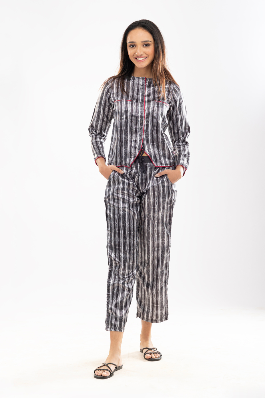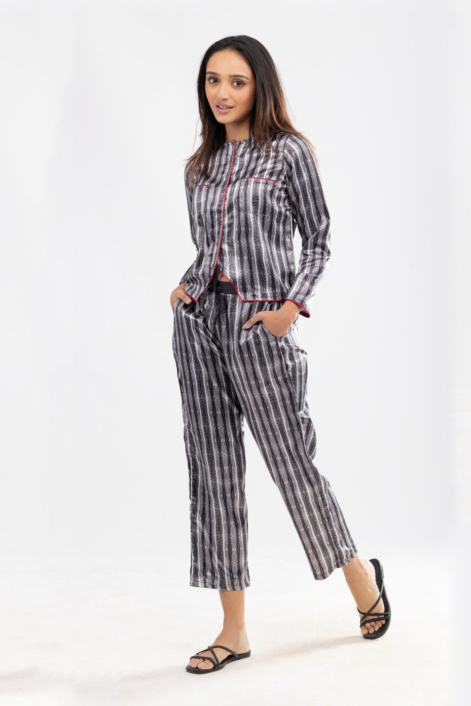 This black abstract print co-ord set includes a set of full sleeves and coordinating bottoms for a fashionable look. It is made of a fine fabric (Ultra Satin), which gives it a touch of charm and a modern look and can be worn for gatherings, parties, and vacations.
