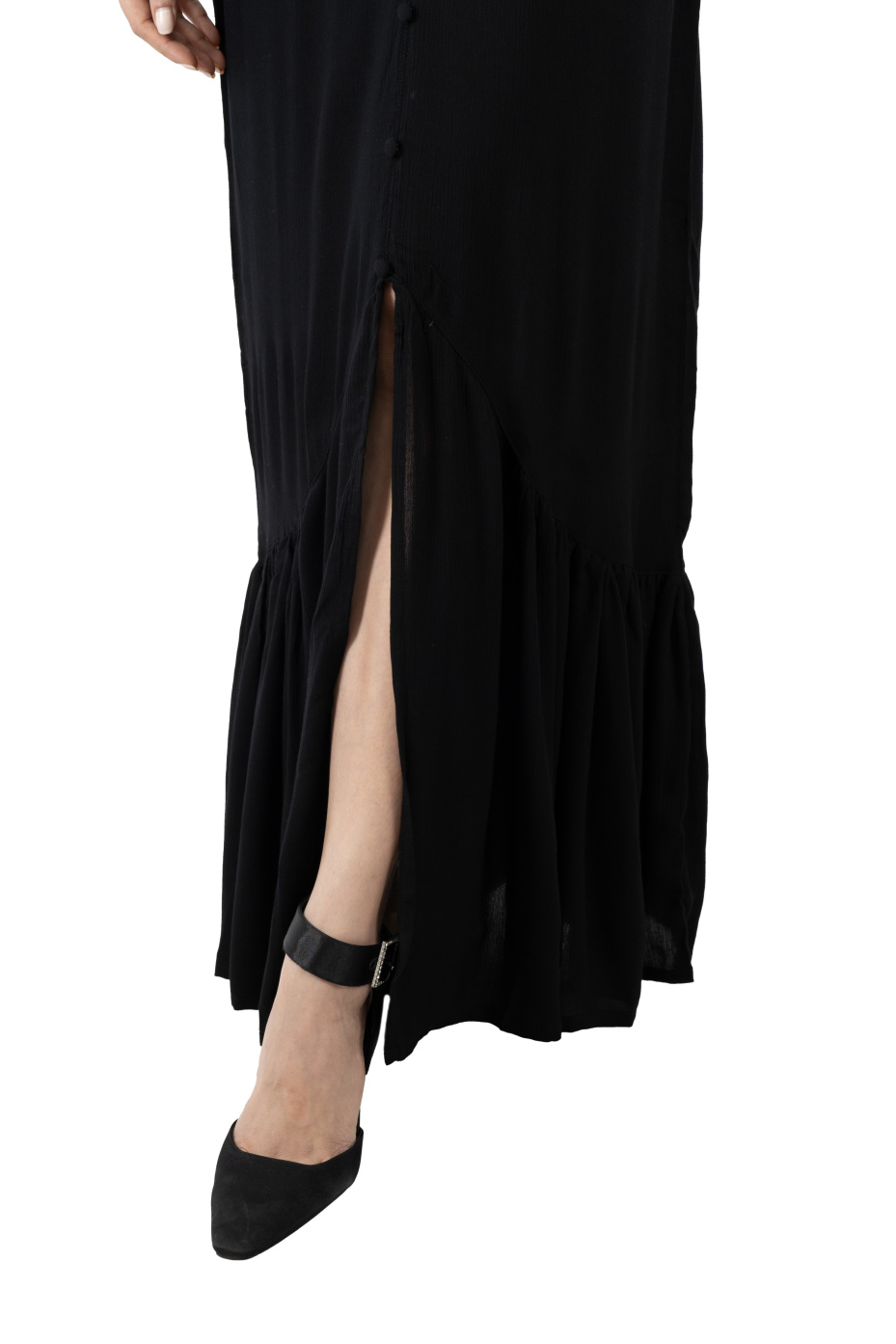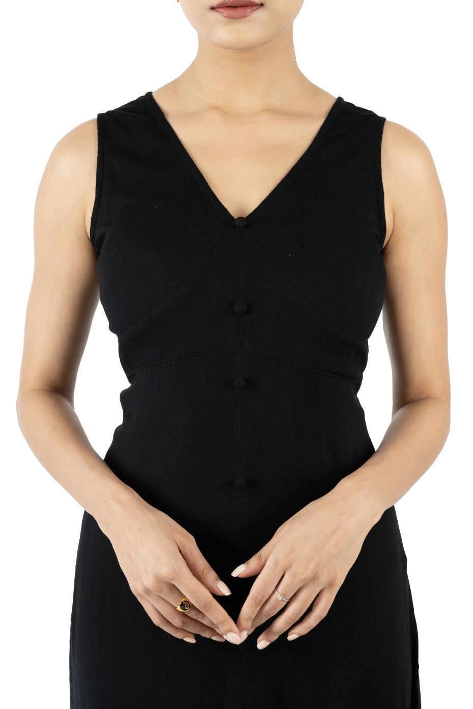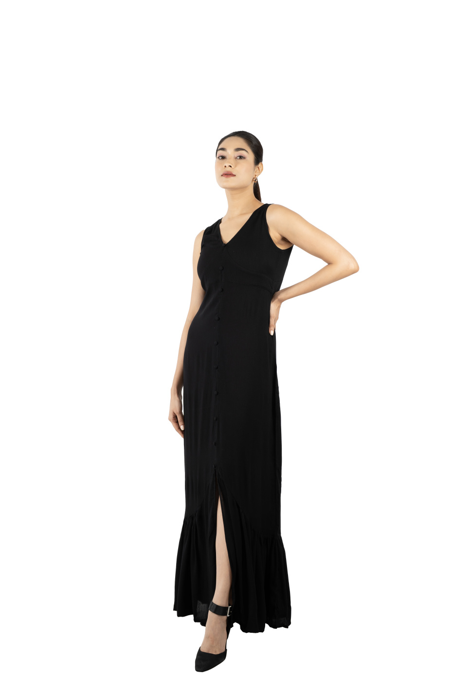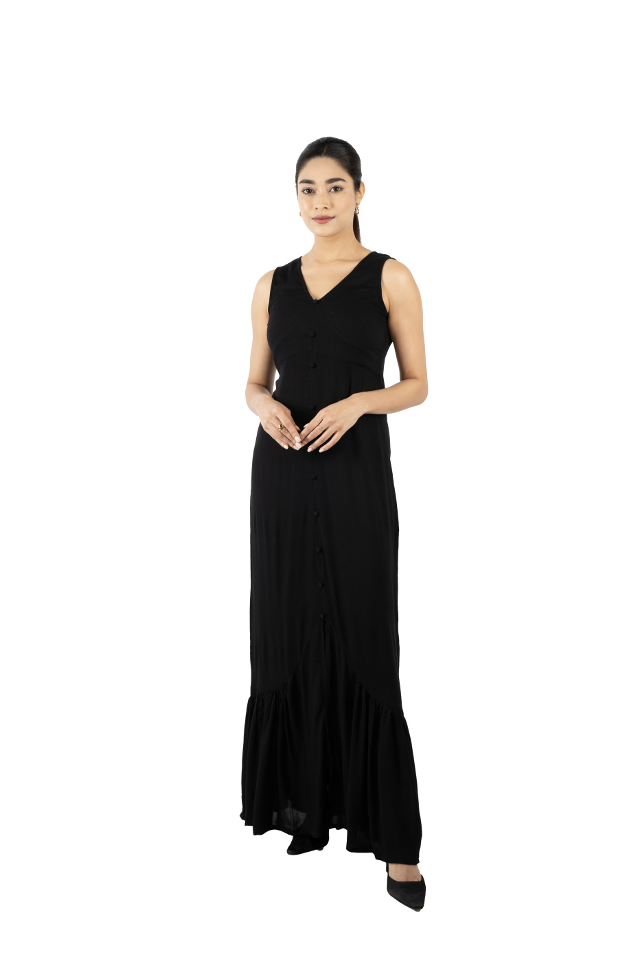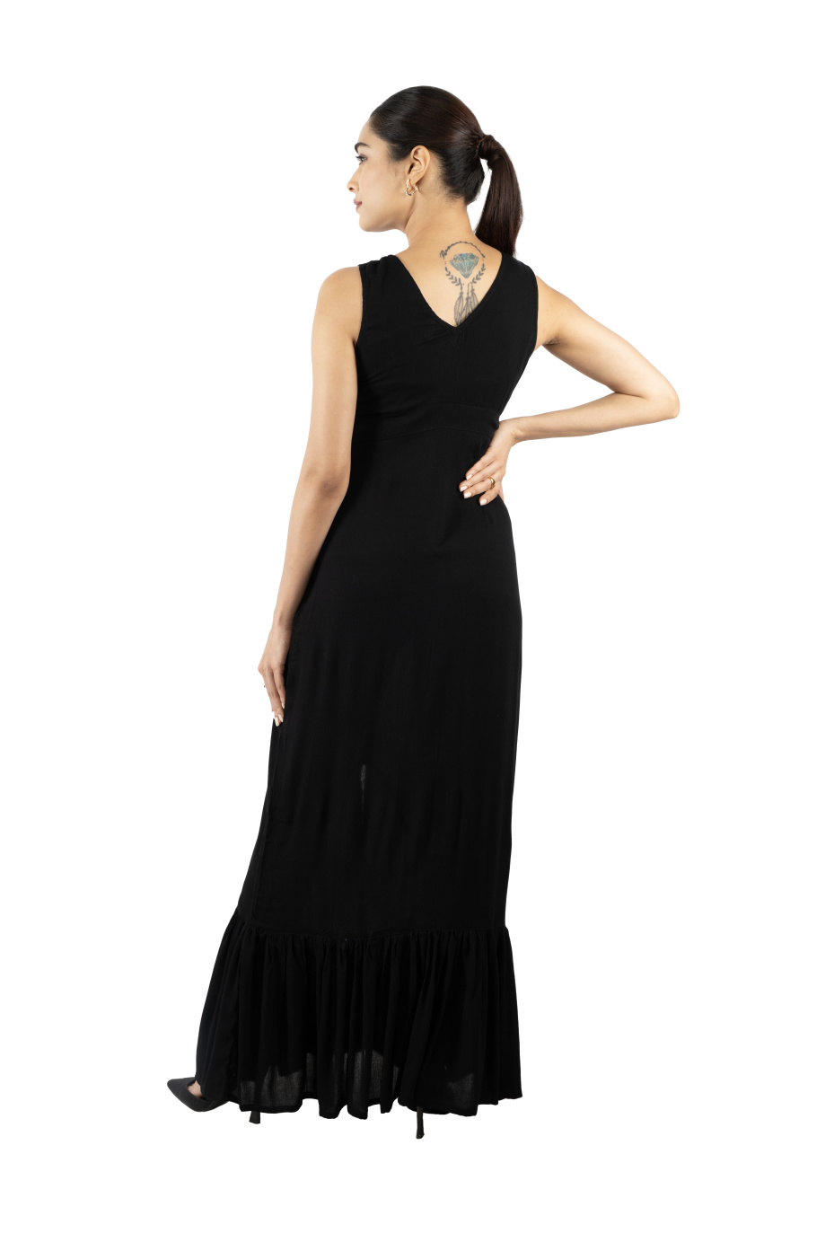 Flaunt an elegant look on a night out with friends in this black v-neck maxi dress. It is sleeveless and features a maxi length with a high and low flared hem. Made from a high-quality rayon fabric that boasts comfort. Pair it with heels, earrings, and a sleek bag to create a polished look.