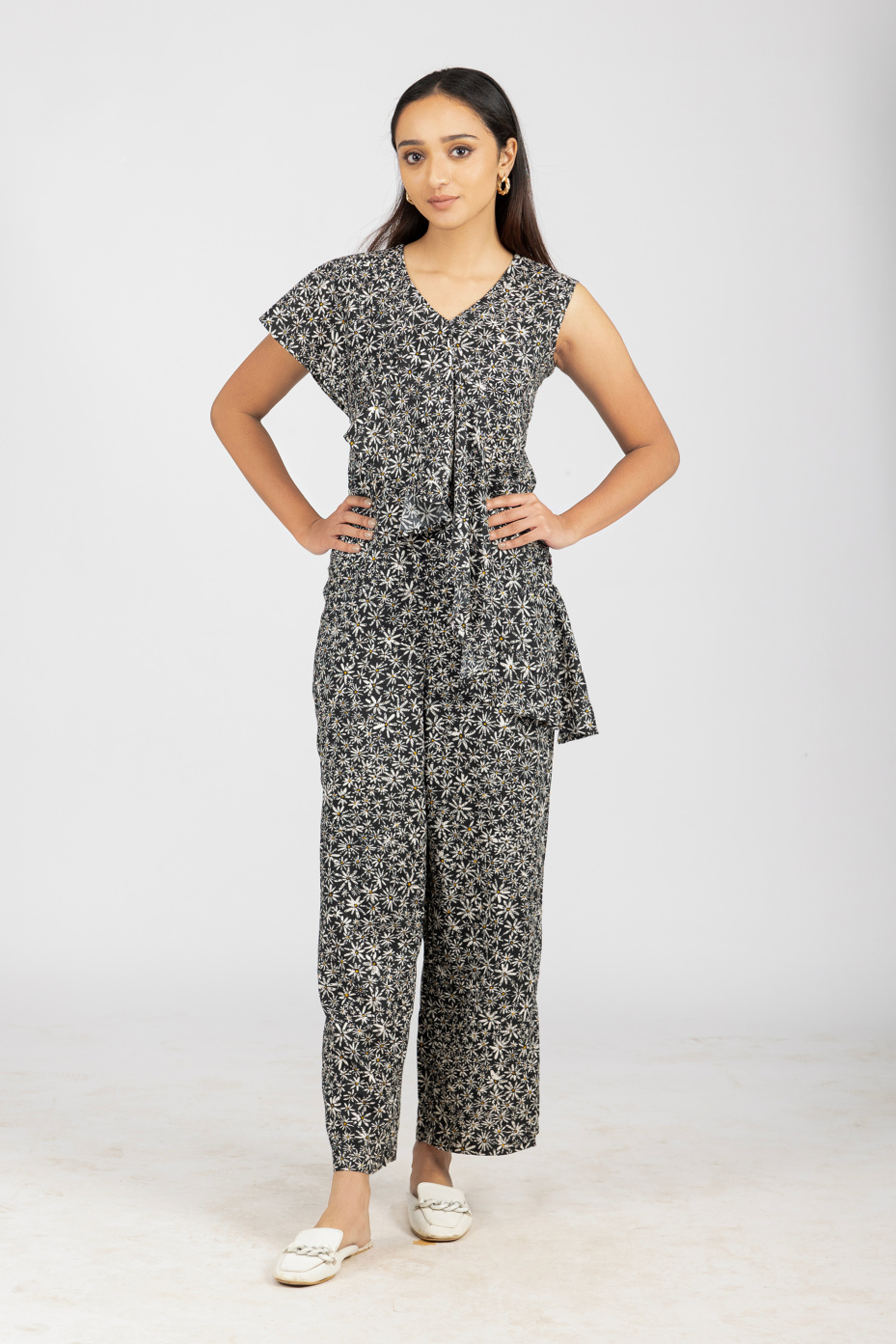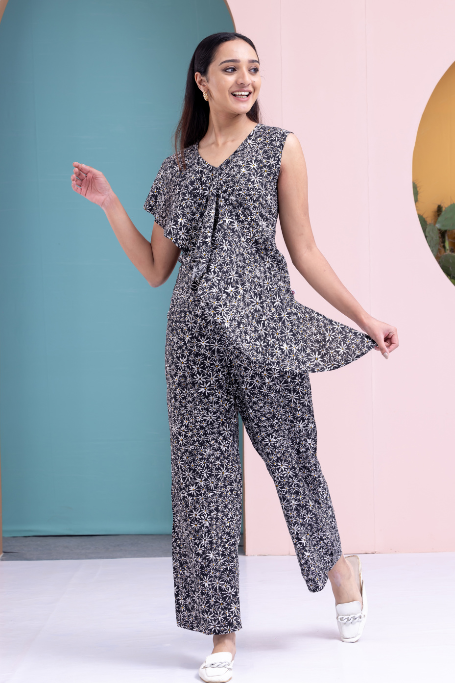 This black floral jumpsuit is made of comfortable and breathable fabric (Rayon). It gives a casual look and suits every hangout and pleasure trip. A statement belt can be added to this stylish ensemble to make it look more upscale.