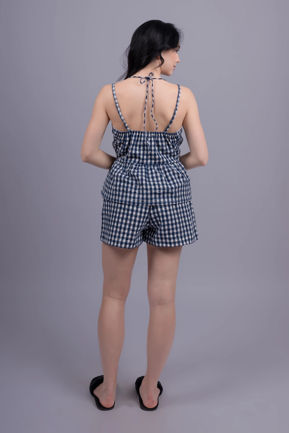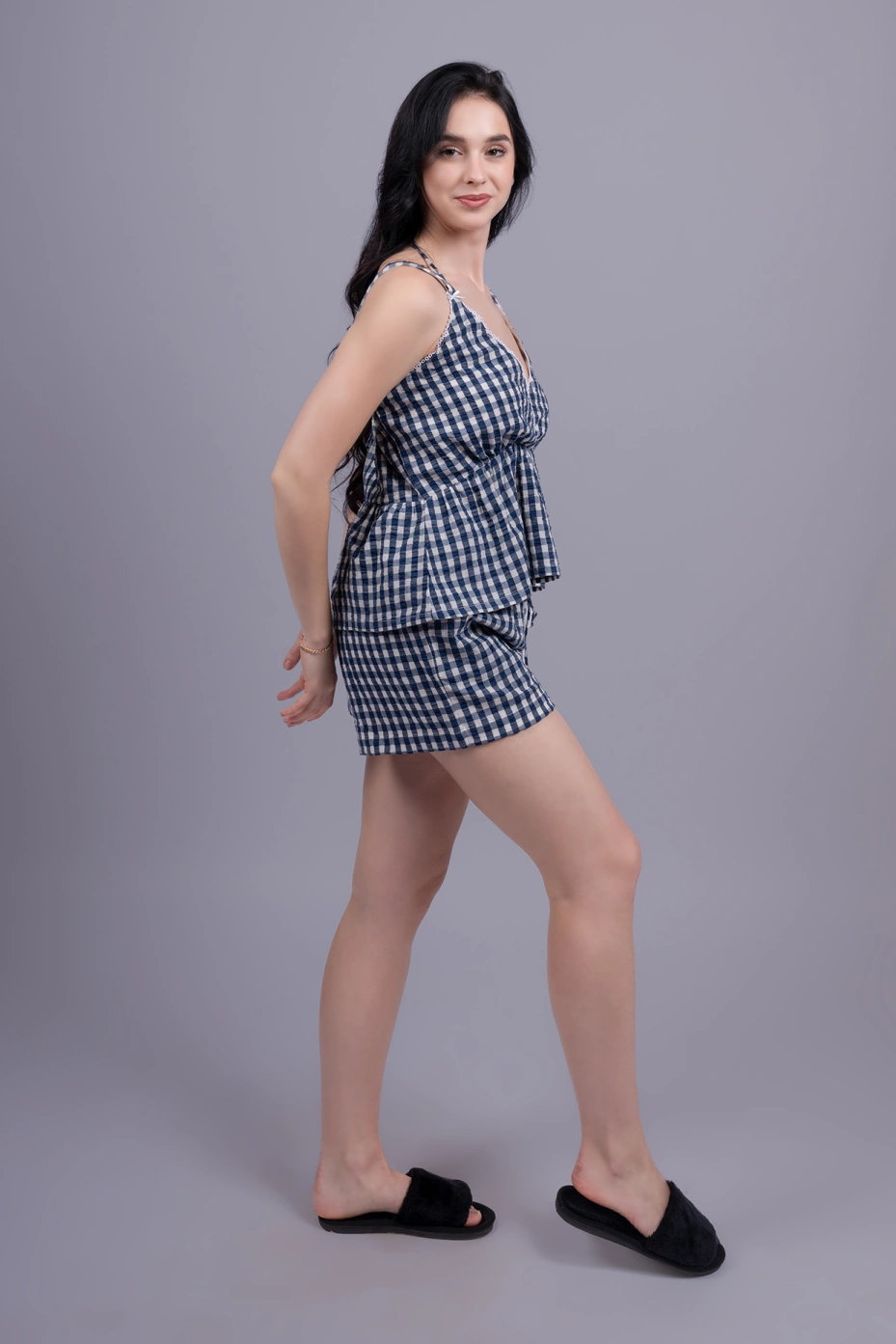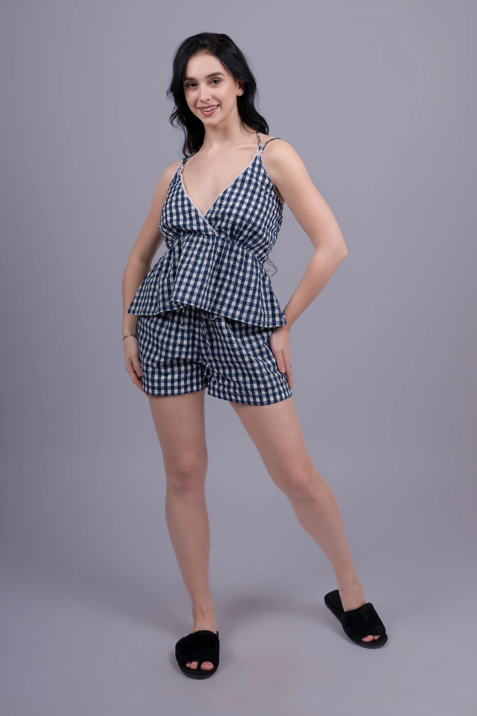 Are you looking for loungewear to wind down the day in comfort? Then this blue-checked set is the perfect escape to de-stress. The cami top features all-over checked print, a V-neck with lace details, a sleeveless cut, and an overlap-styled peplum detailing. The shorts feature a regular fit and functional two side pockets. Relax as you lounge in this womens loungewear made from cotton fabric to ensure breathability.
