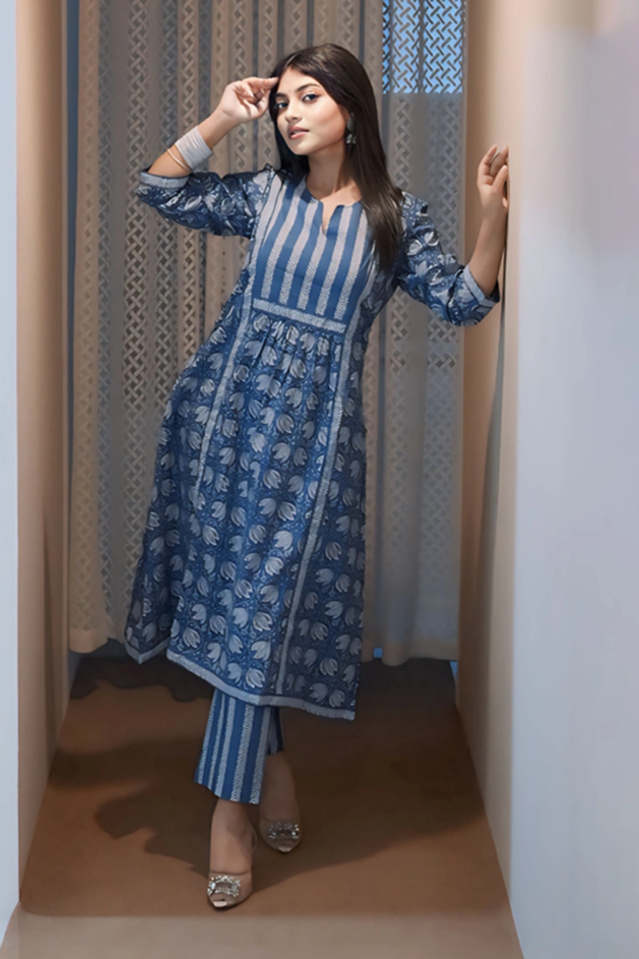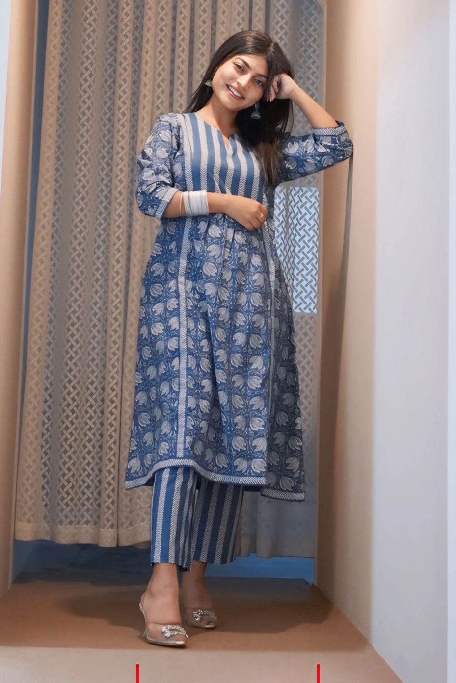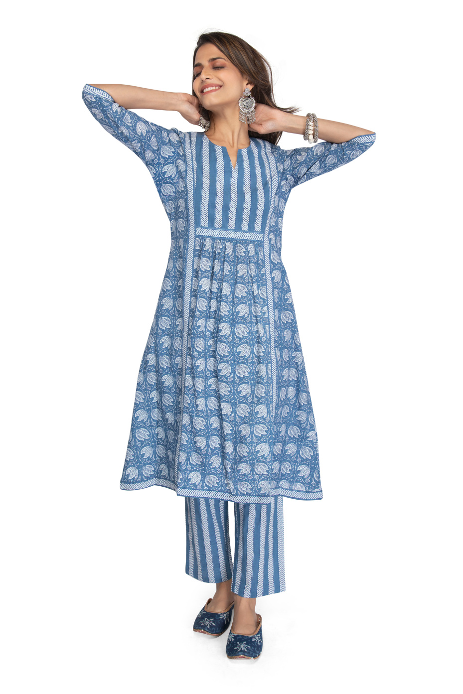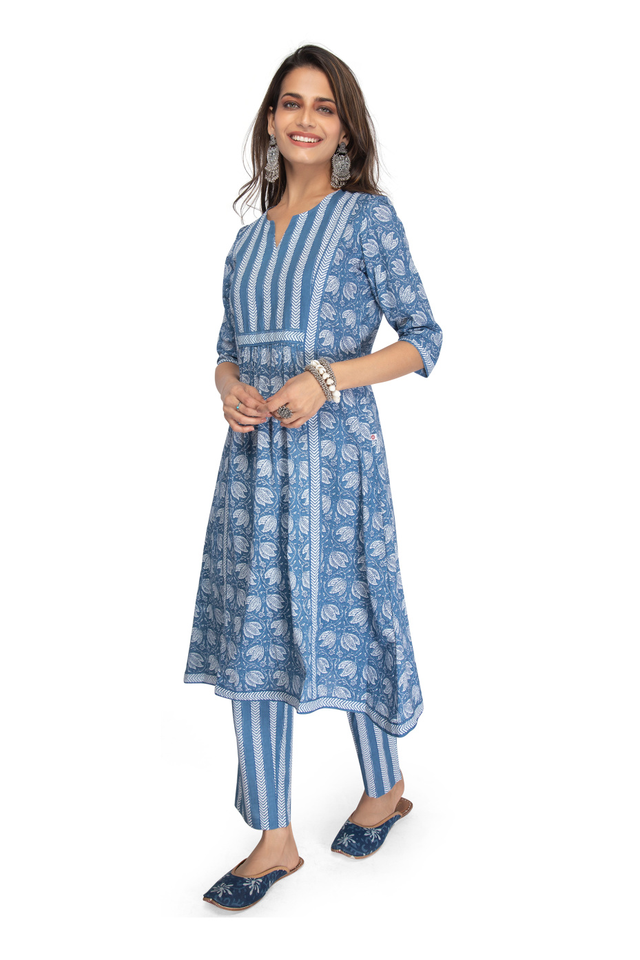 sBlue Cotton Floral Kurta With Straight Pant 2 Pcs Set