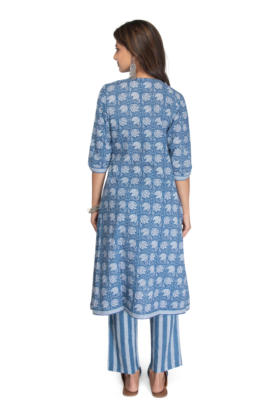Blue Cotton Floral Kurta With Straight Pant 2 Pcs Set