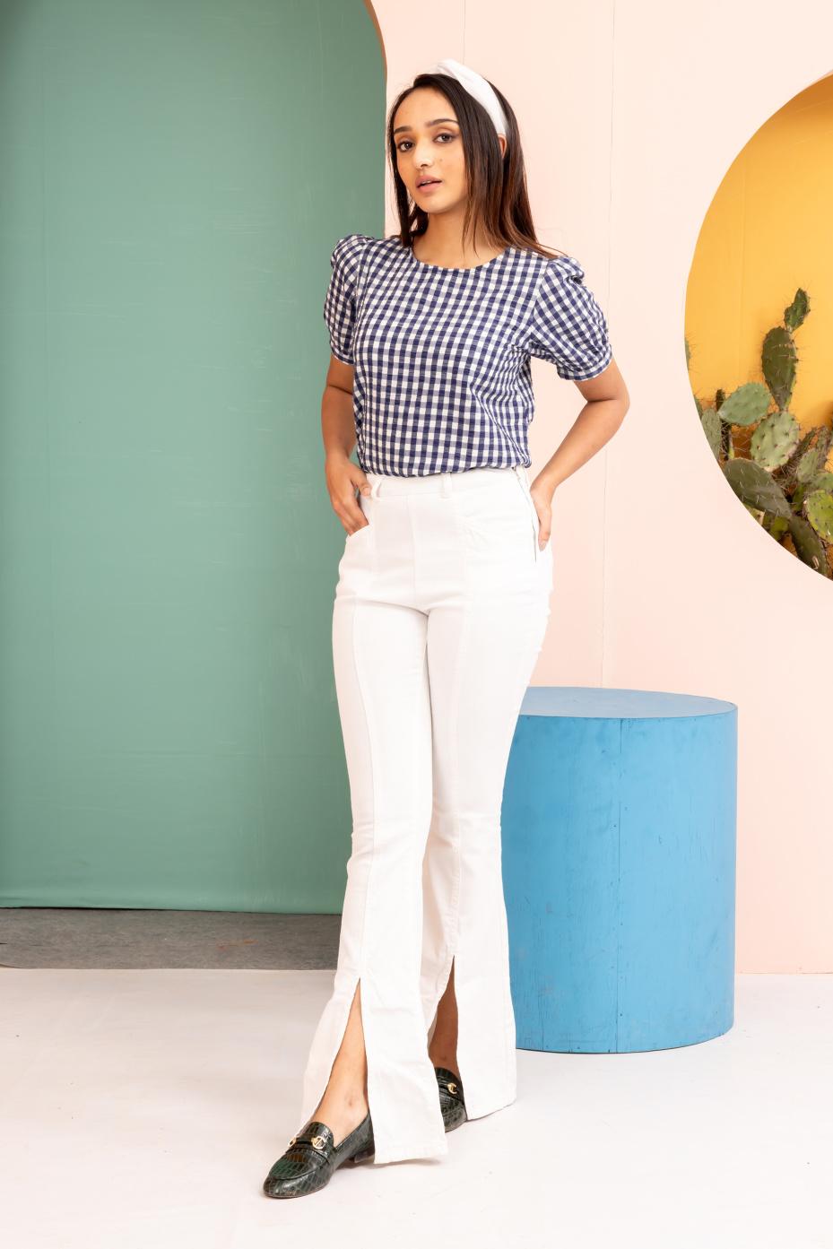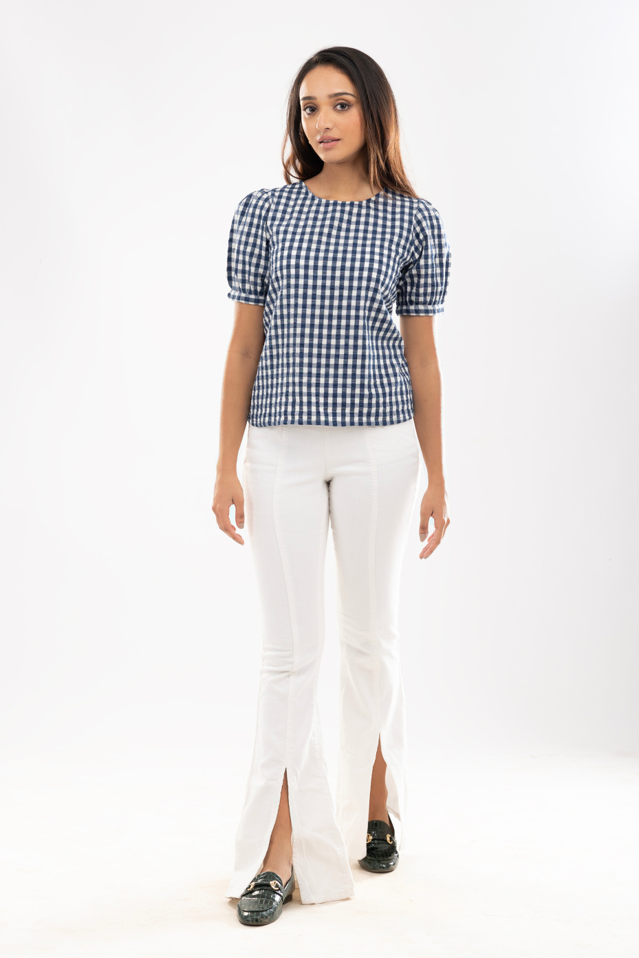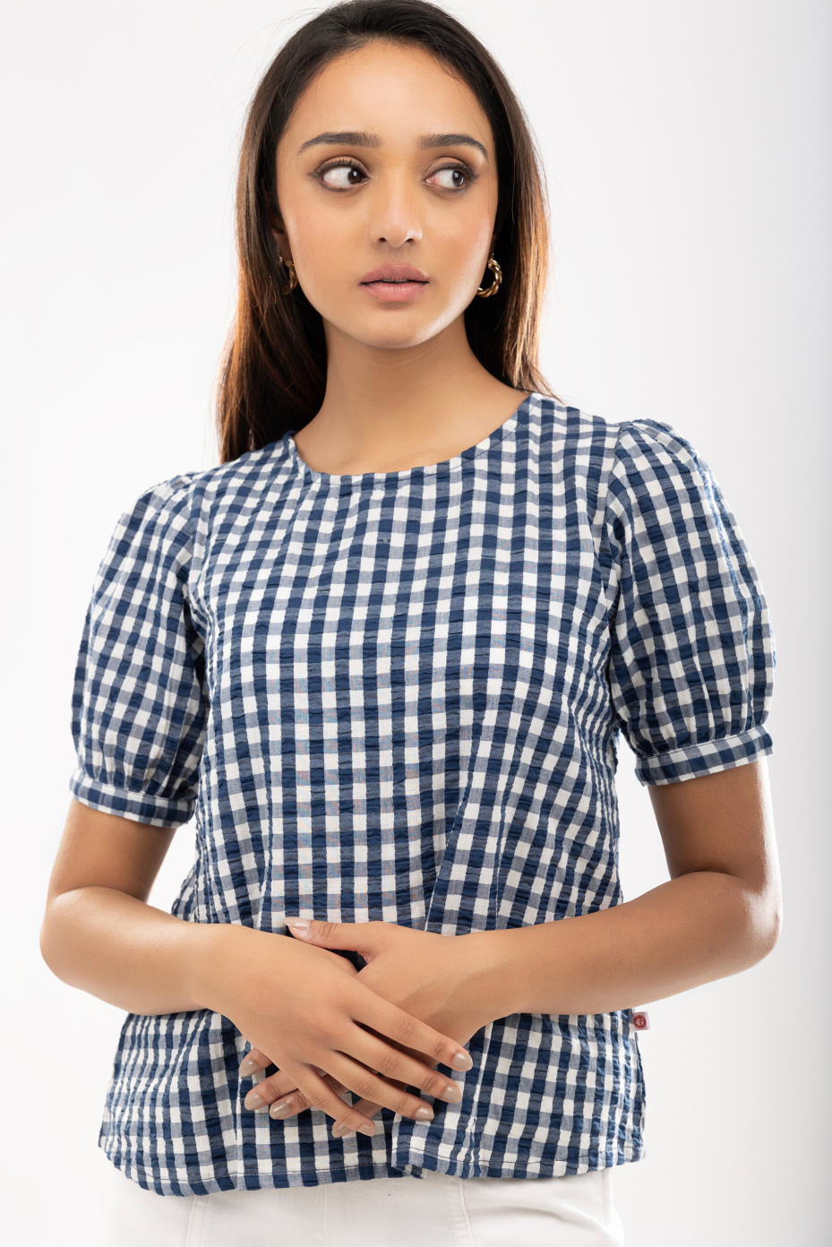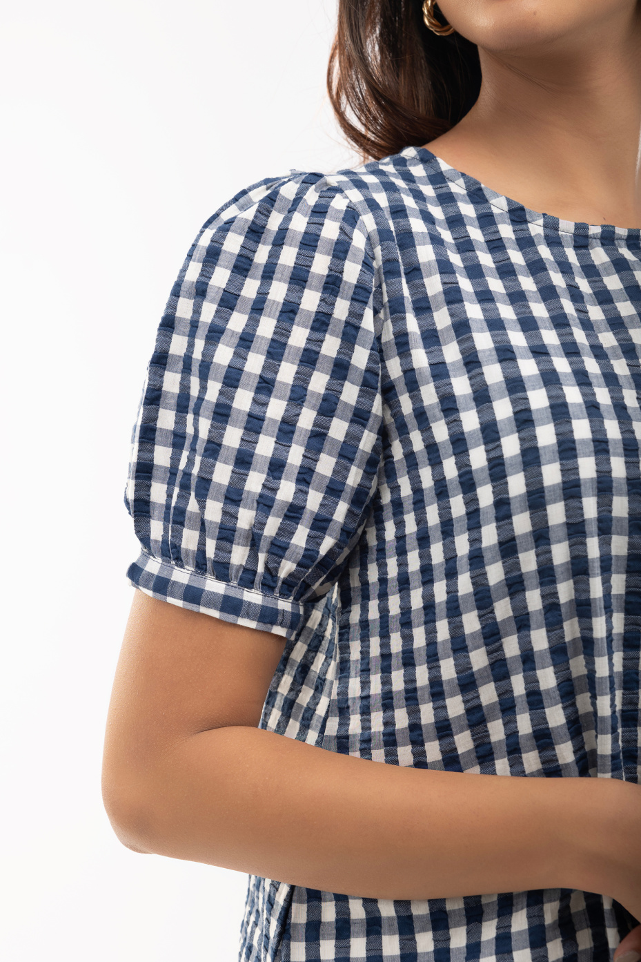 Blue Cotton Puff Sleeve Checked Round Neck Top
