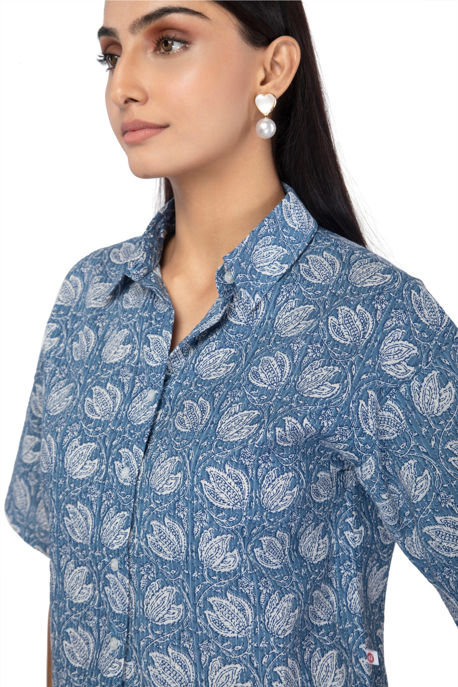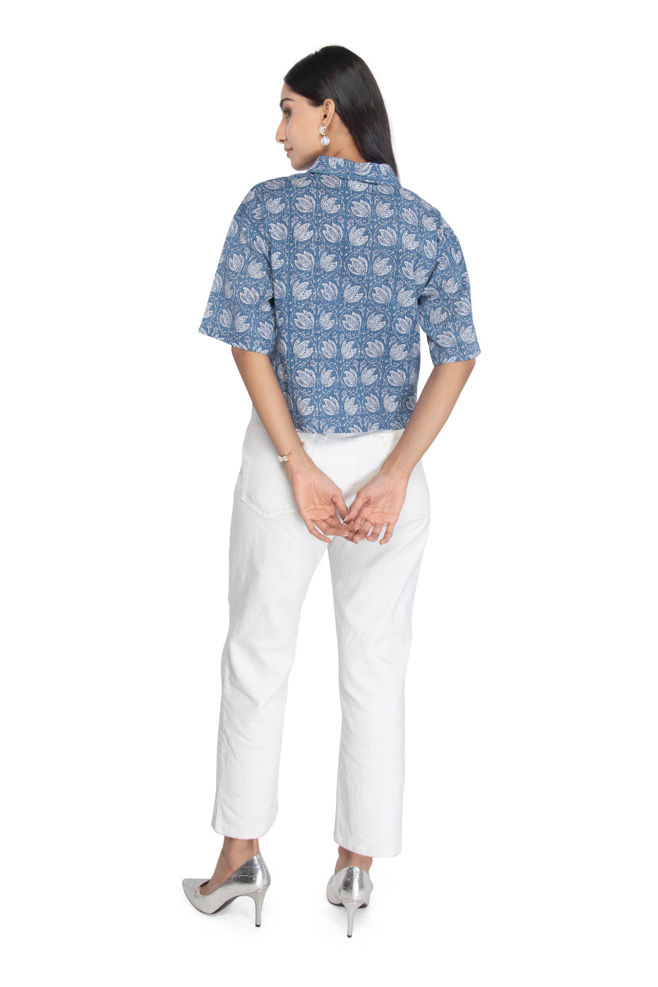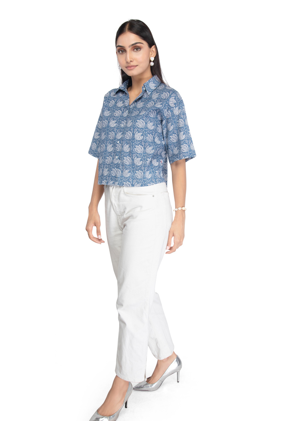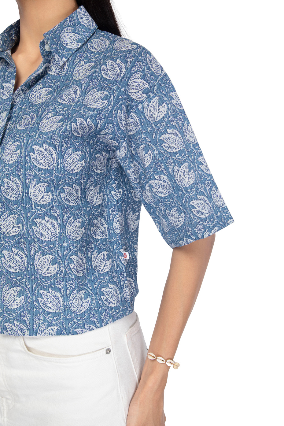 Our eye-catching cotton drop-shoulder shirt is the perfect pick for your casual day out. Made with a soft cotton breathable fabric, that features a floral print, drop shoulder, and short sleeve crop shirt. Upbeat your style with high-waist shorts, solid sneakers, and hoop earrings.