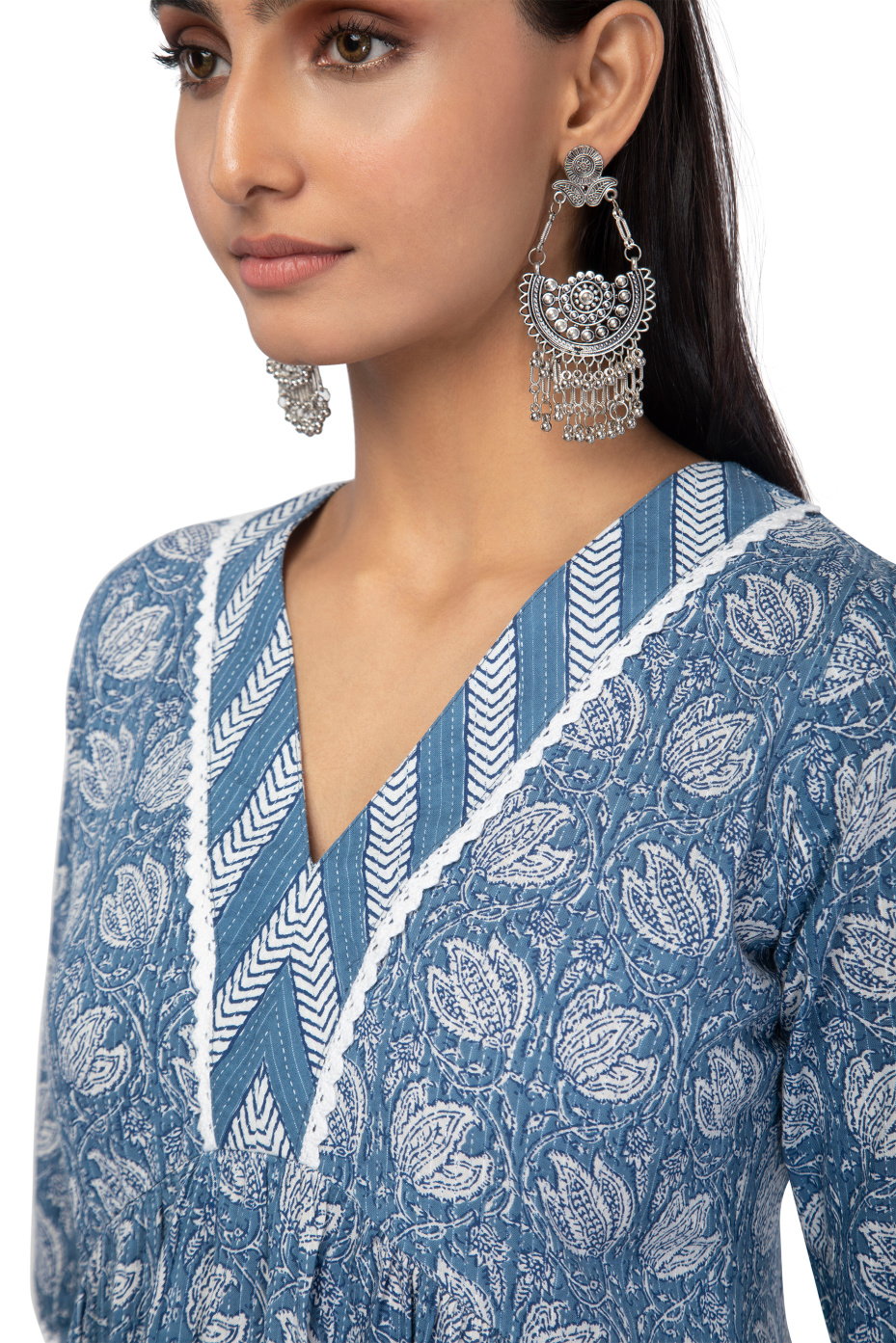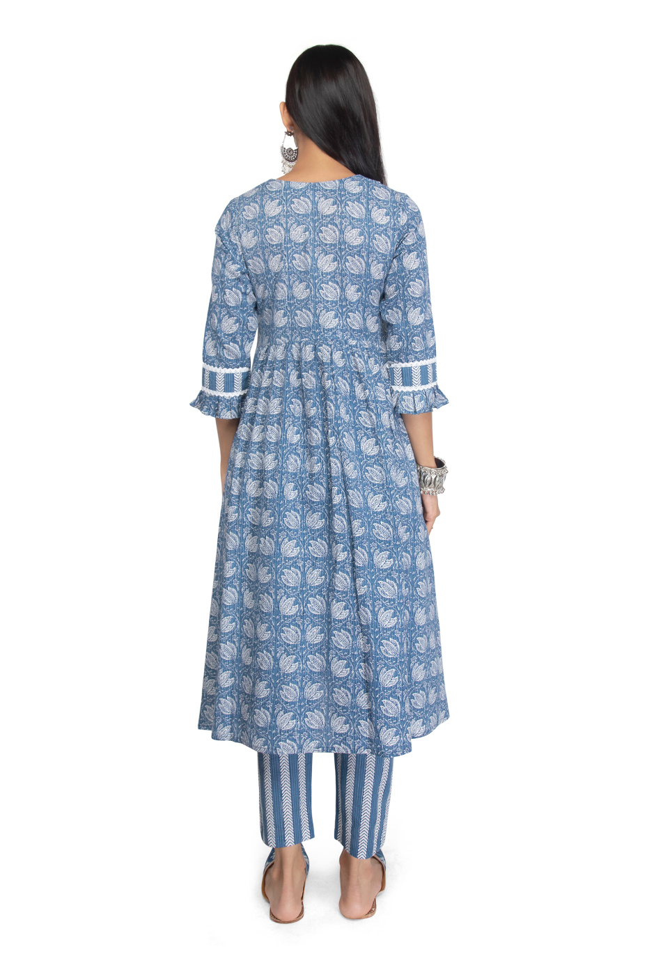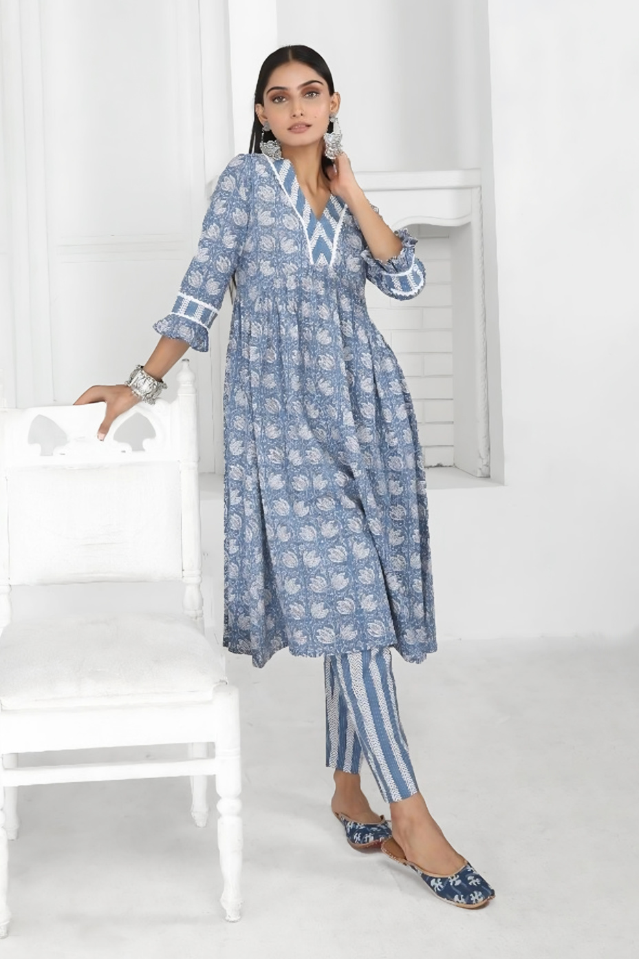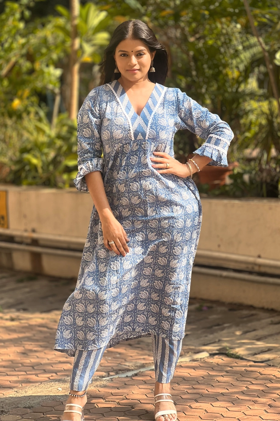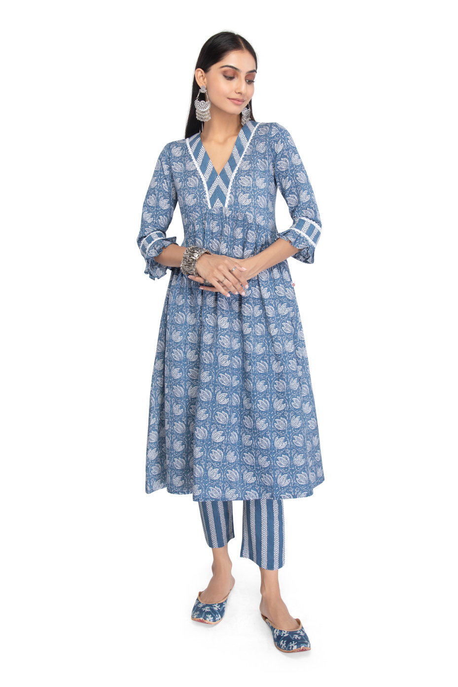 Explore our elegant floral kurta set suitable for your special occasion. It highlights, breathable cotton fabric, a quarter sleeve kurta, wide V-neck, with a calf-length kurti straight pant set. Spark up your look by adding Indian jutis and oxidized earrings.