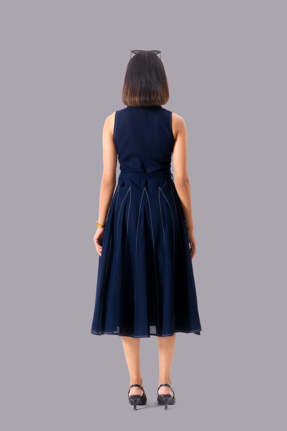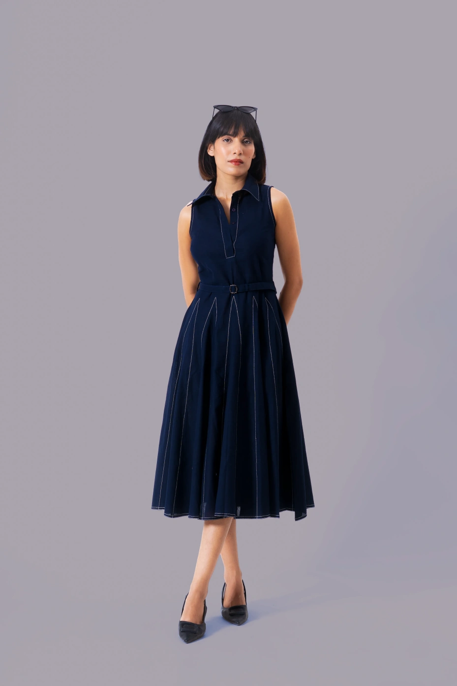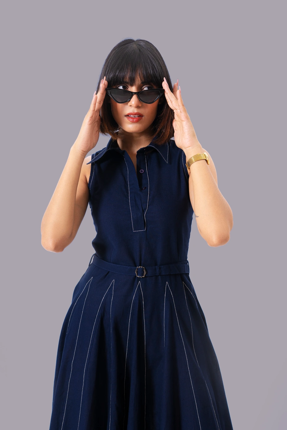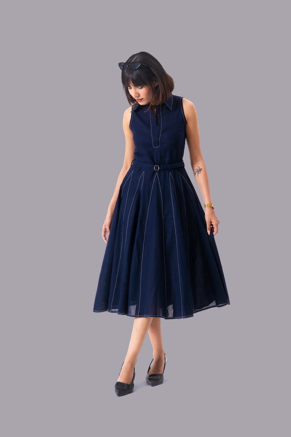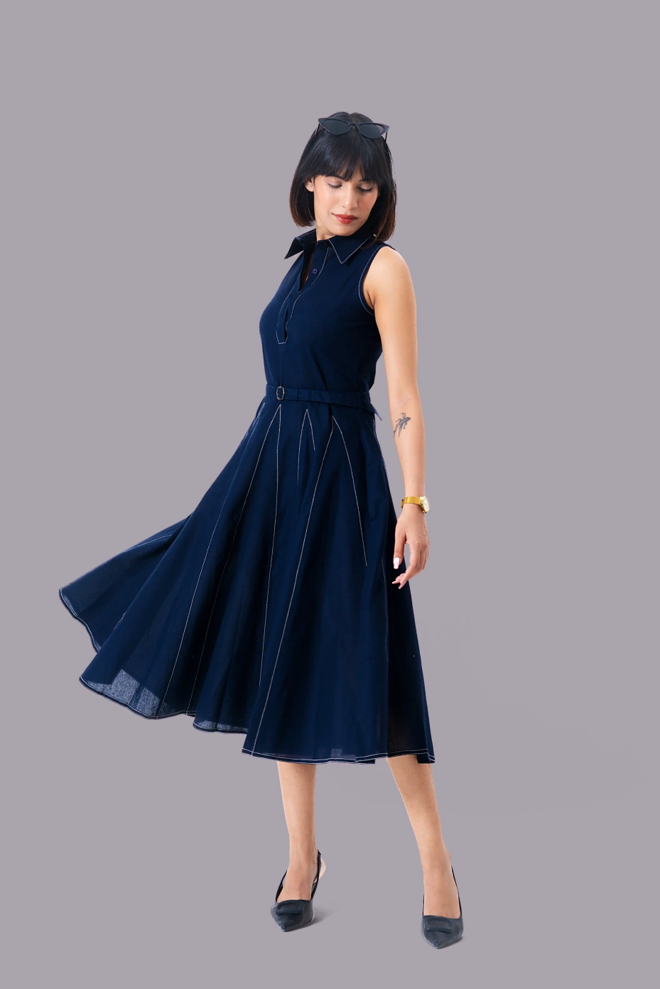 Handle the whirlwind of events with ease in this blue fit-and-flare formal dress. It features a polished panel collar, a sleeveless cut, detachable belt, and a flattering fit-and-flare silhouette. This calf-length dress brings versatility to your work wardrobe. Flaunt the desk-to-dinner look in this women fit and flare dress simply by swapping accessories. Embrace breathability and comfort in this cotton office formal dress.