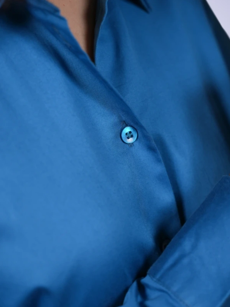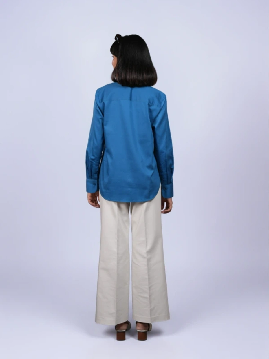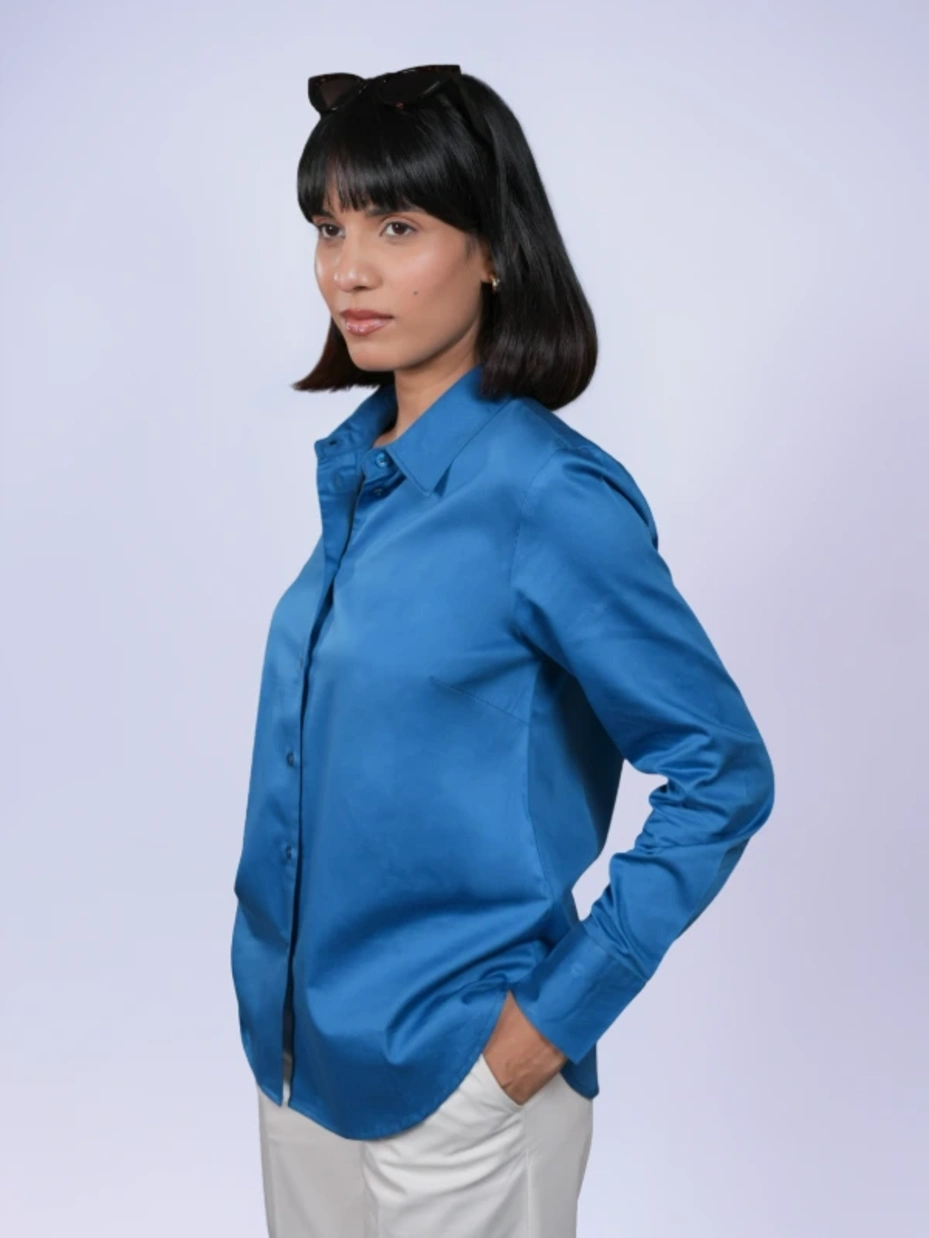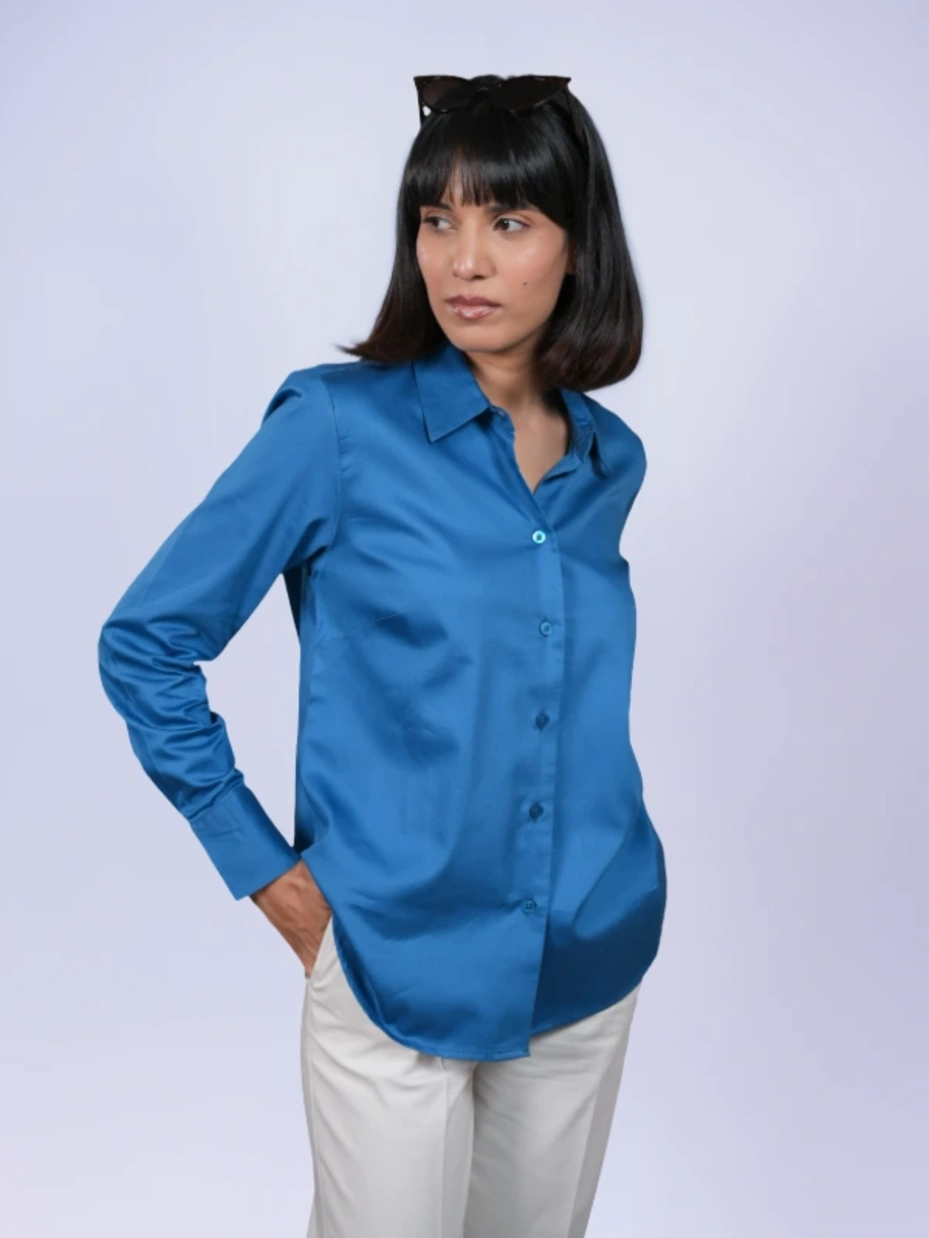 This blue full-sleeve shirt adds a touch of feminine elegance and formal sophistication to your look. Featuring a collar neck, full sleeves, a front open placket, and a yoke at the back to offer a structural fit. Its shine and flowy drape in a cotton-satin fabric make it a go-to choice for dusk and dawn looks.