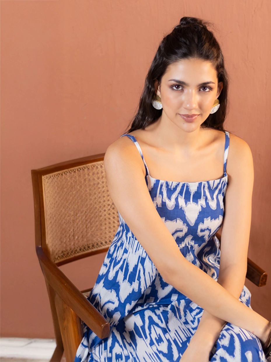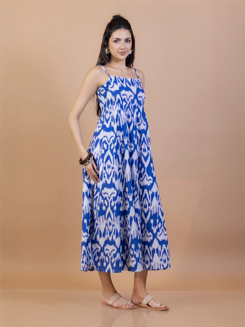 Who says an Indo-western outfit can't be stylish? This blue fit and flare maxi dress with classic all-over Ikat print adds a touch of elegance, while the beautiful silhouette offers a flattering and feminine look. It features a square neck, adjustable straps, pleats from the waist, and side pockets. Embrace the simplicity of this beautiful dress, crafted from soft cotton fabric perfect for summer days and relaxed gatherings.