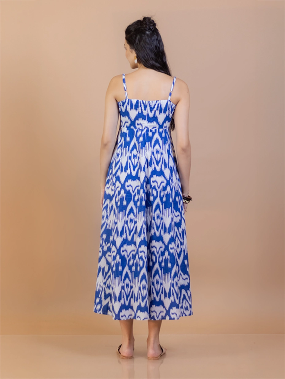 Blue Ikat Cotton Fit and Flare Maxi Dress