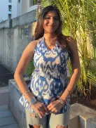 A chic blue short kurti. The Ikat print is lovely. Great for errands or a coffee date. Very modern.