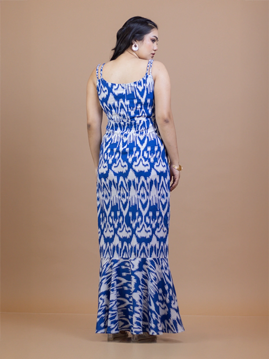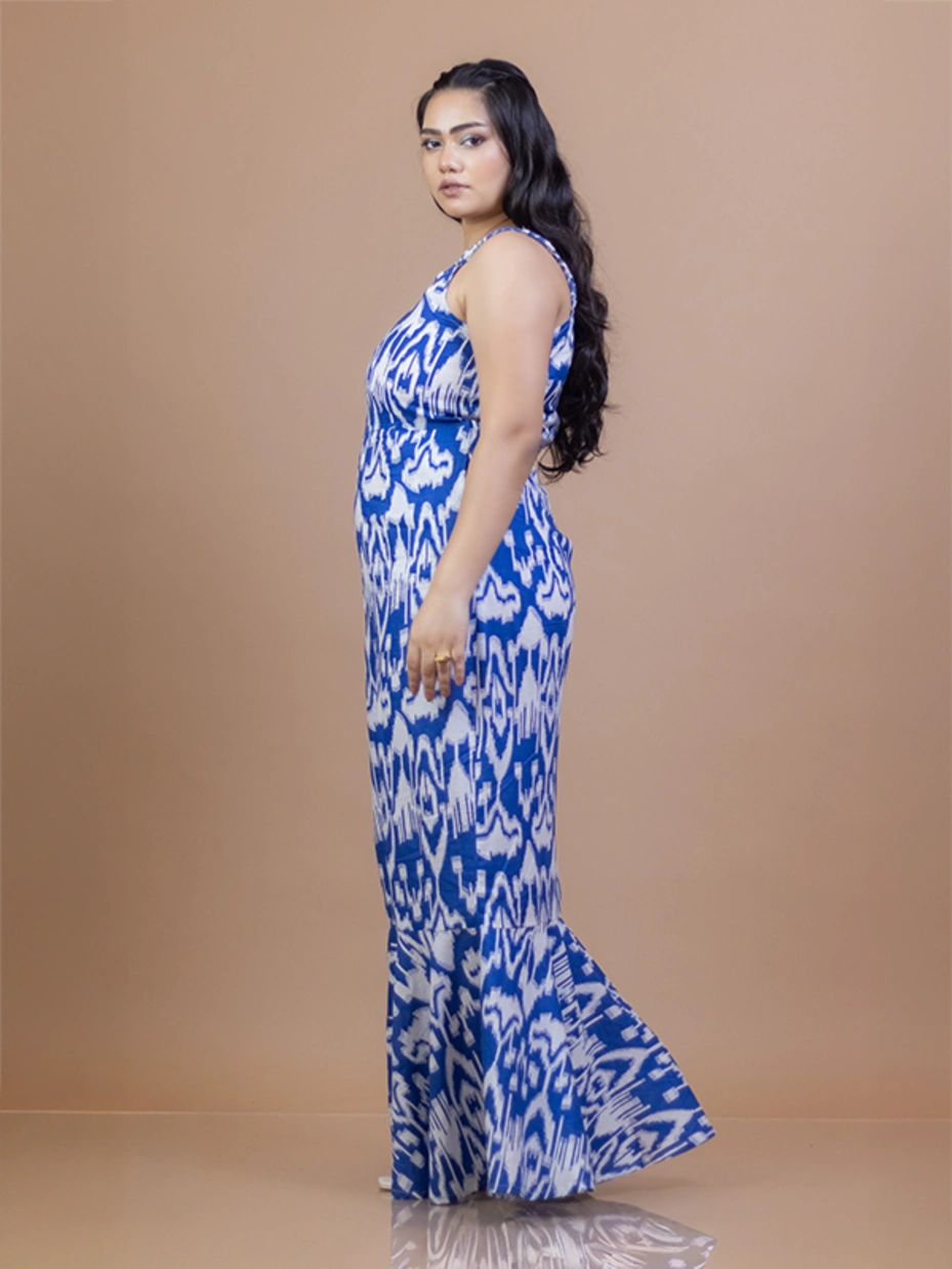 Step into the world of classic prints and contemporary grace in this blue all-over Ikat print mermaid maxi dress. It features a square neck, braided strap sleeves, and a striking mermaid cut on the hem. Redefine your wardrobe with this long maxi dress crafted from soft, pure cotton fabric to create a comfortable fit and a flattering look, perfect for socializing.