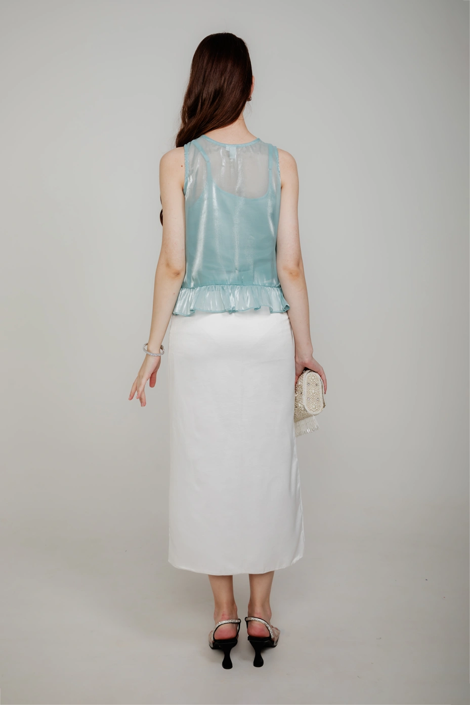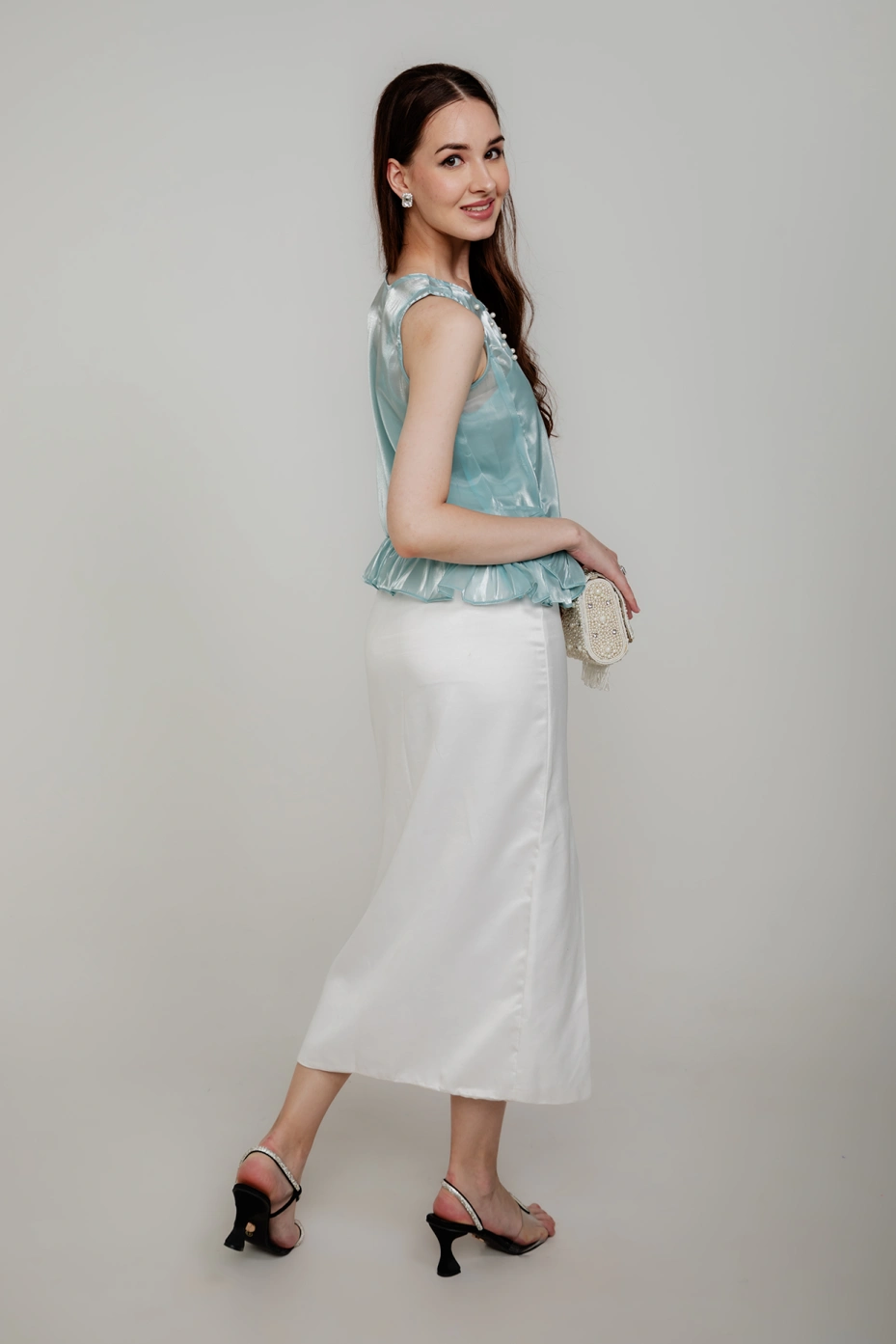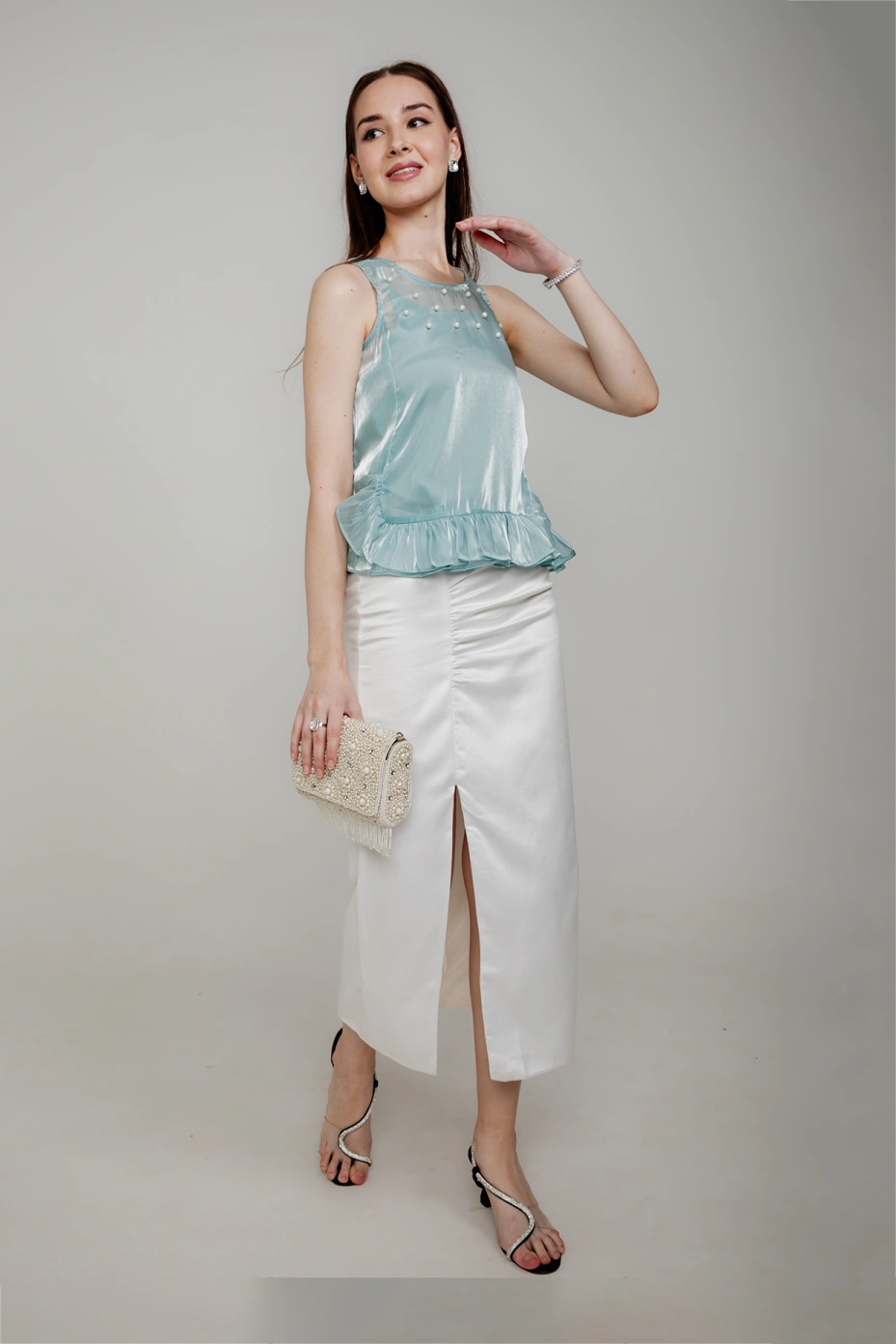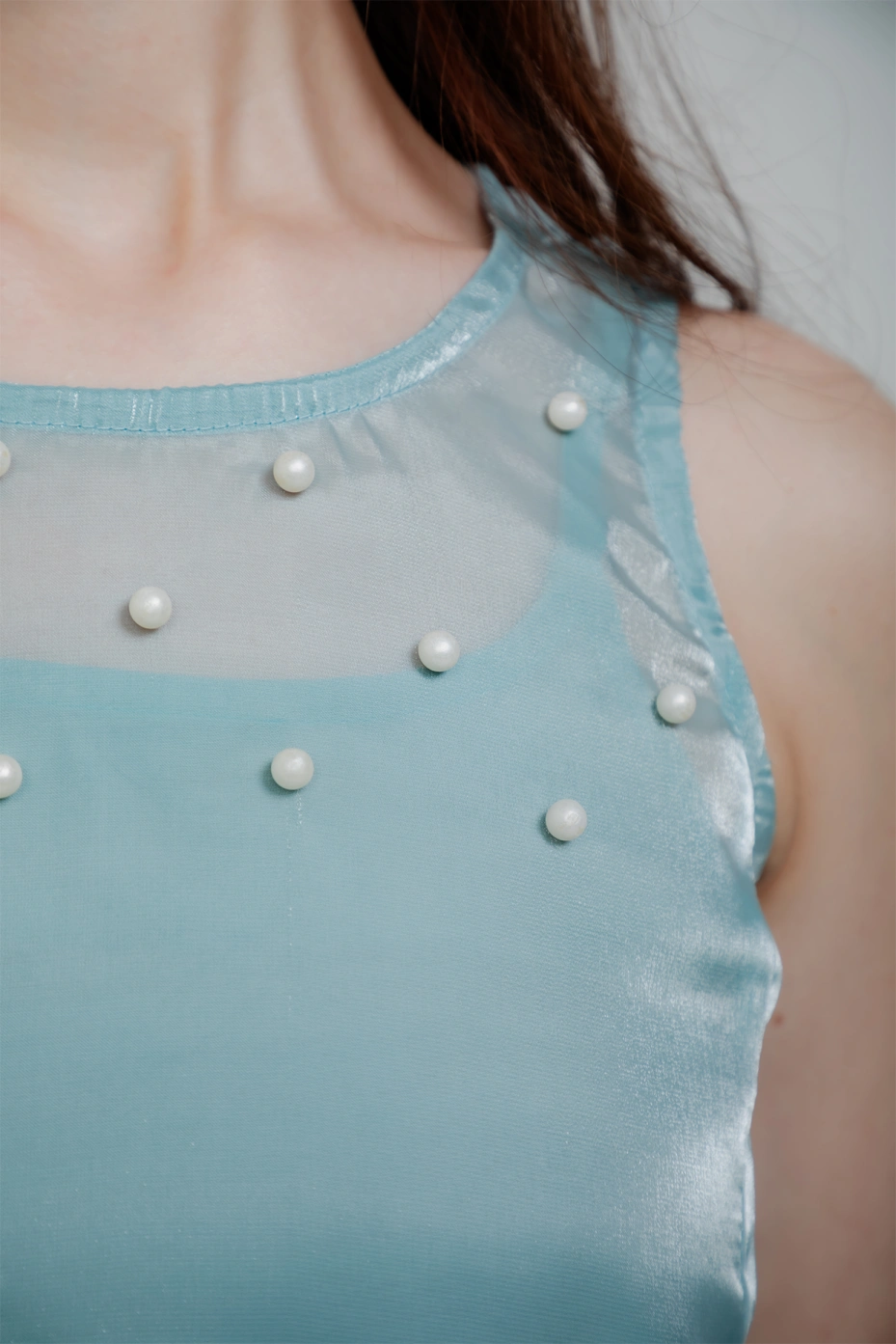 Shine in timeless sophistication with this Blue Organza Top, inspired by the magical hues of the northern lights, Aurora. Designed to captivate, it features a round neckline adorned with delicate pearl details, a chic sleeveless style, and a playful ruffle at the hemline for a touch of flair. Paired with a comfortable Santoon camisole, this top beautifully balances glam and gloss. Perfect for creating standout party looks, this organza masterpiece is your key to effortless elegance and charm.