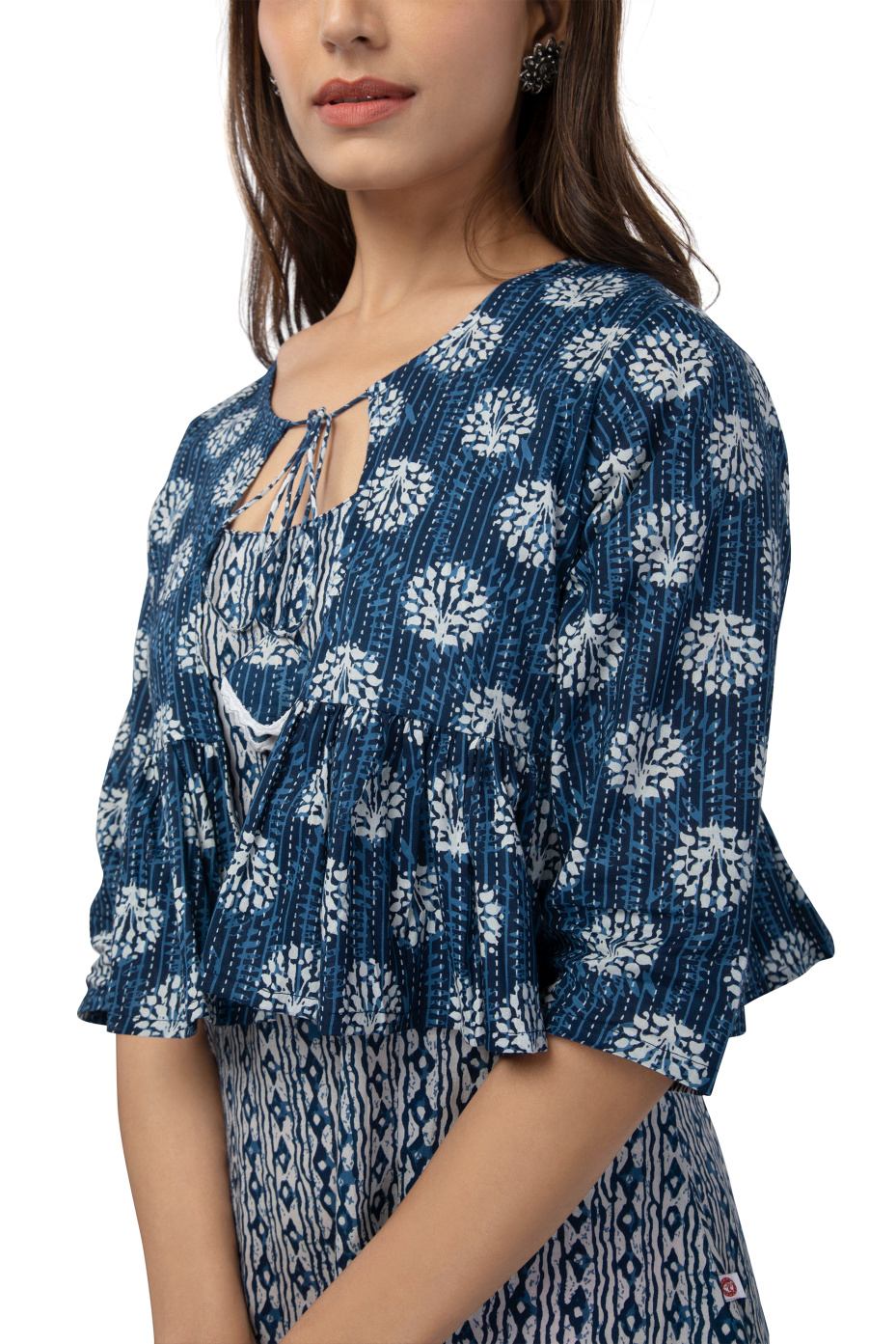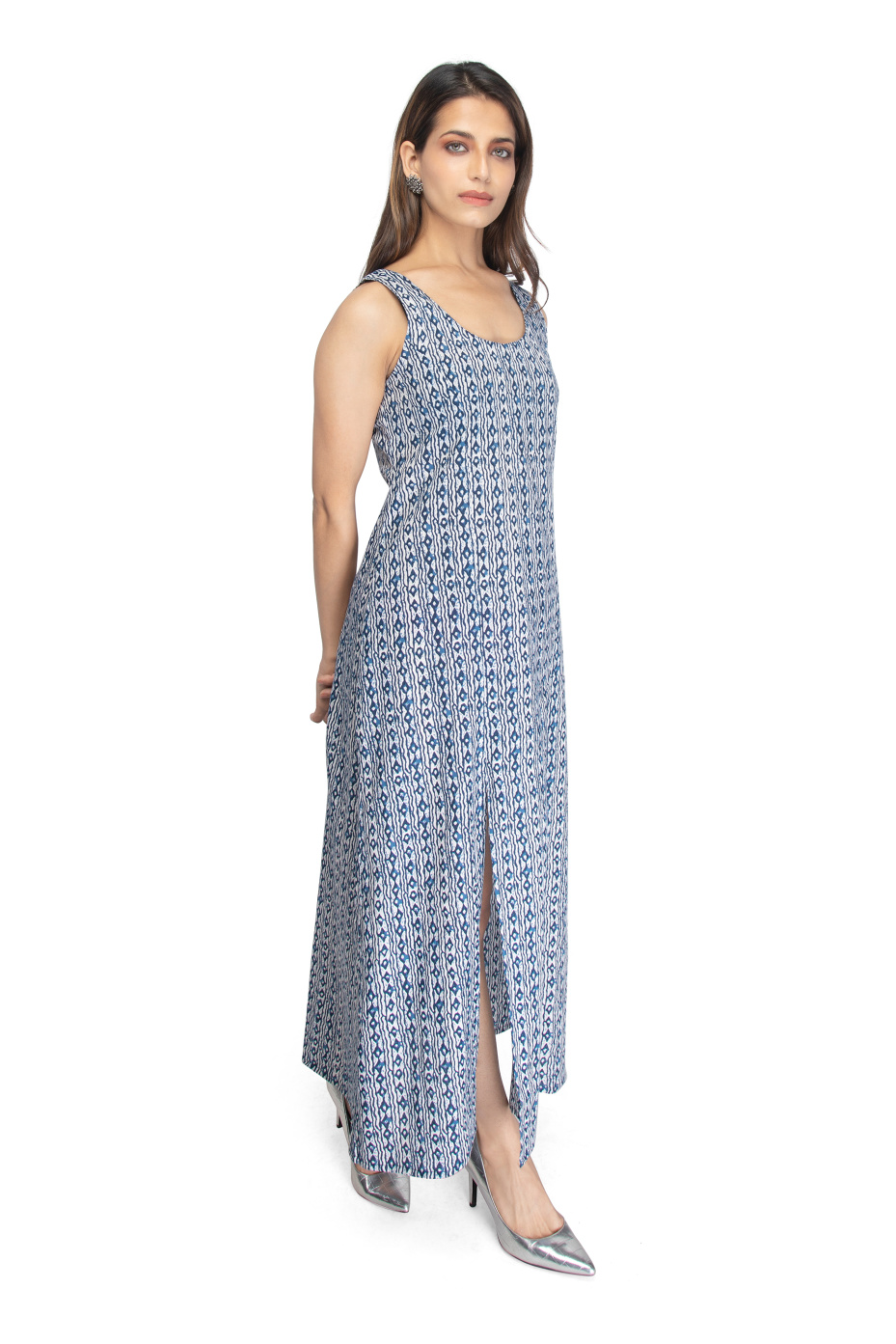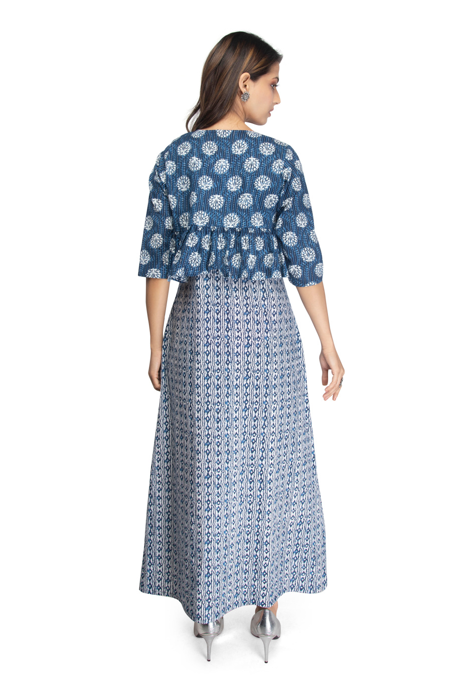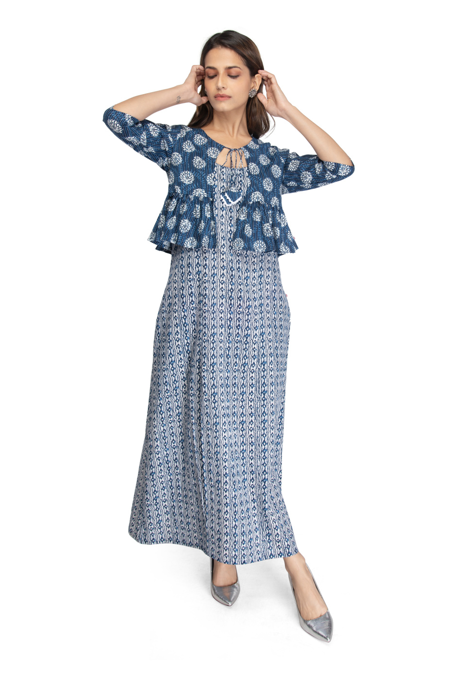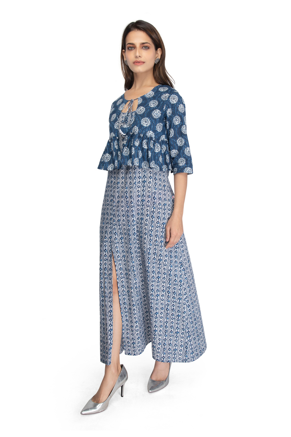 Blue Princess Cut Slit Pairing Dress With Pleated Shrug