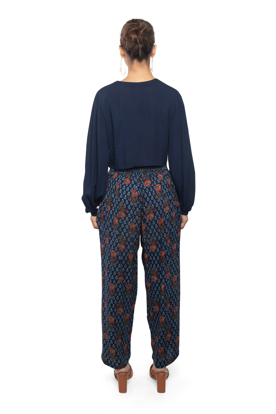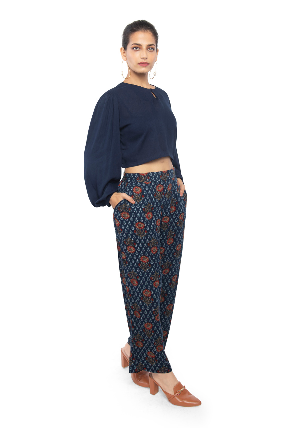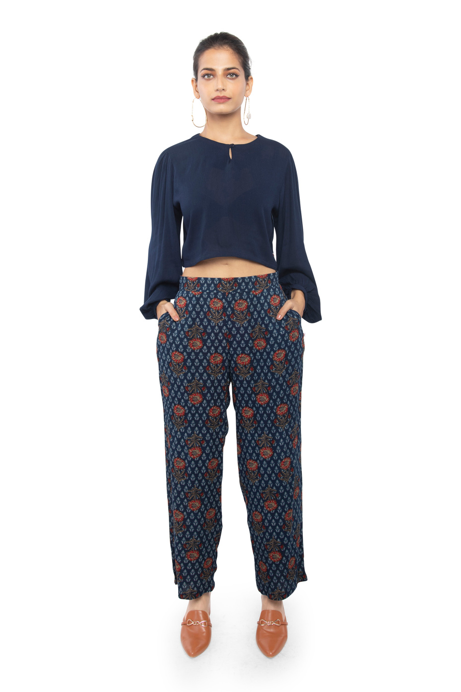 A comfy style relaxed fitted cotton co-ord set is all you need for your next friend's get-together. This handcrafted style contains, a solid crop top and indigo floral flared pants. Upstyle your look by pairing contrasting shade pumps, a structured handheld bag, and hoop earrings.