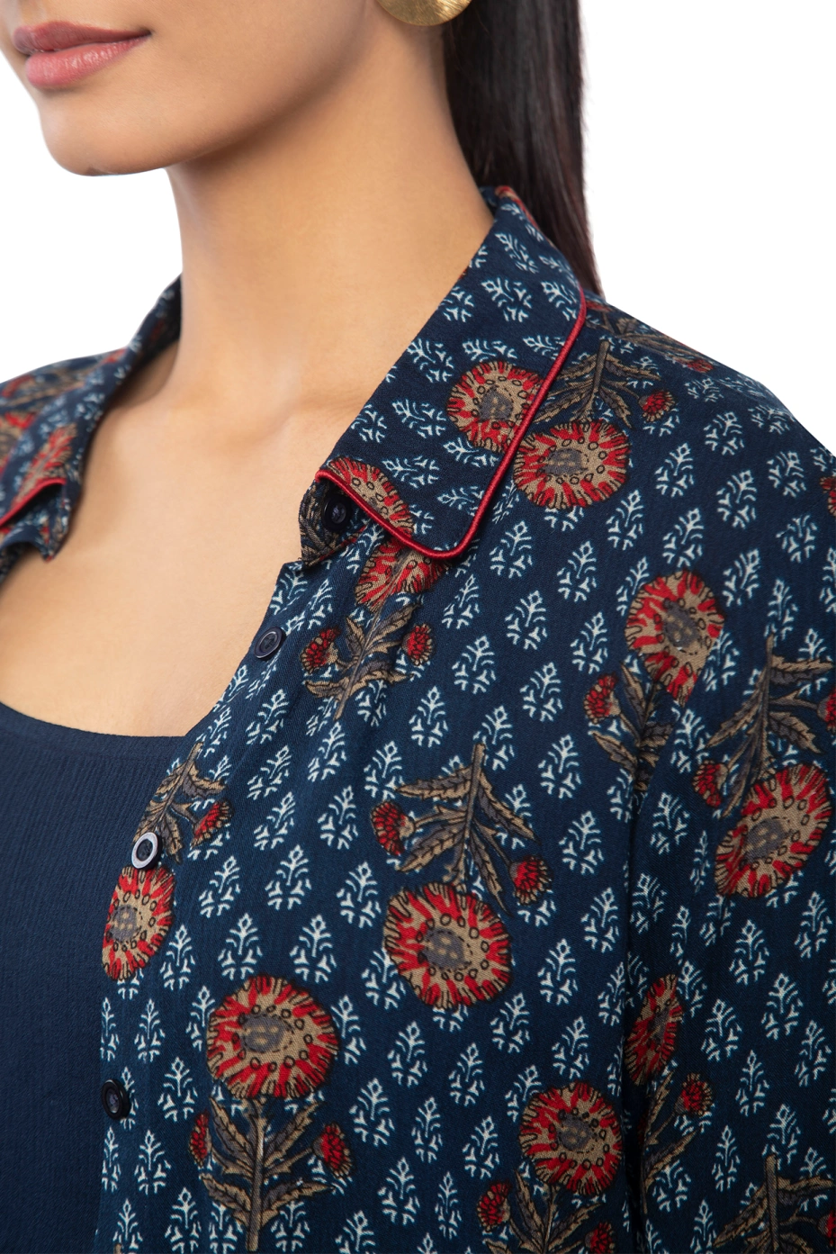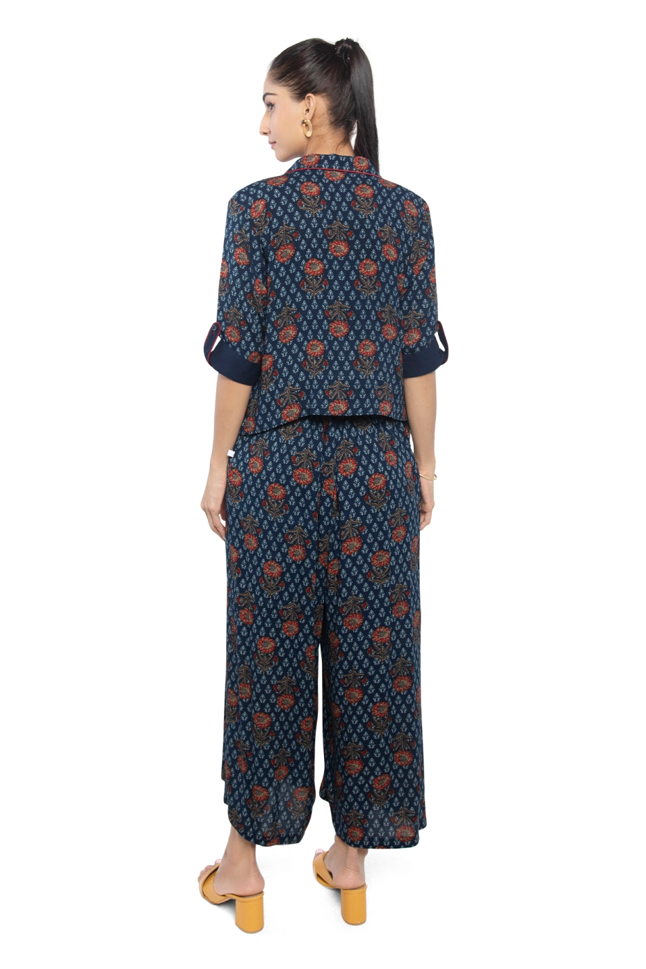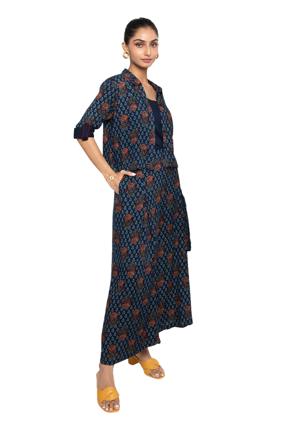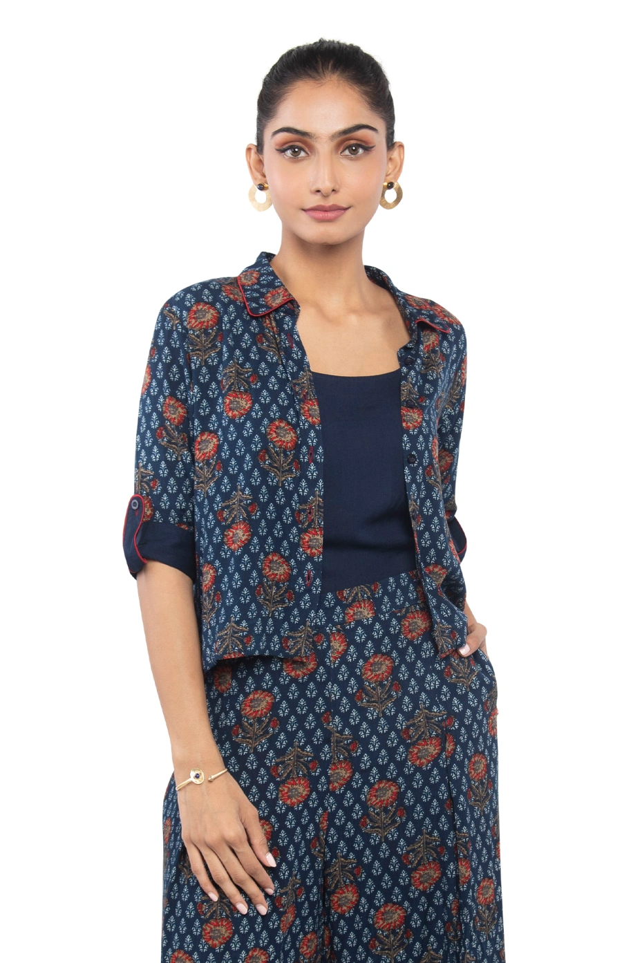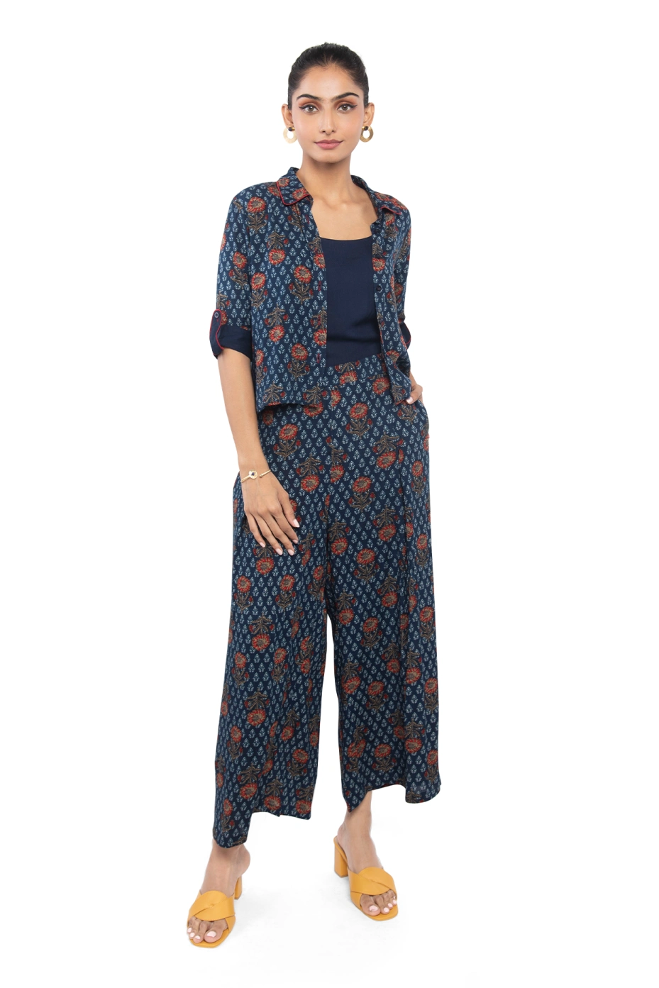 Add this stylish piece to your wardrobe. This handmade style is designed to meet the needs of modern Indian women. The extremely versatile outfit features an indigo floral, solid camisole top, and straight pants. It is a three-piece set with a pure Viscose fabric. Add a statement touch with Navy blue platform wedges, a sling bag, and hoop earrings.