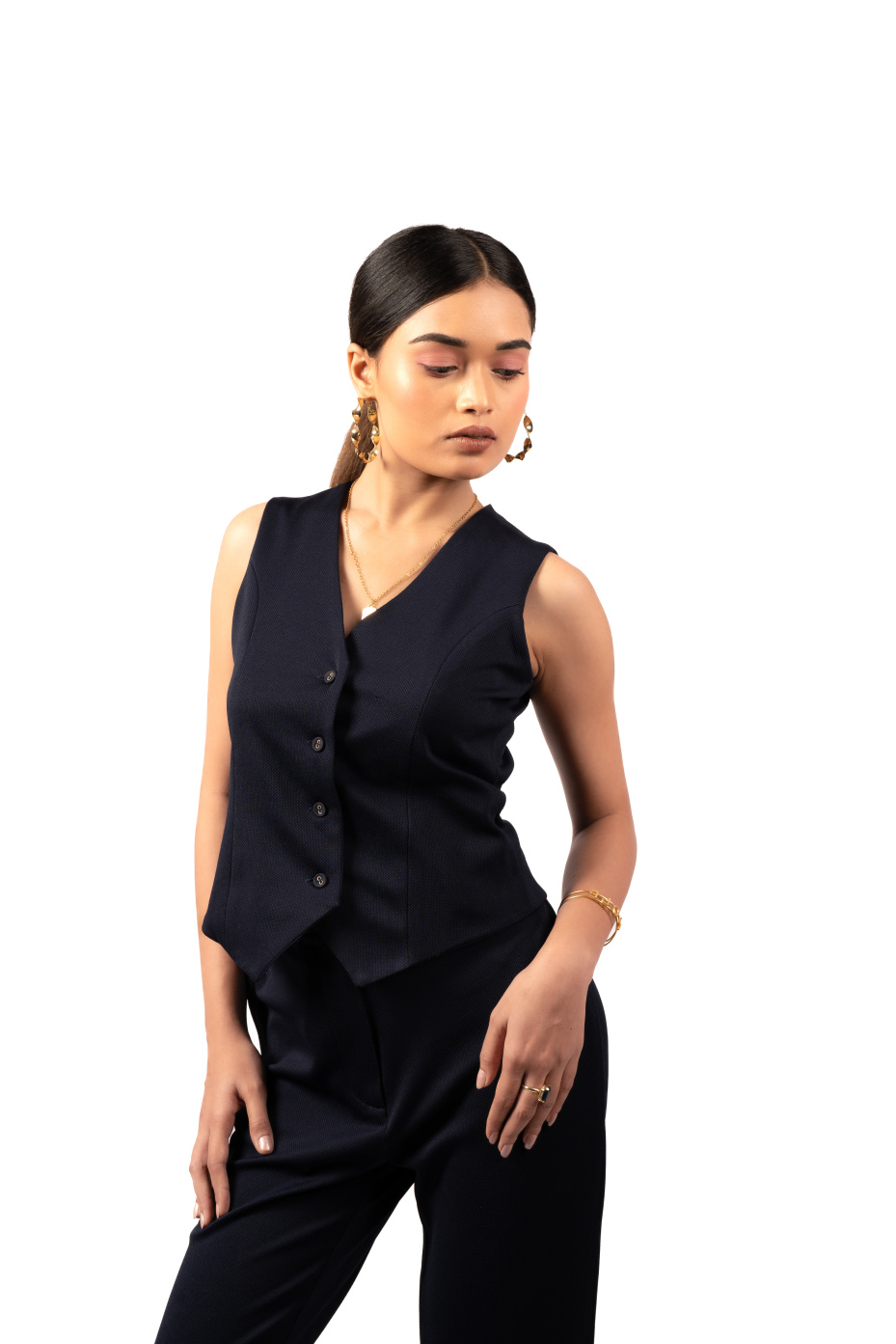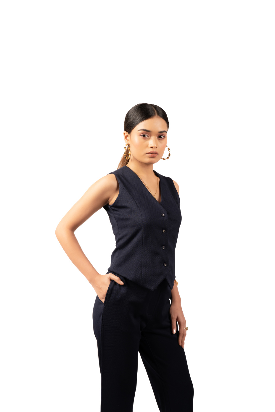 Elevate your AM to PM look with this waistcoat and trousers co-ord set. The top features a V-neck, sleeveless design, and slim fit. The bottom features straight-fit trousers with side pockets. Crafted with polyester elastine fabric, it ensures softness and long-lasting comfort. Style it with gold hoop earrings and beige heels for an office-ready look.