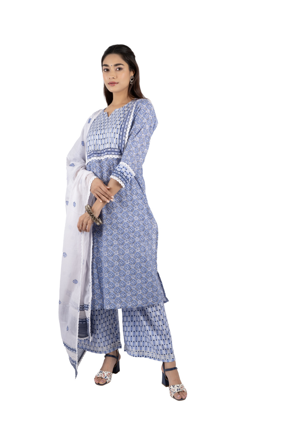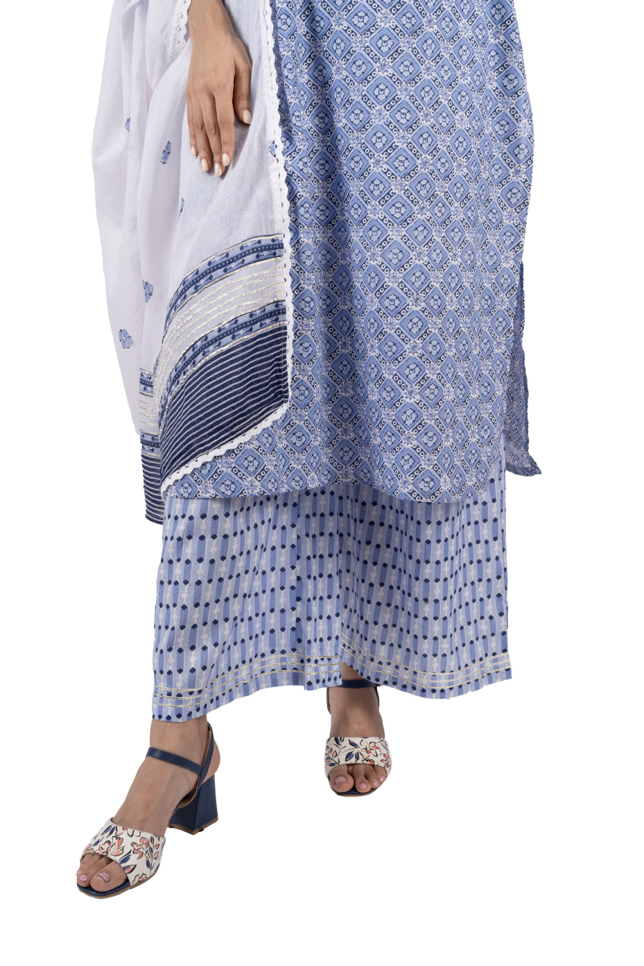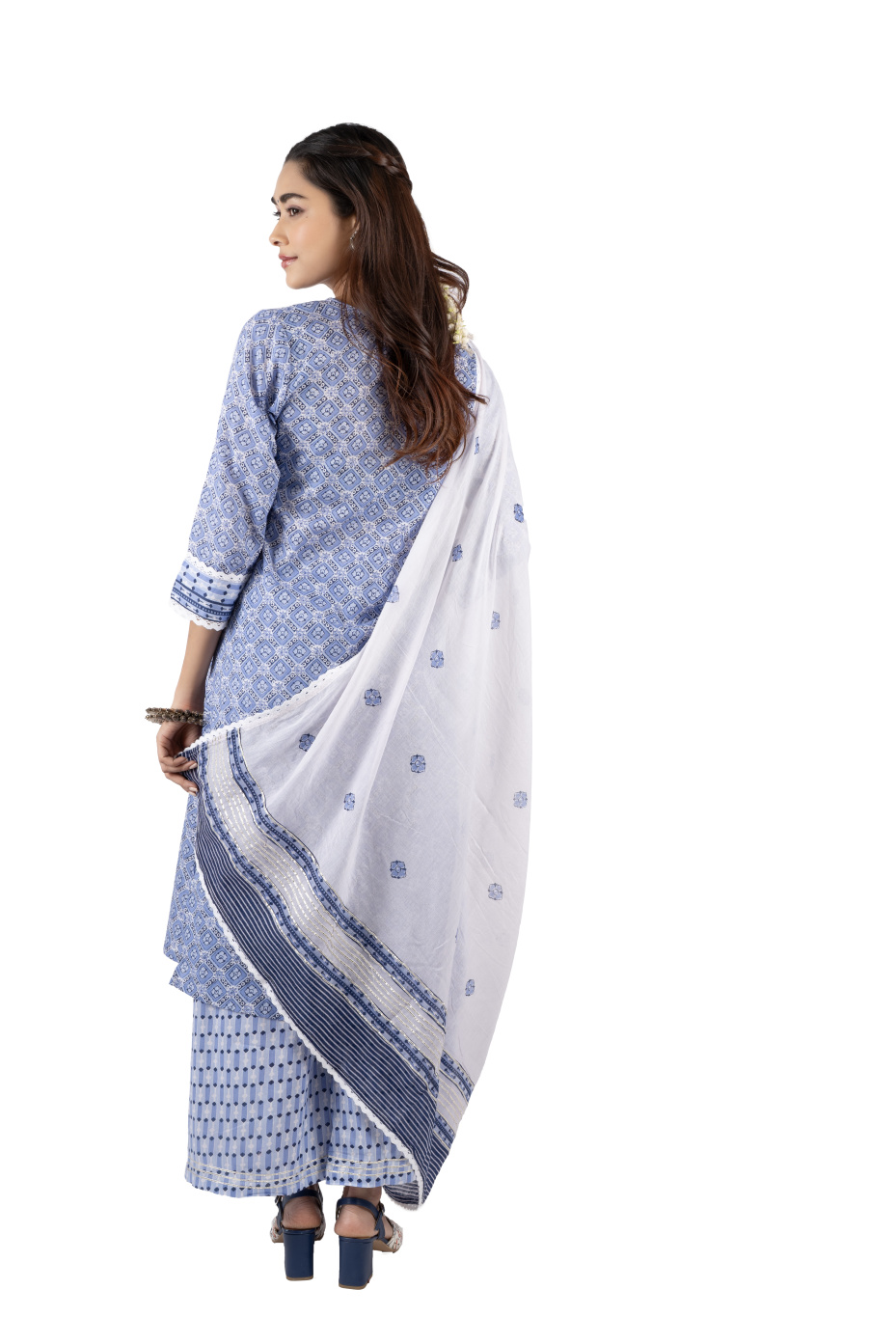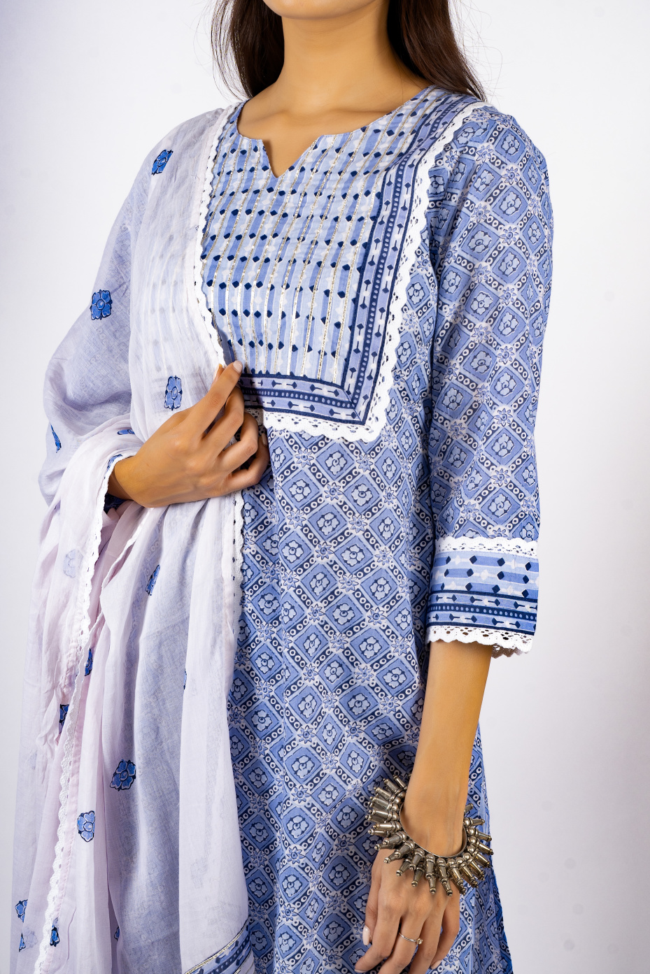 Blue Yoke Printed Cotton Kurta Set With Dupatta