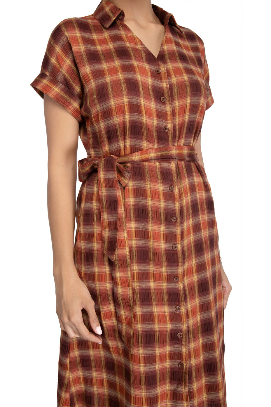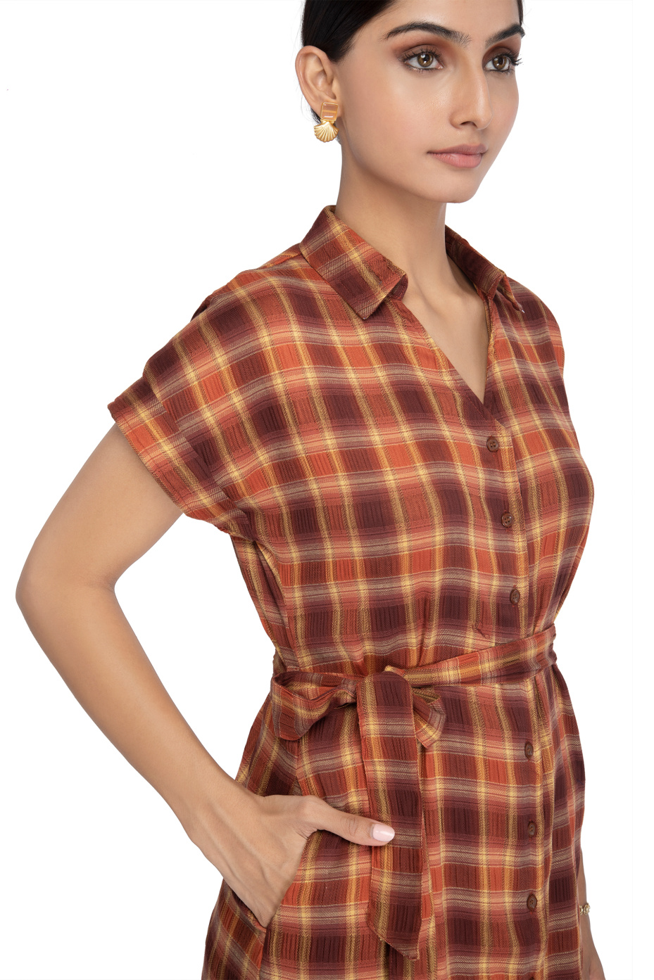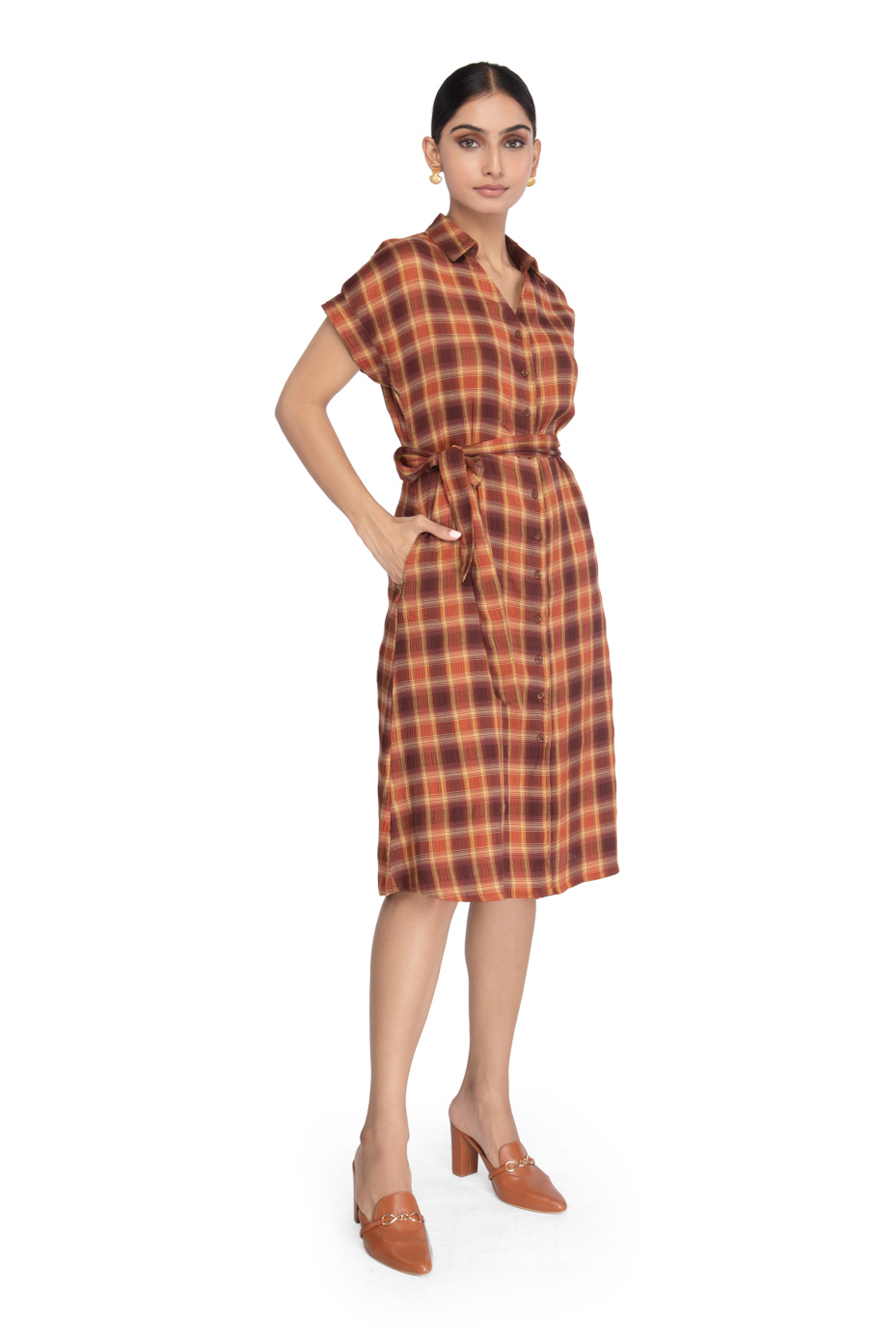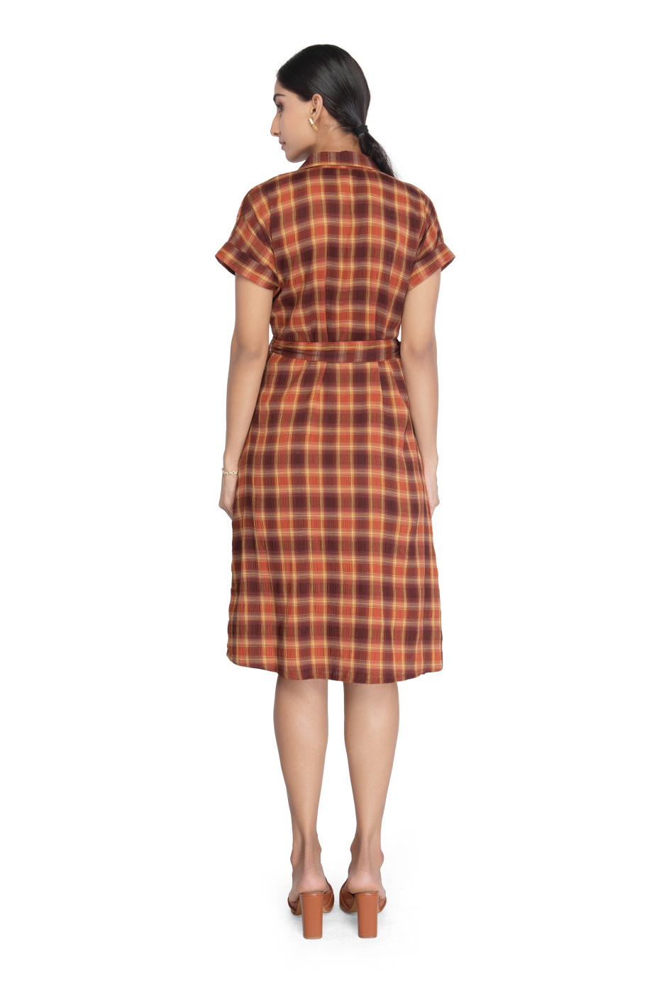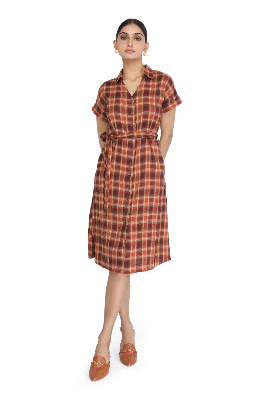 Discover charm and grace for your workwear with this checked dress. It features a checked pattern, collared neck, A-line fit, and knee length. The fabric used is Cotton, which is soft and comfortable. Style it by adding block mules and stud earrings.