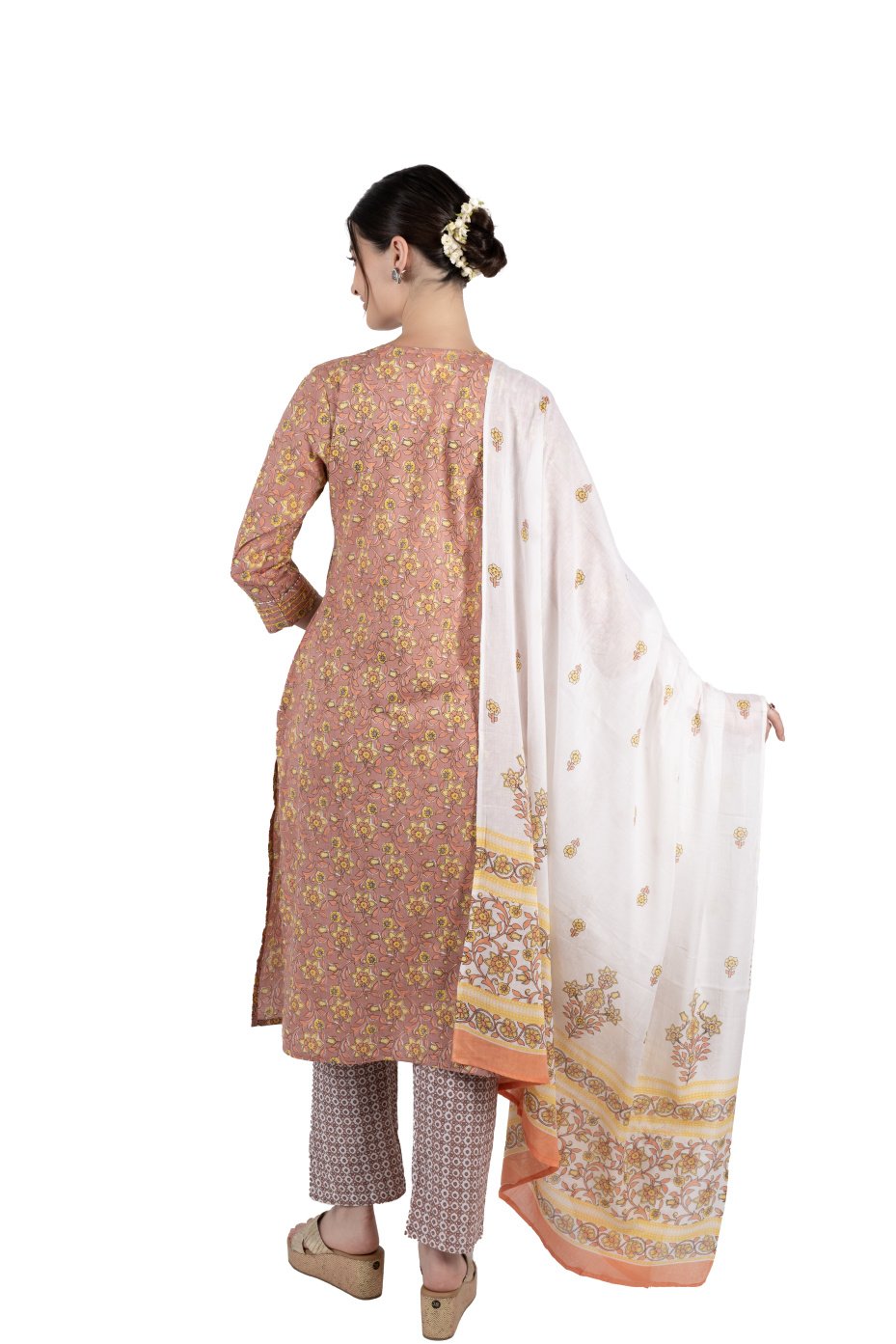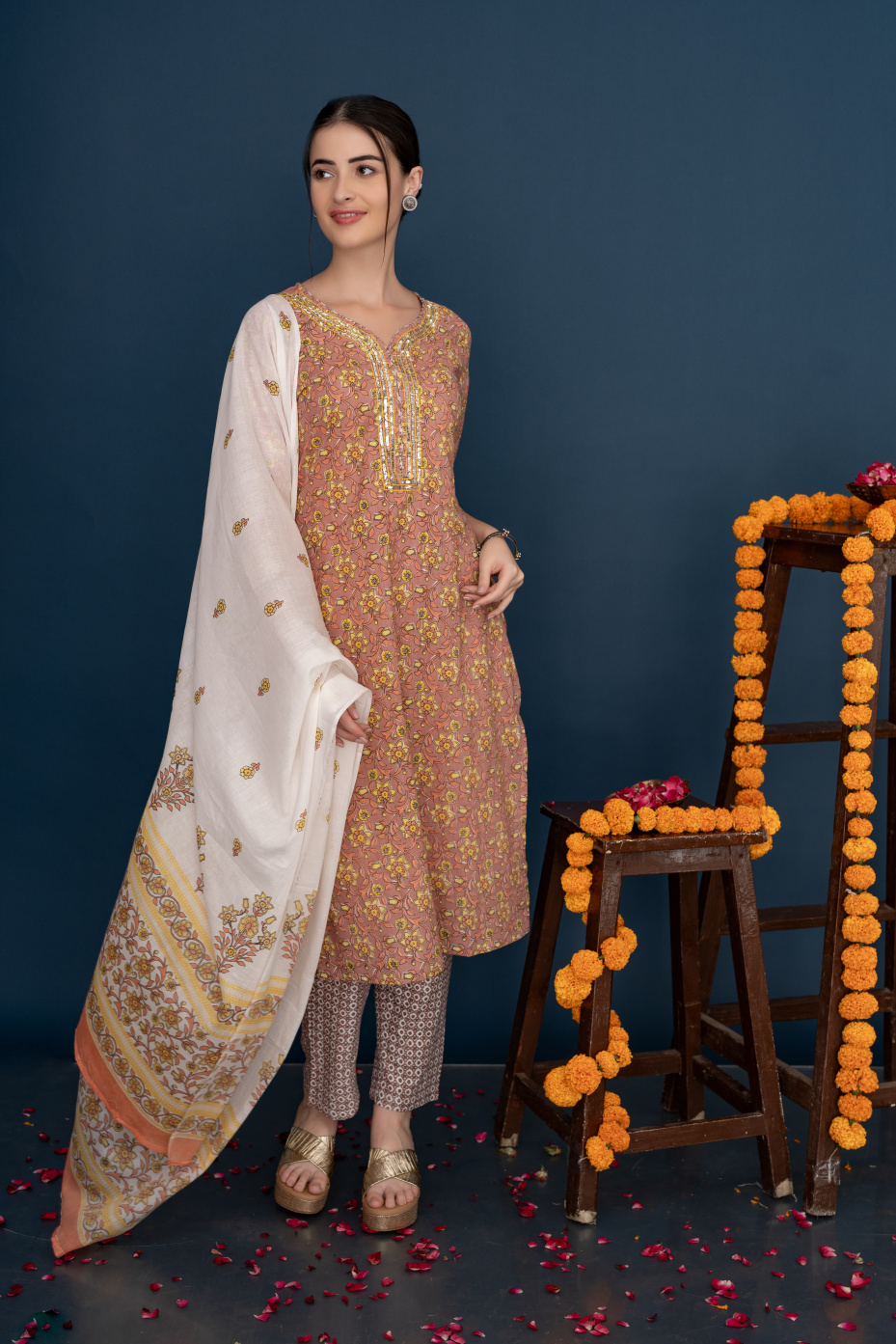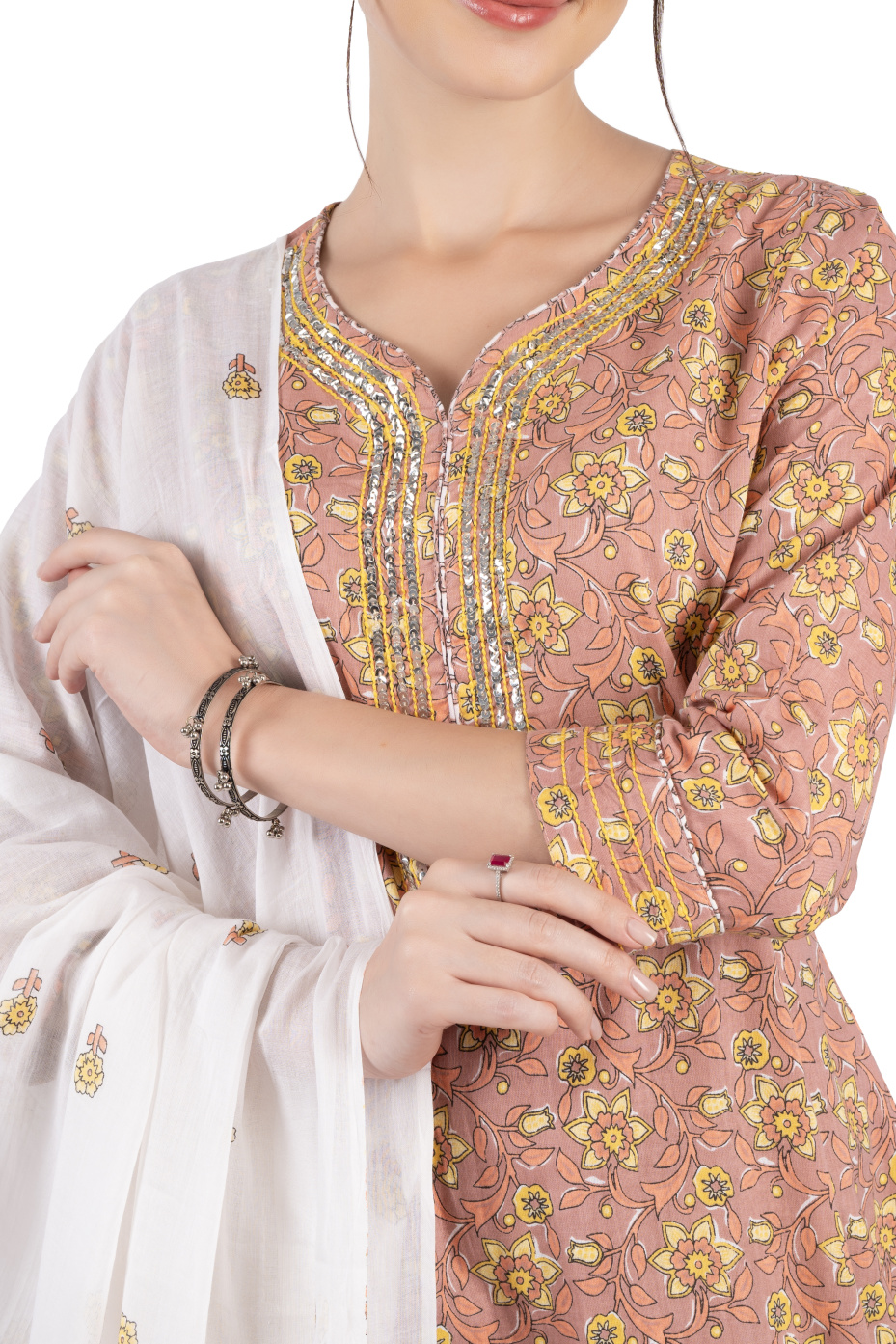 sBrown Floral Print Cotton Kurta Set With Dupatta