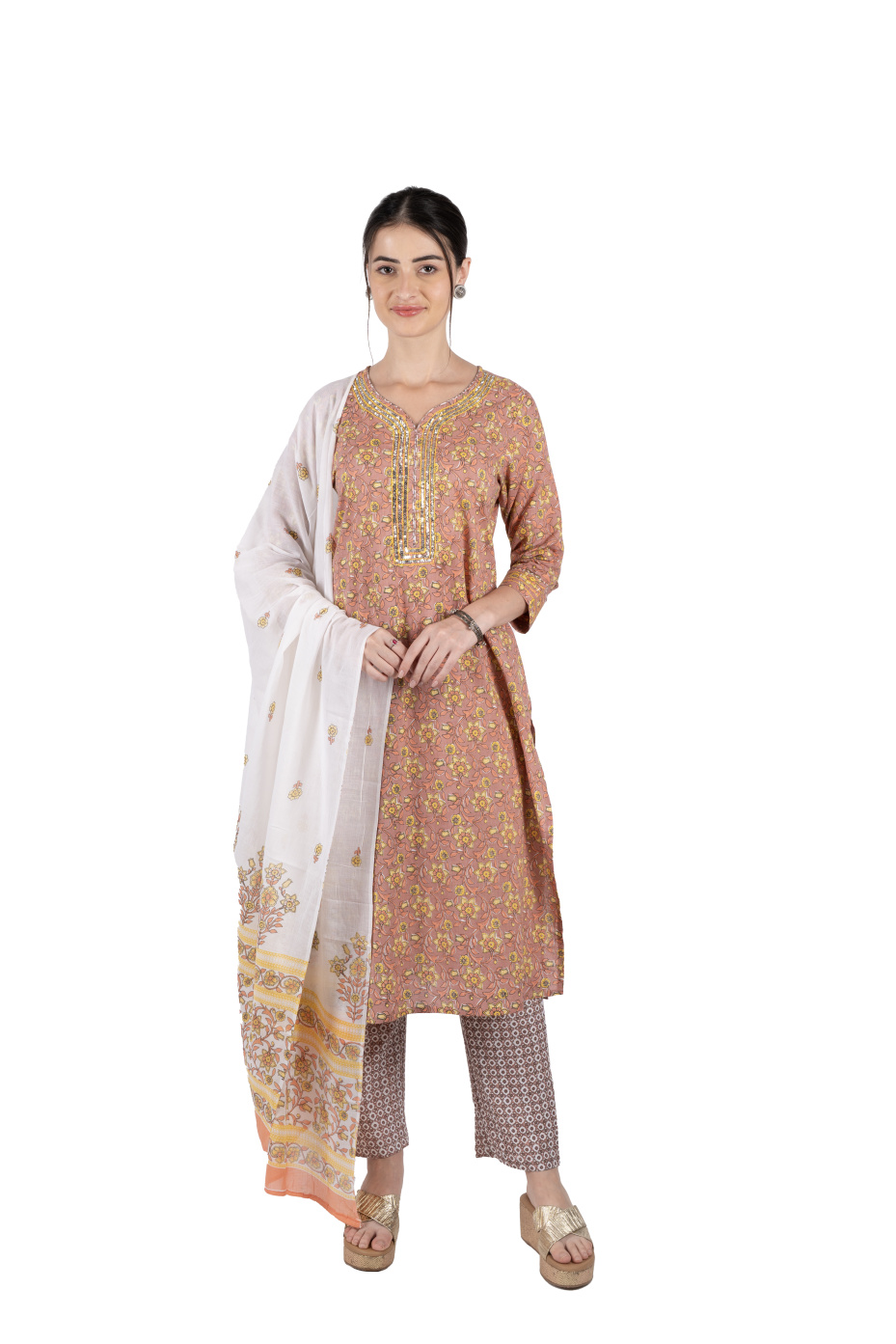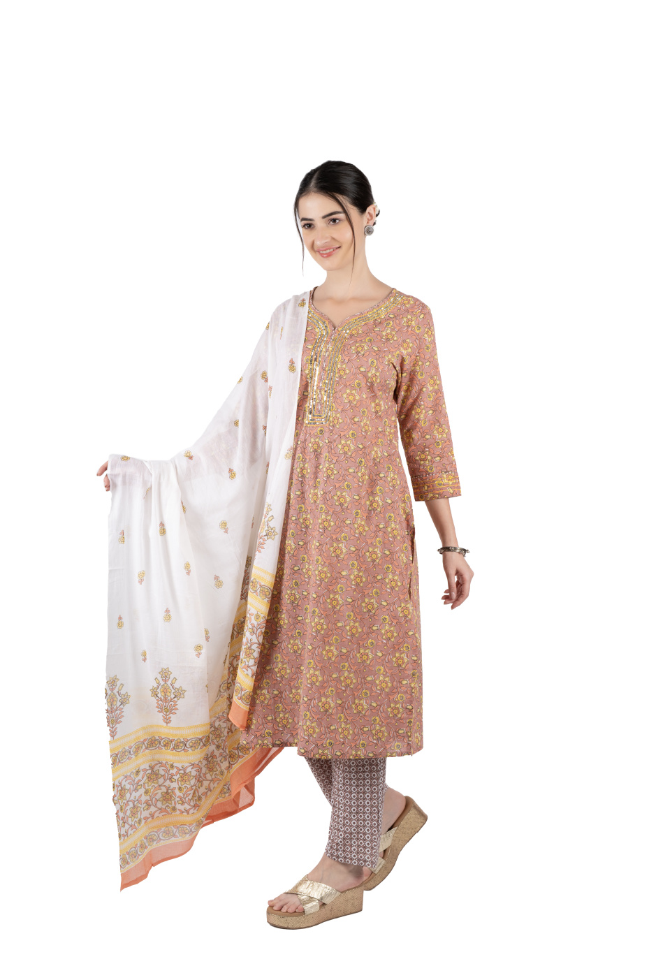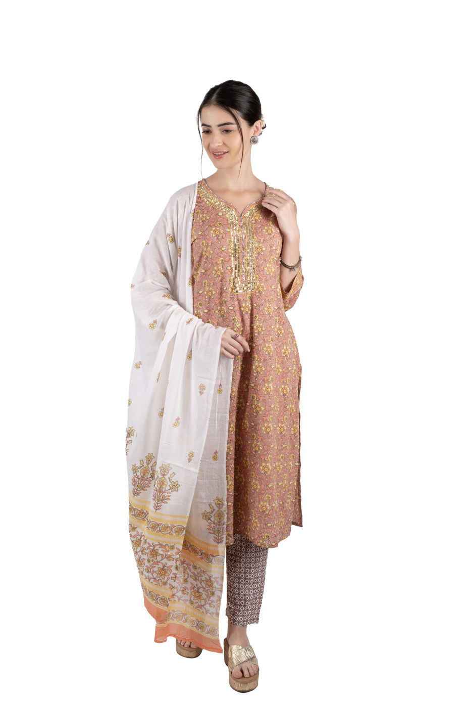 sBrown Floral Print Cotton Kurta Set With Dupatta