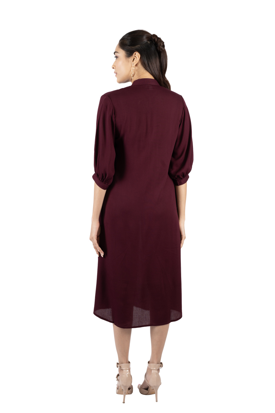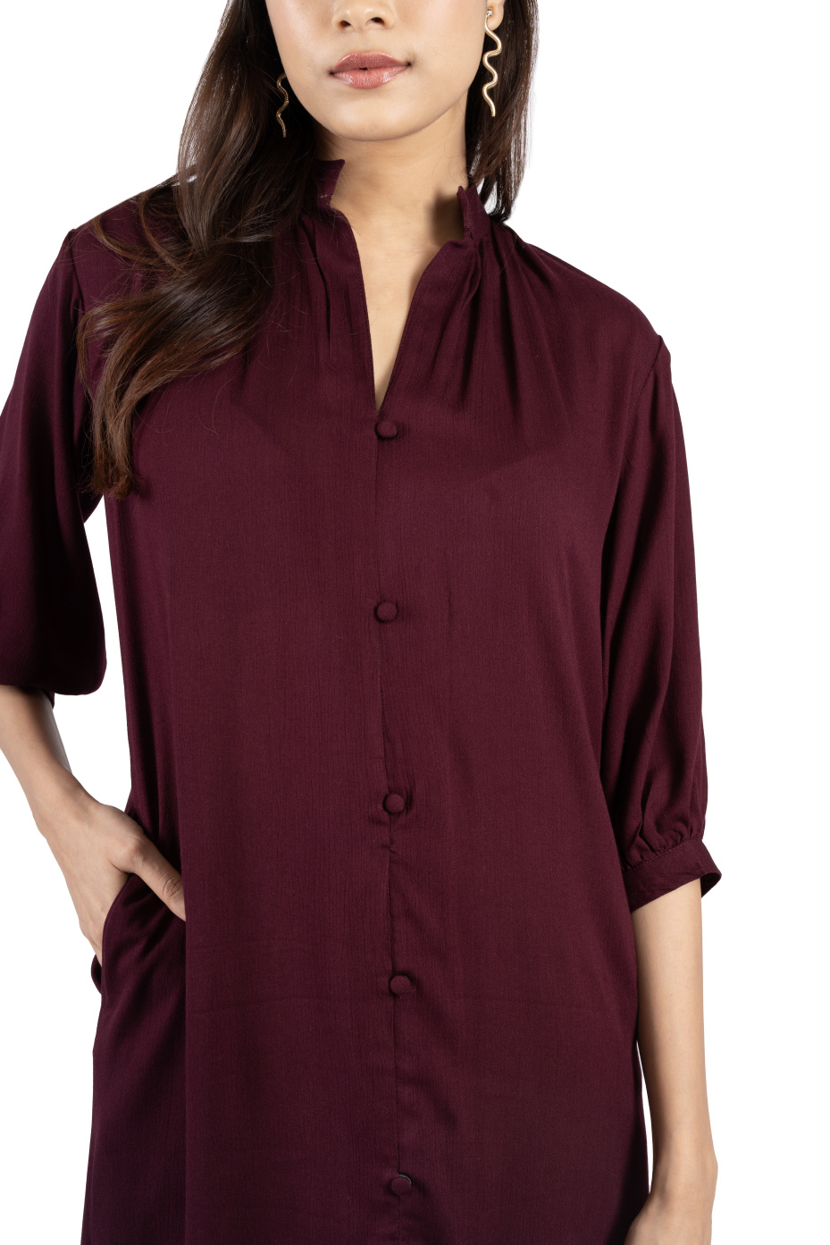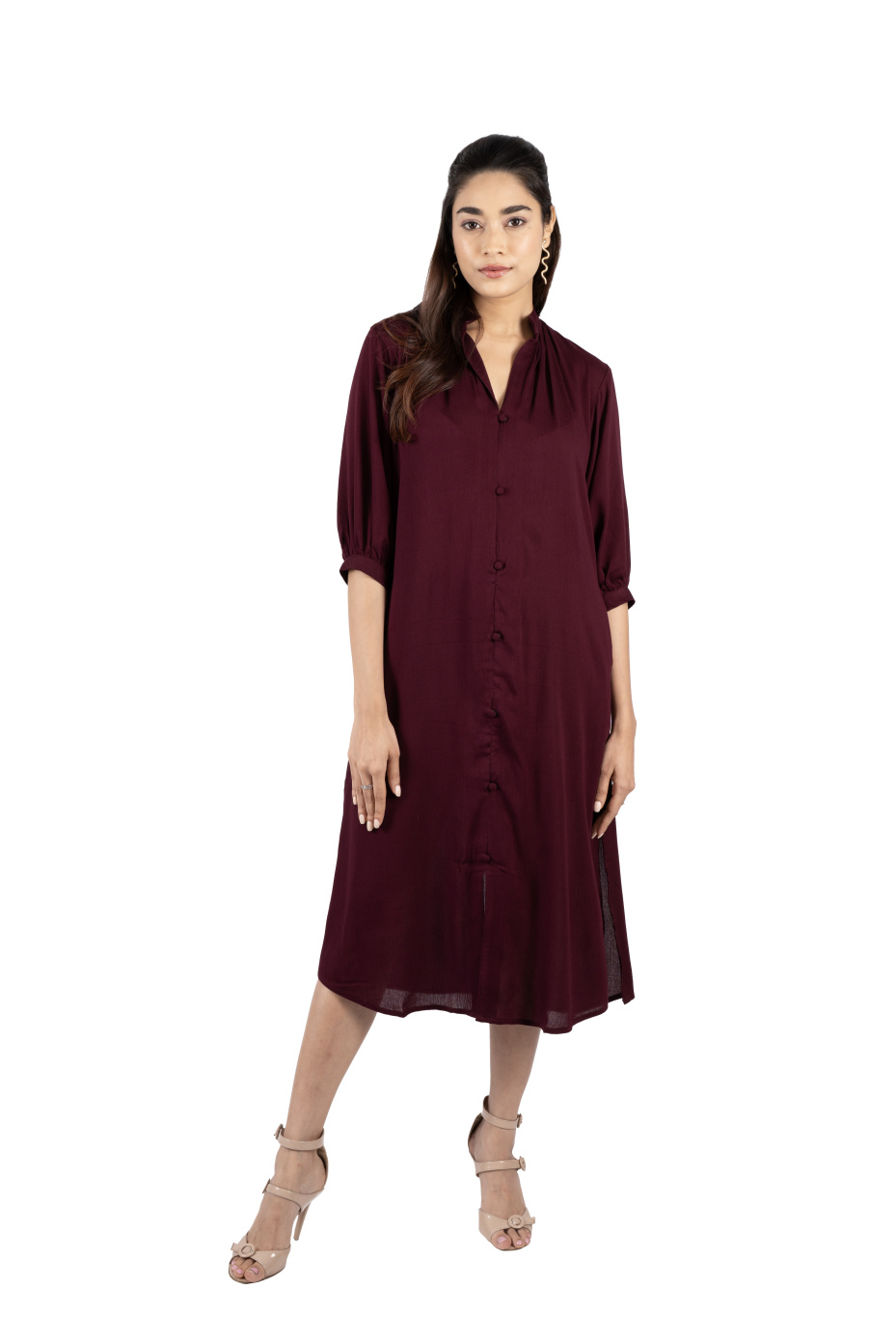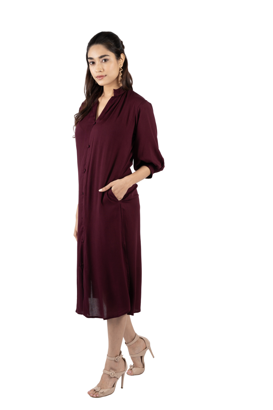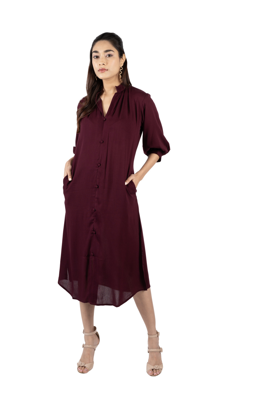 Get ready to slay any outing look in this burgundy shirt dress. It features a Chinese collar neckline, three-quarter bishop sleeves, and side pockets. The hem falls at the calf with front and side slits. Made from high-quality rayon fabric that boasts comfort. Pair it with heels, statement earrings, and sunglasses for a cool summer look.
