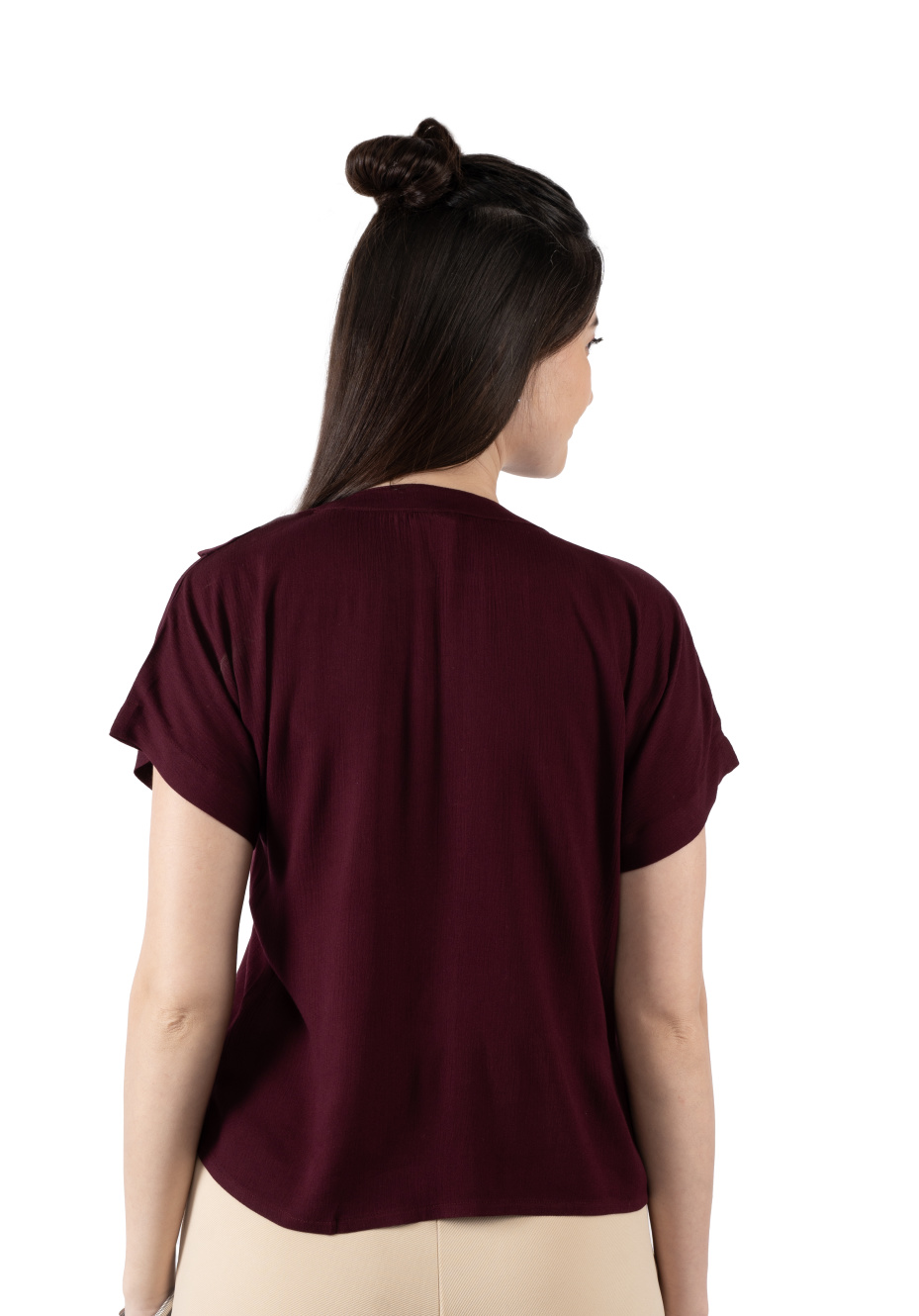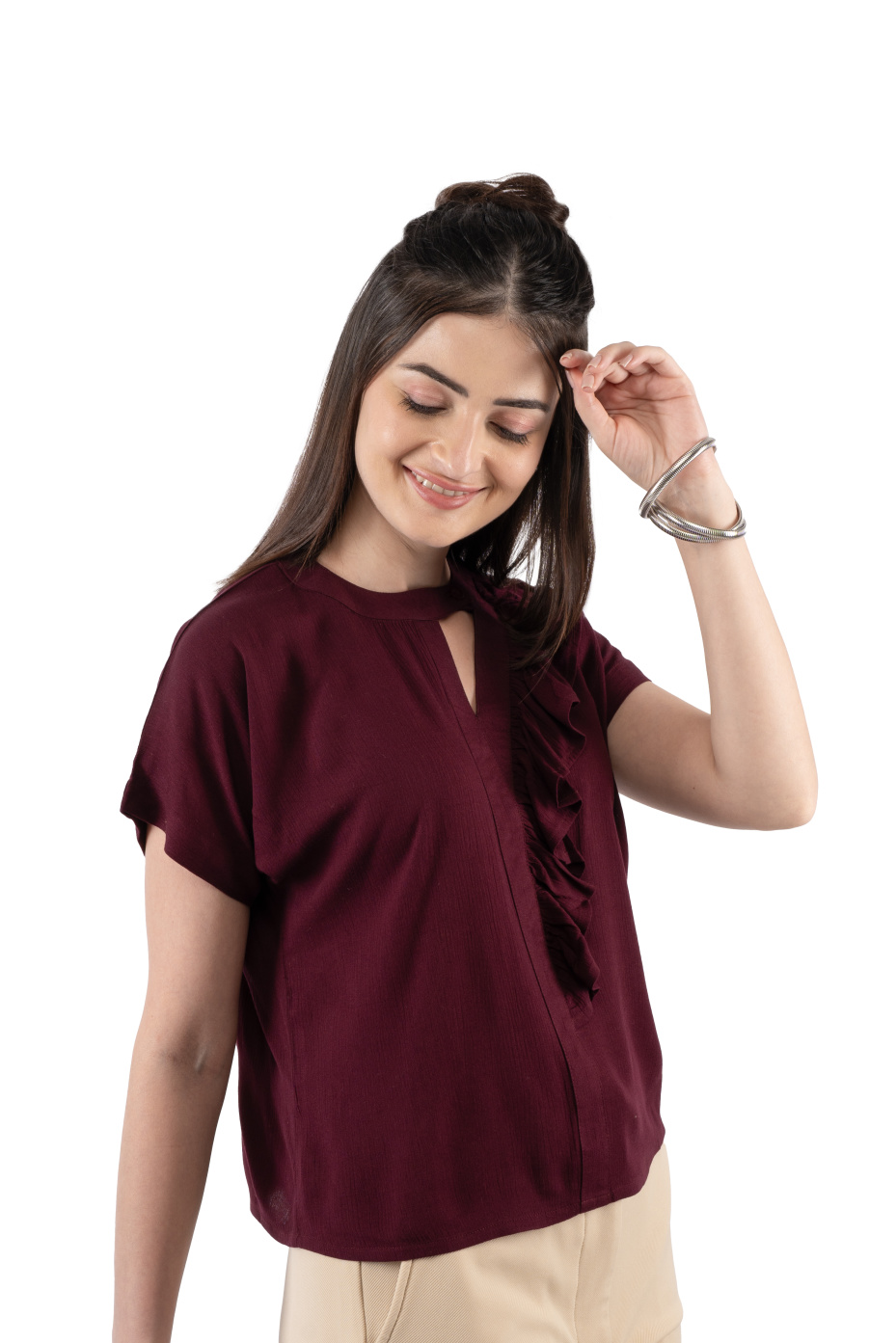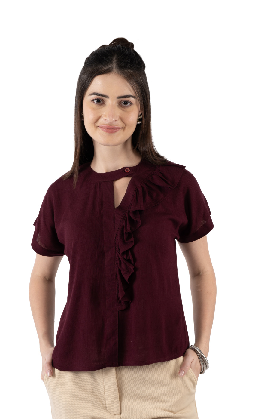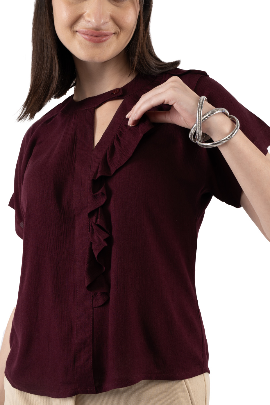 Uplevel your daily office wear with this burgundy solid ruffle top. It features a collar neck, ruffle detail, and a short sleeve. Made from a high-quality rayon fabric that boasts comfort. For a neat look, pair it with beige straight pants, flats, bracelets, studs, and a tote bag.