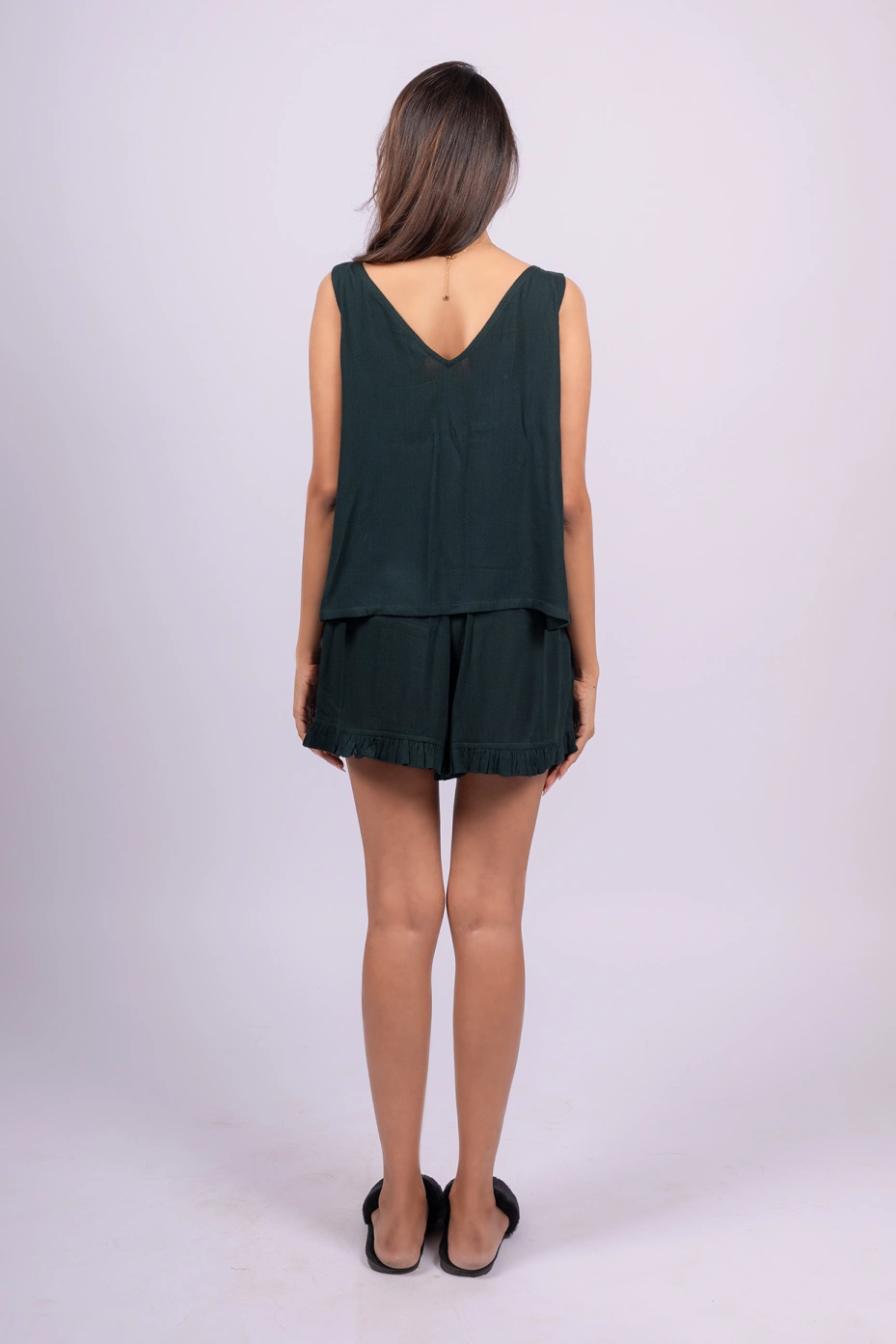 Create a stylish, laid-back look or step-out in style during weekends in this solid womens loungewear. The camisole top features a V-neck, button details, and tie-up strap sleeves. The shorts feature two side pockets and frill details on the hemline. Lounging around has never been so comfy with this matching set made with soft, breathable, and oh-so-stylish viscose fabric.