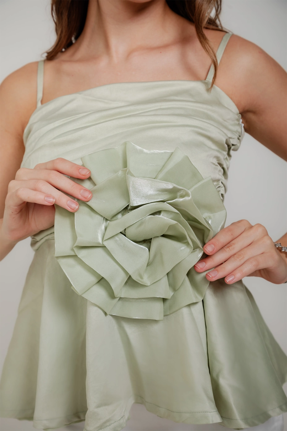 Jazz up your party look with this Women's Corsage Peplum Top, a stunning blend of glamour and elegance inspired by the magical hues of the northern lights, Aurora. Crafted from luxurious green satin, it features a chic square neckline, delicate spaghetti straps, a flared hemline, and a beautifully placed corsage detail at the waist that adds a touch of sophistication. The santoon lining ensures all-night comfort, while the glossy finish exudes a radiant charm. Perfect for evening soirées, cocktails, or celebrations, this top strikes the ideal balance between glam and gloss, making it a standout addition to your party wardrobe.