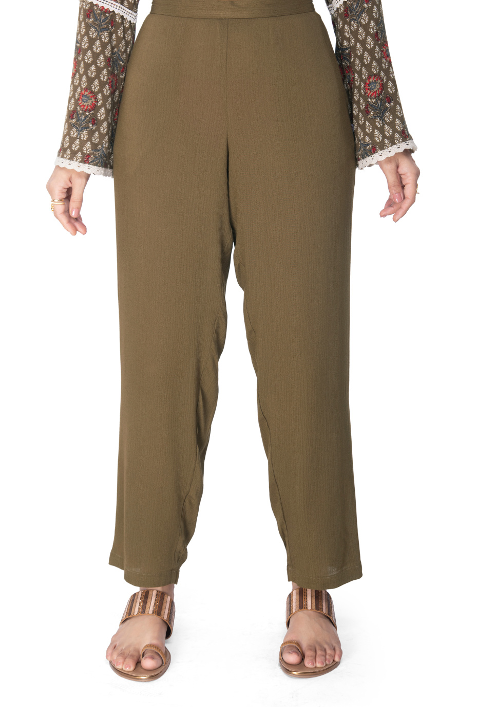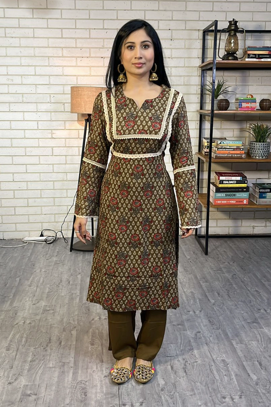 Embrace timeless elegance with this stunning green kurta set, featuring a captivating white front yoke lace that elevates its charm to new heights. This set comes with a pair of matching pants, and the entire outfit can be accessorized with Indian platform wedges and simple eardrops.