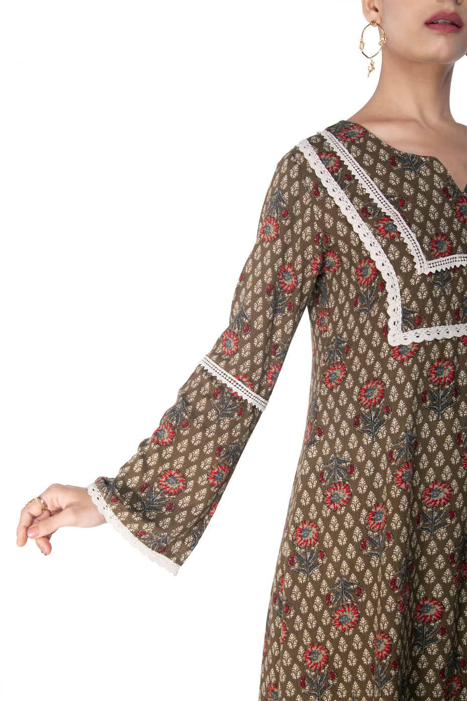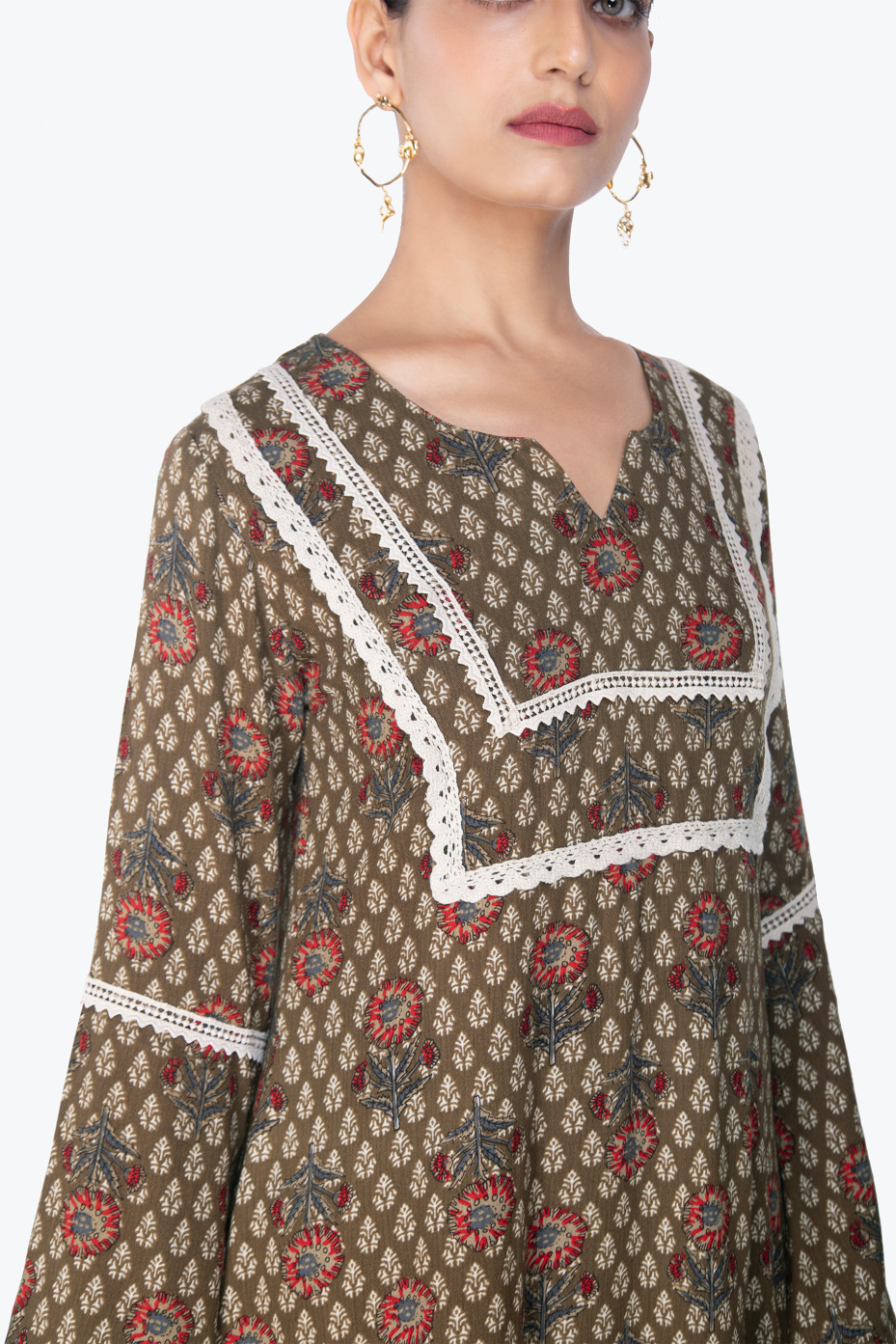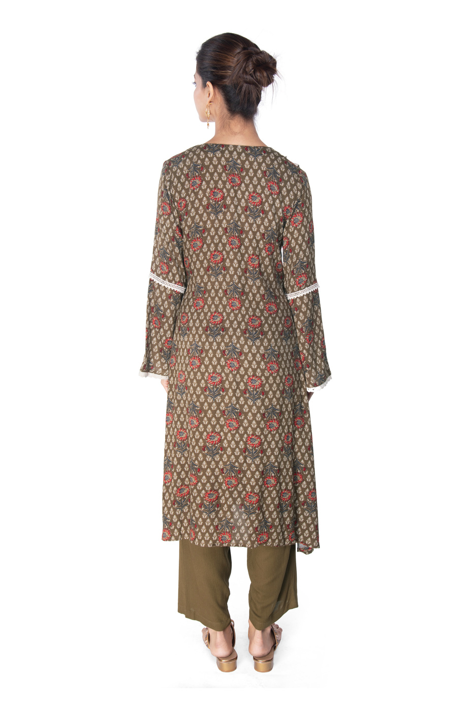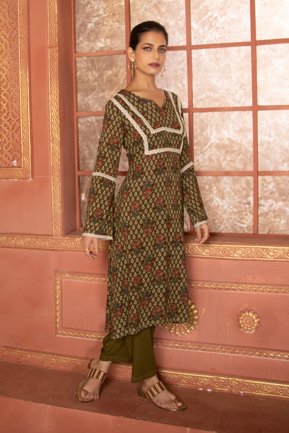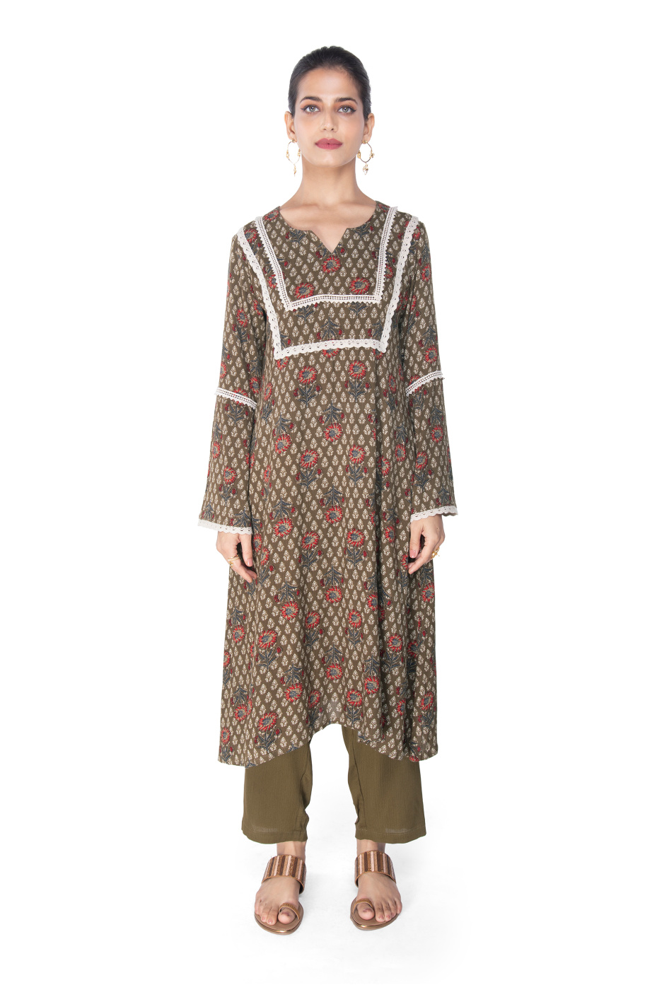 sGreen Ethnic Viscose Lace Detail Kurta Set
