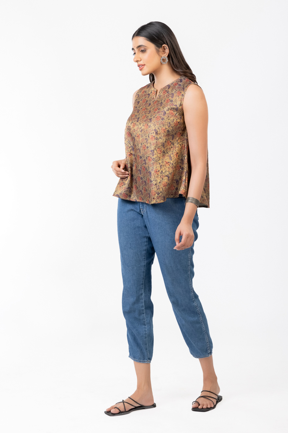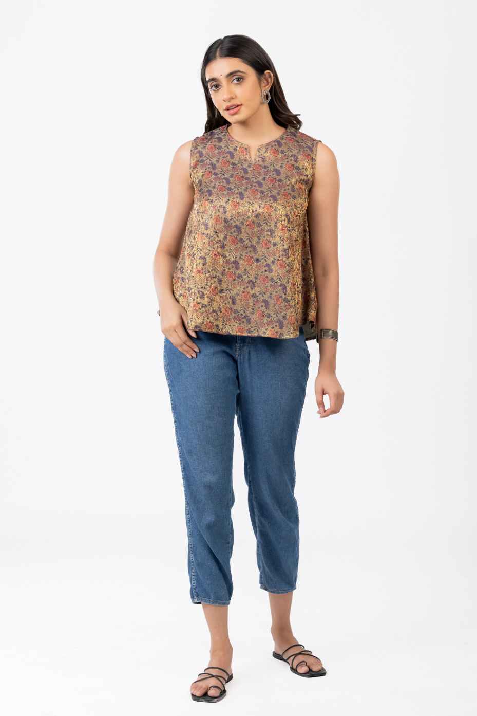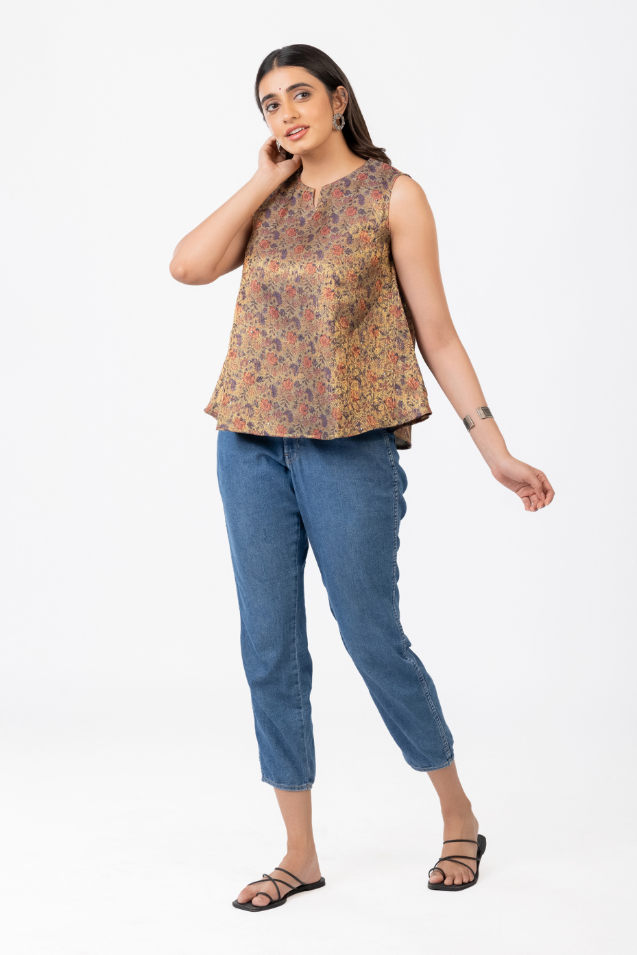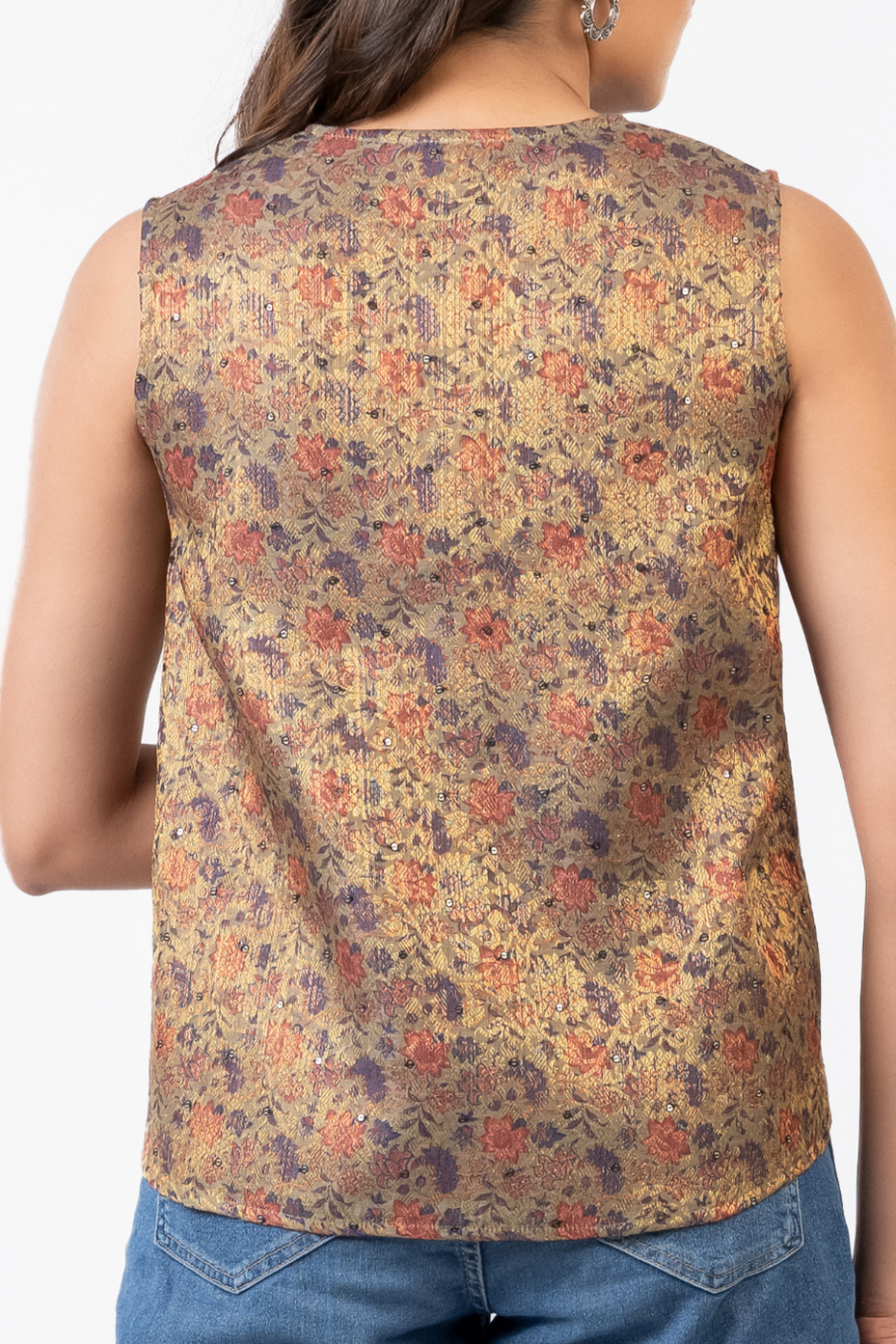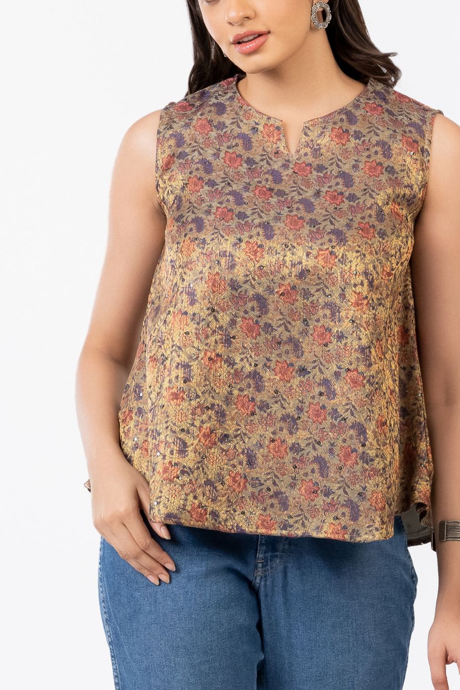 This paneled A-line top features, beautiful woven green and gold thread, which is sophisticatedly crafted in jacquard fabric to add extra glam to your occasional wear. It is highlighted with gold embellishment on the neckline and hem.